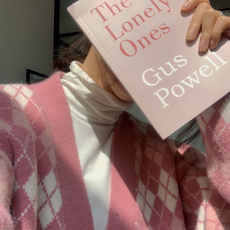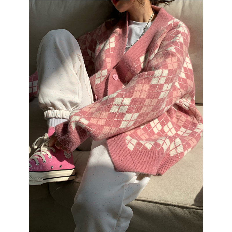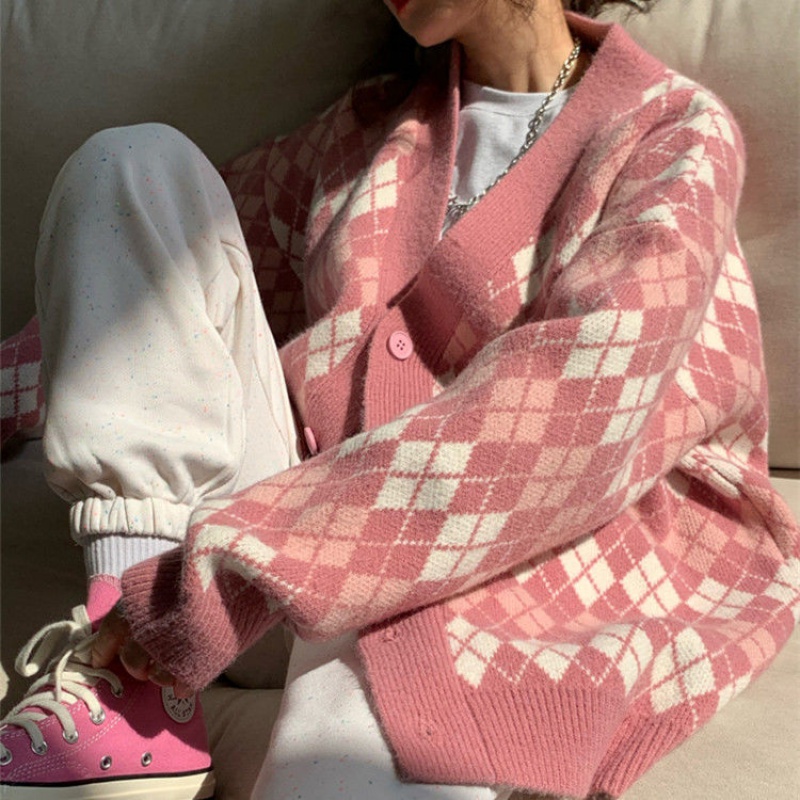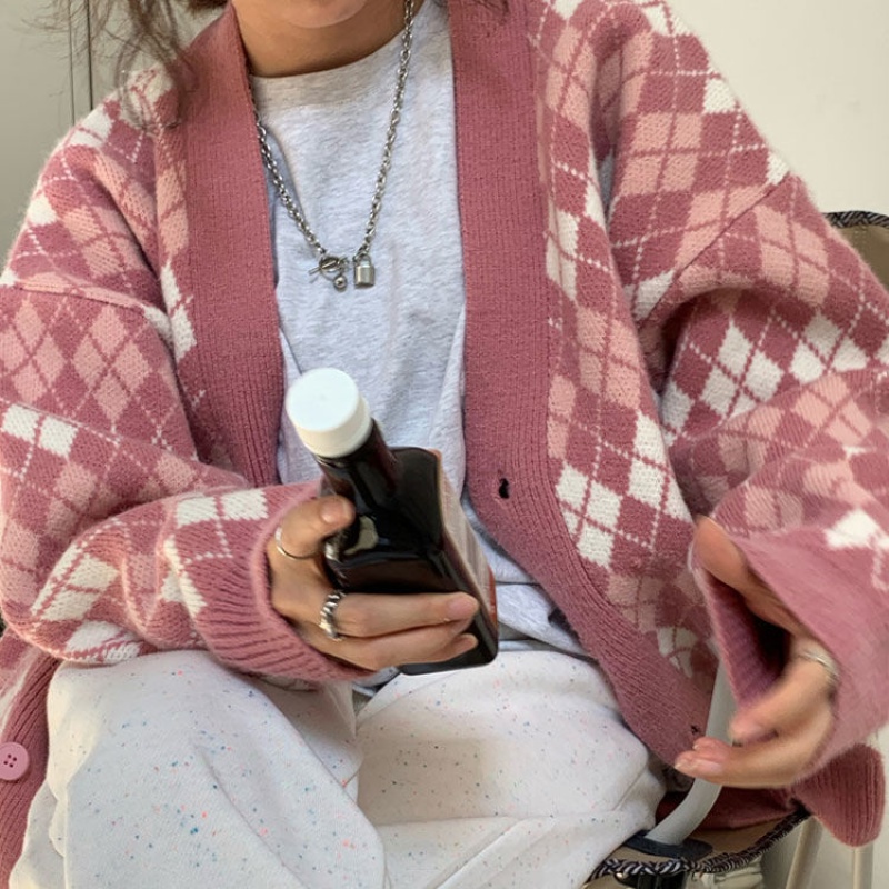 格纹撞色毛衣宽松外套2021新复古港味学院风针织开衫女春秋