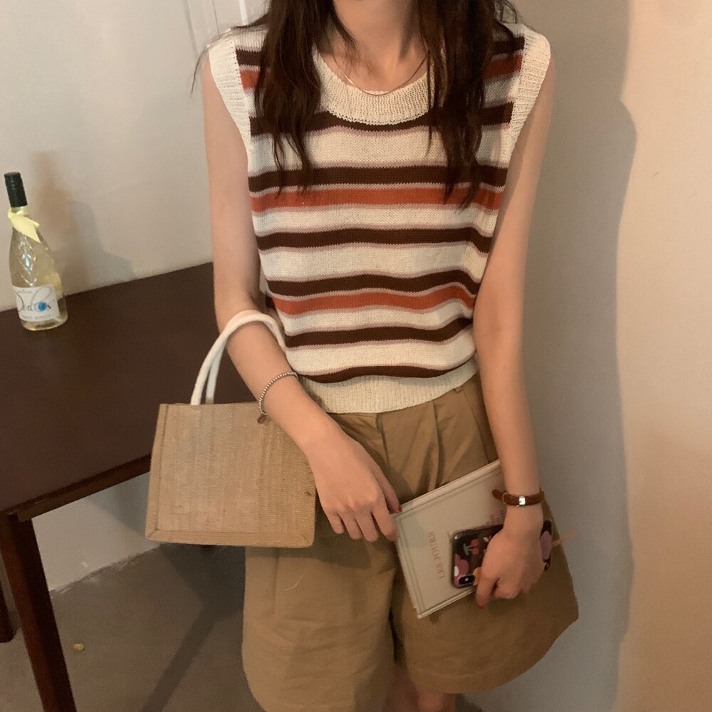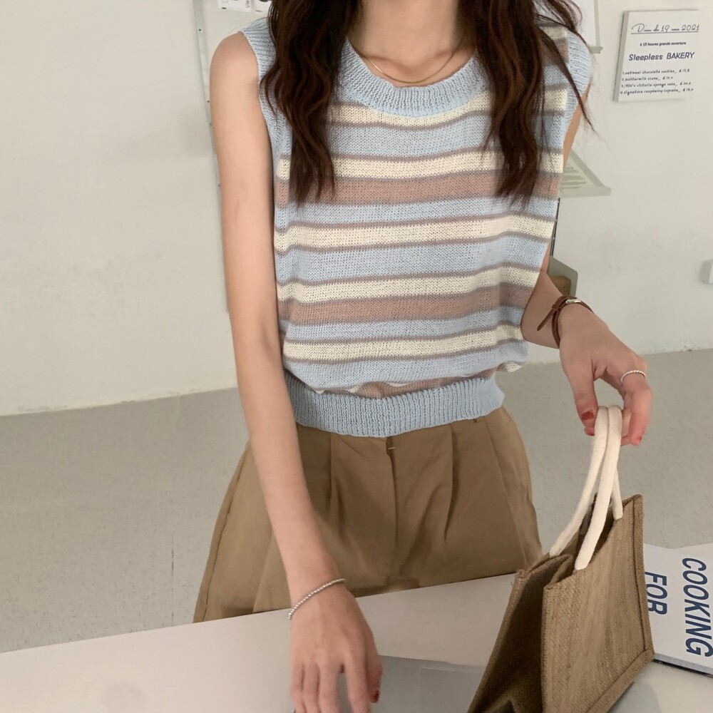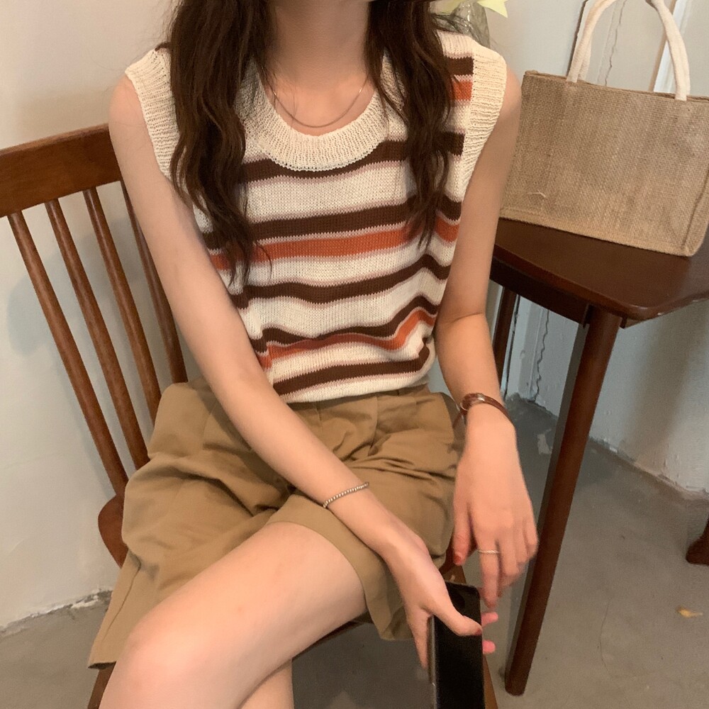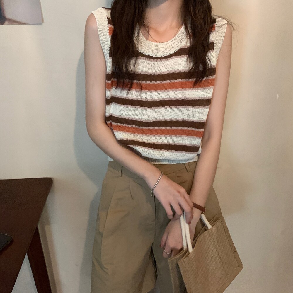 实拍实价~chic韩风复古条纹撞色薄款针织背心毛衣女潮