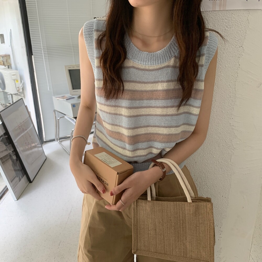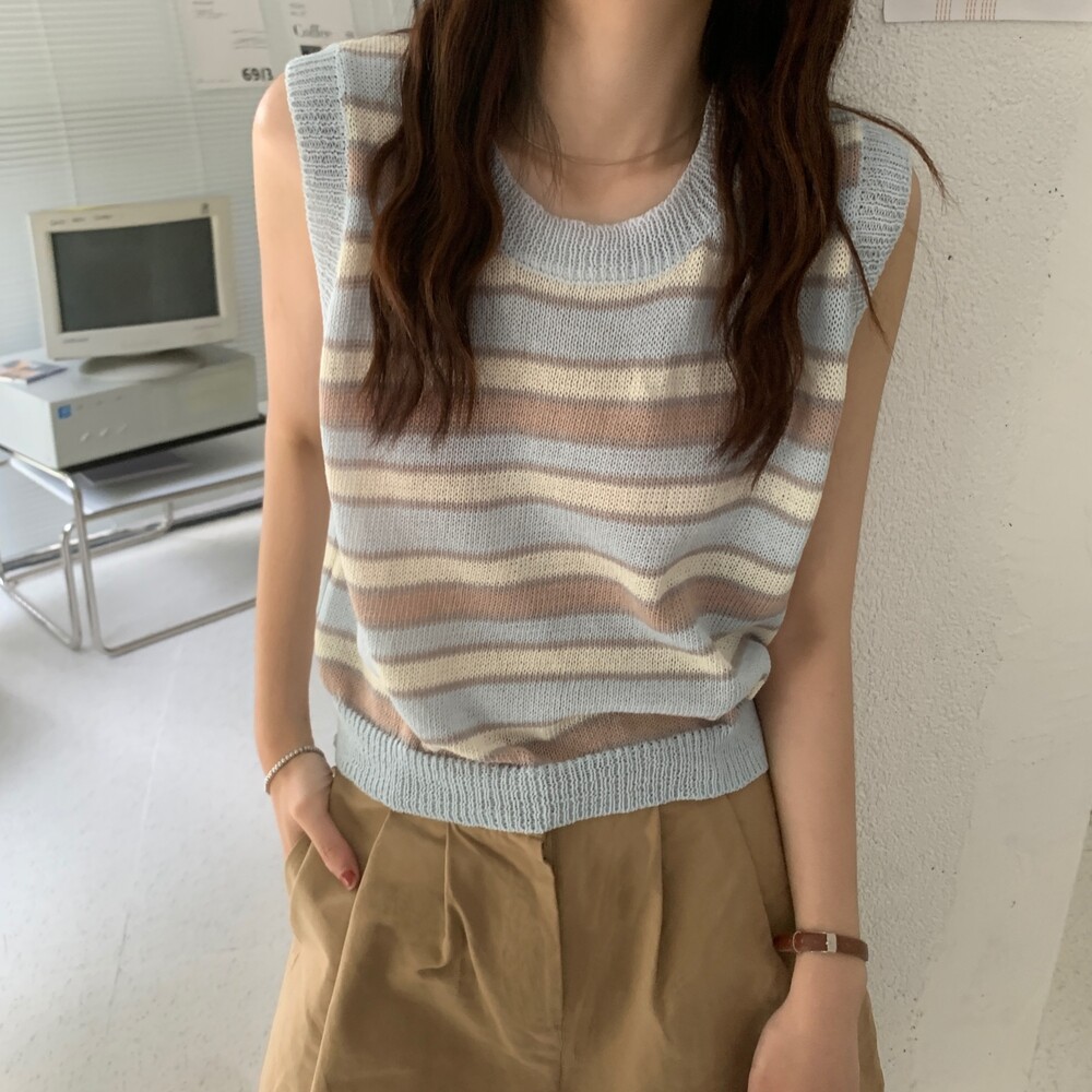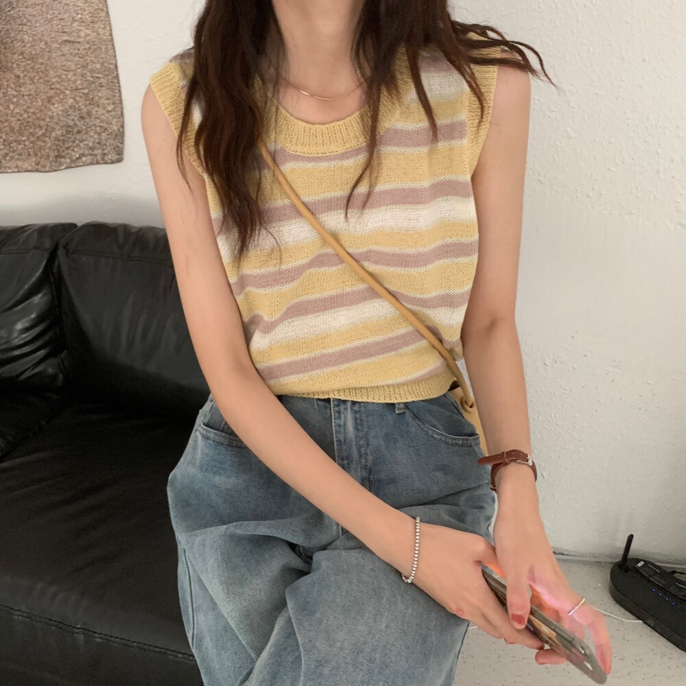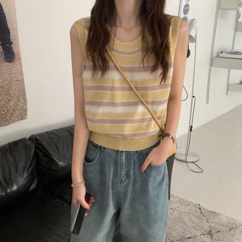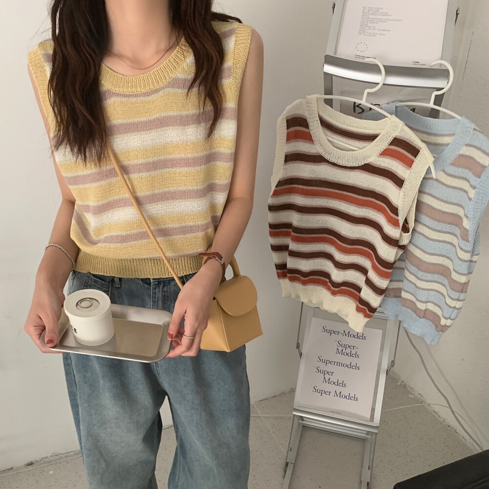 实拍实价~chic韩风复古条纹撞色薄款针织背心毛衣女潮