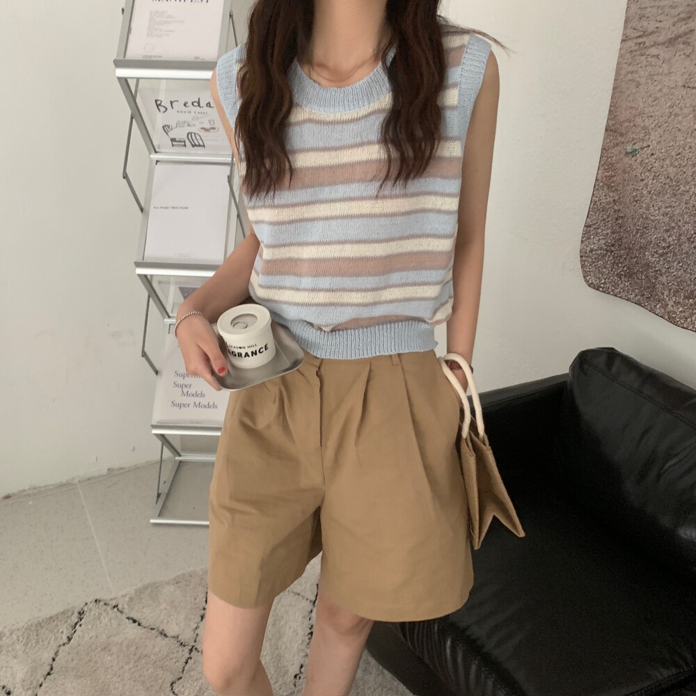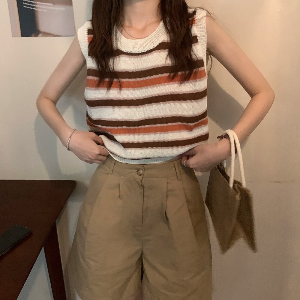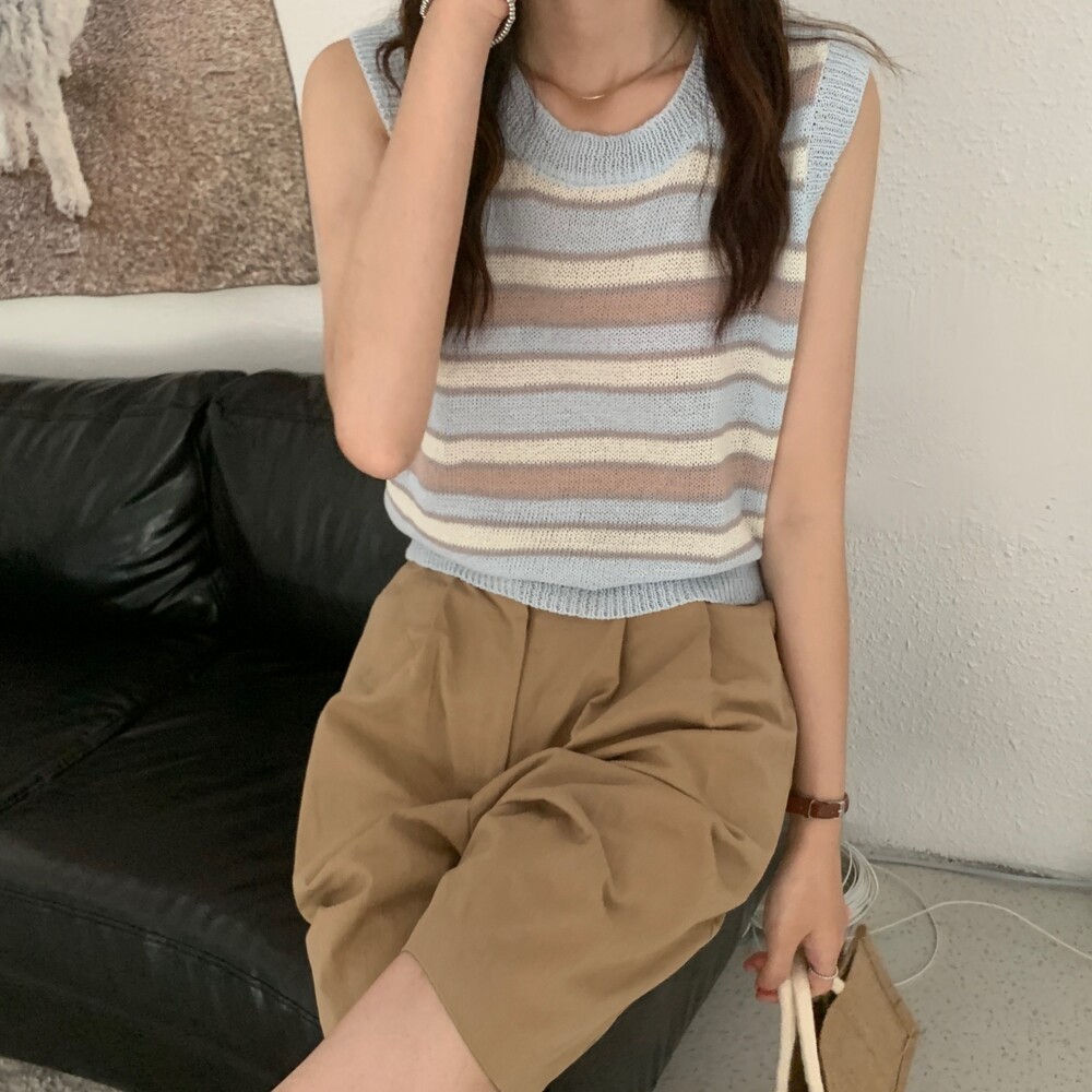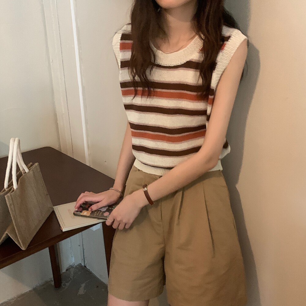 实拍实价~chic韩风复古条纹撞色薄款针织背心毛衣女潮