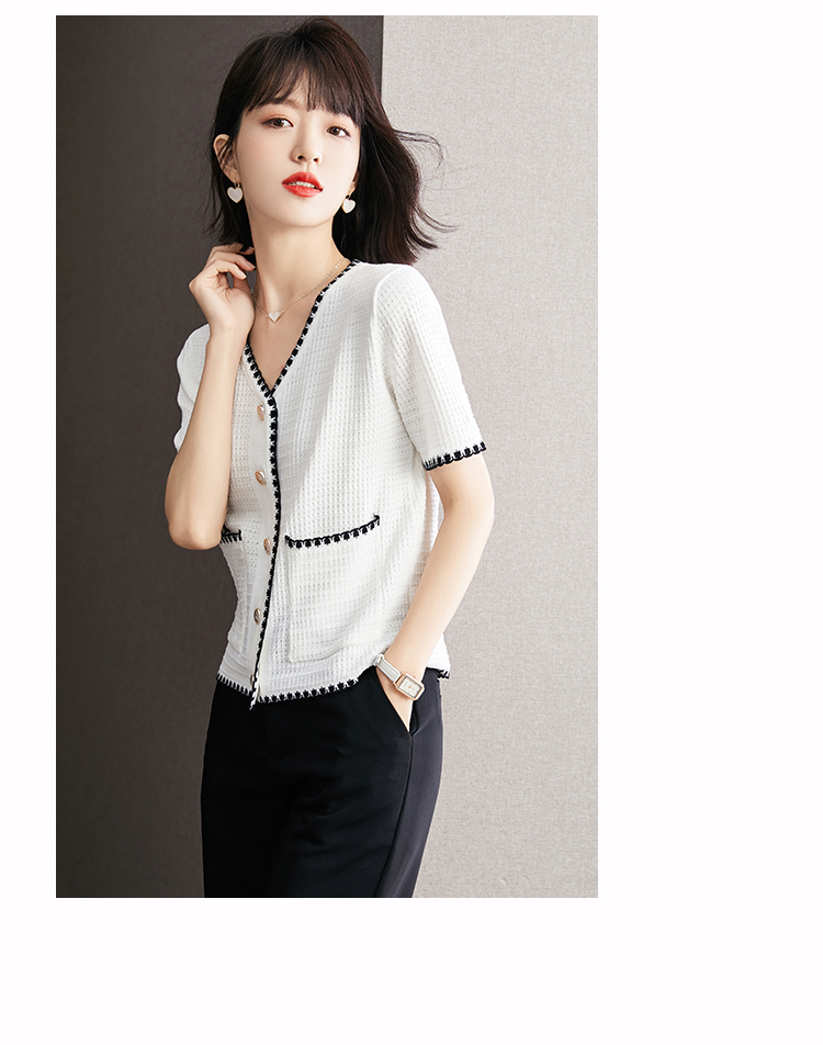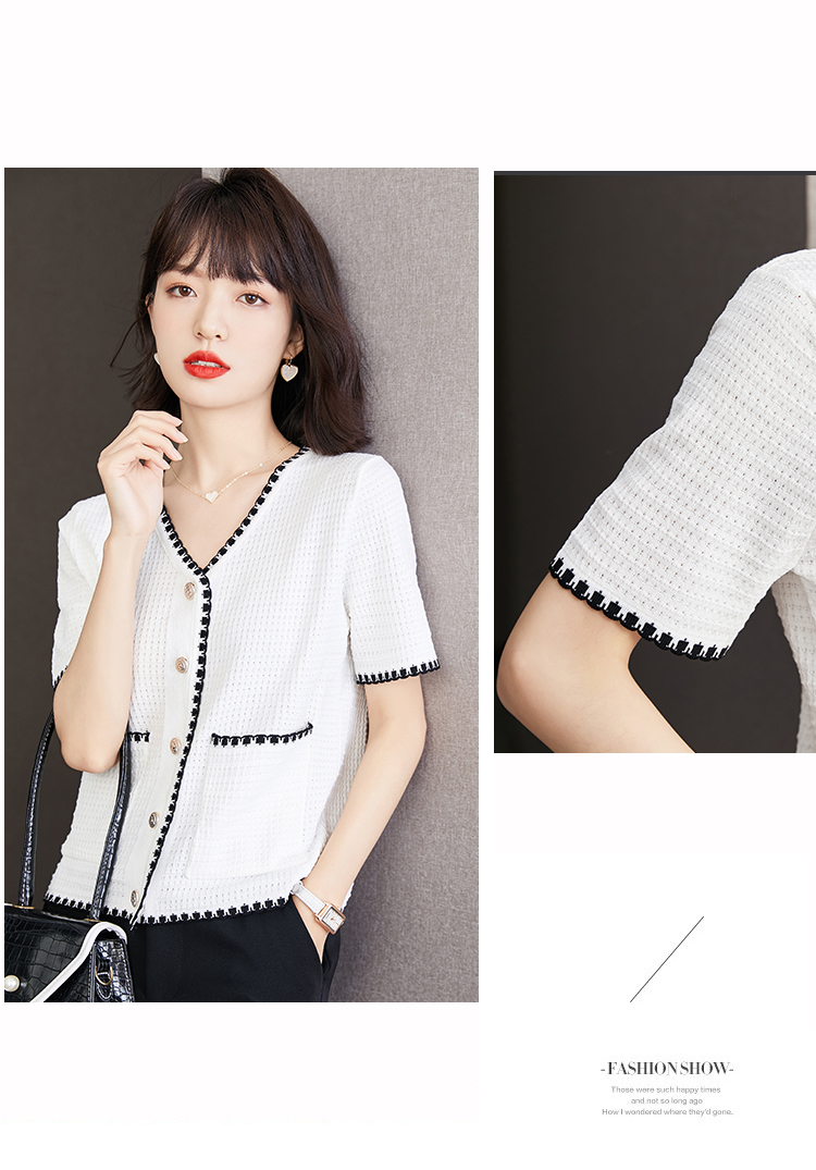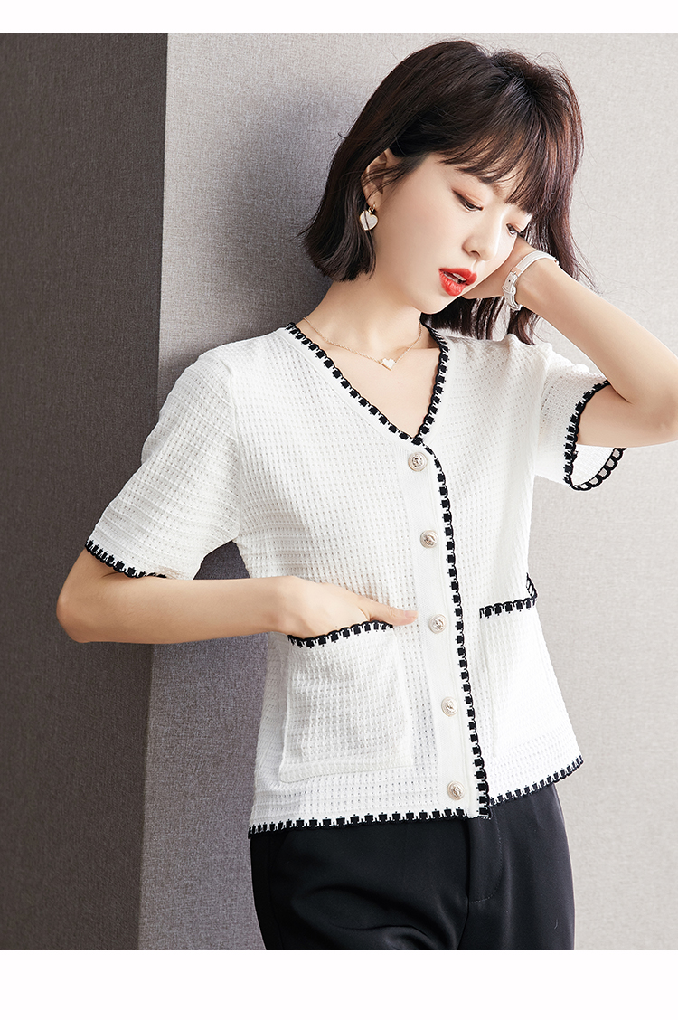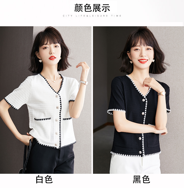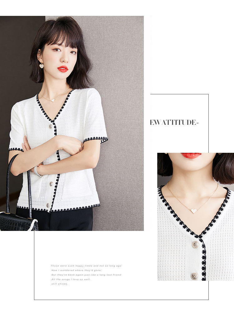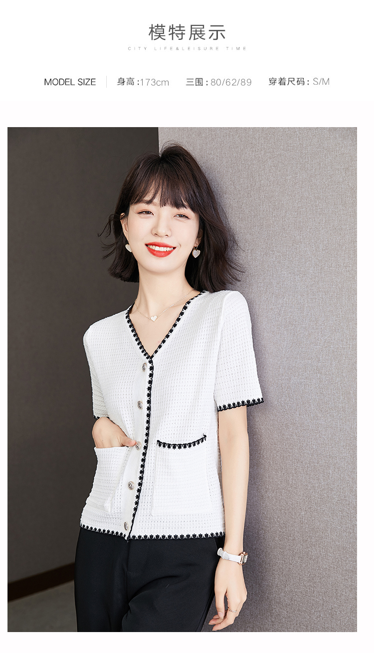 实拍#赫本小香风上衣白色t恤2021年新款开衫短款V领冰丝针织衫