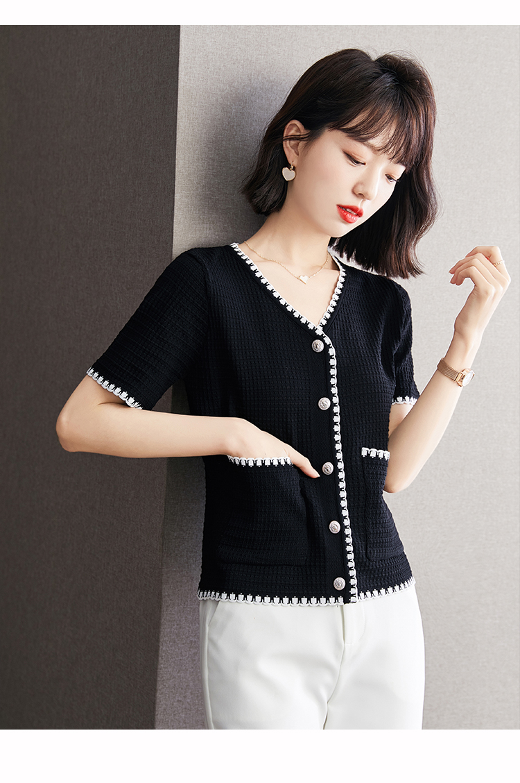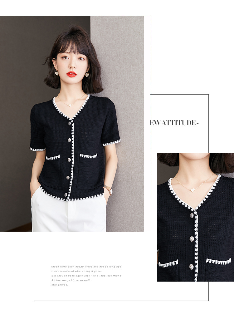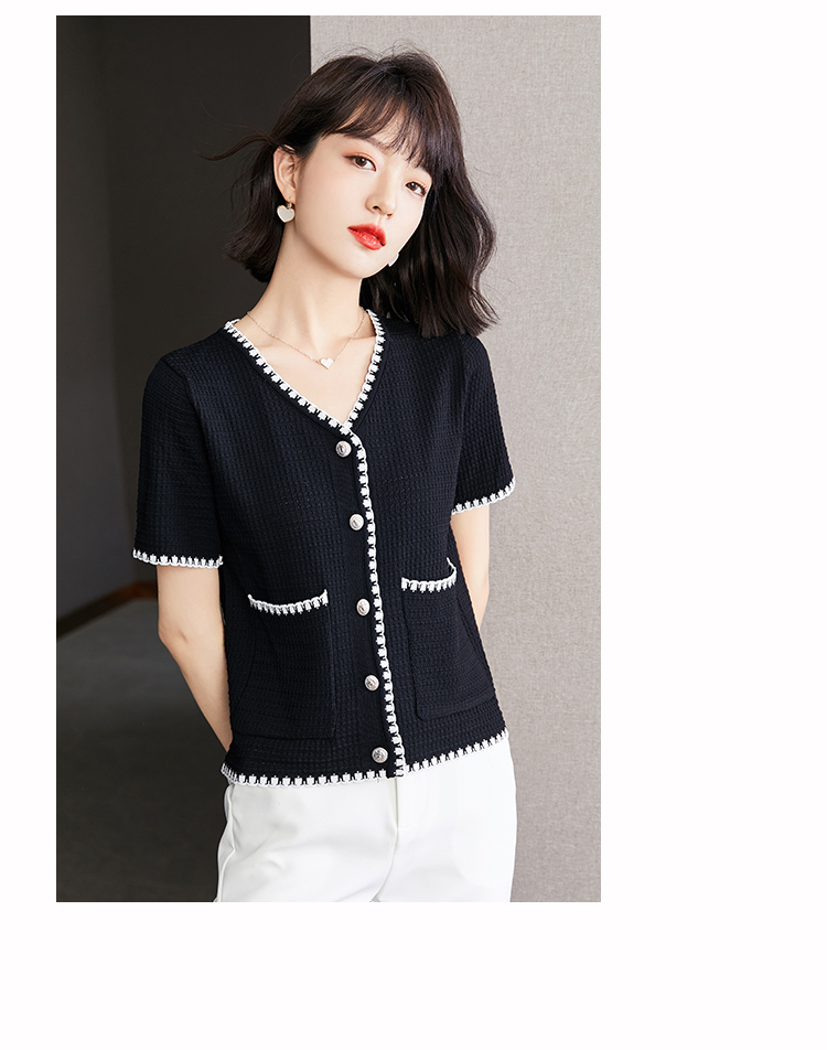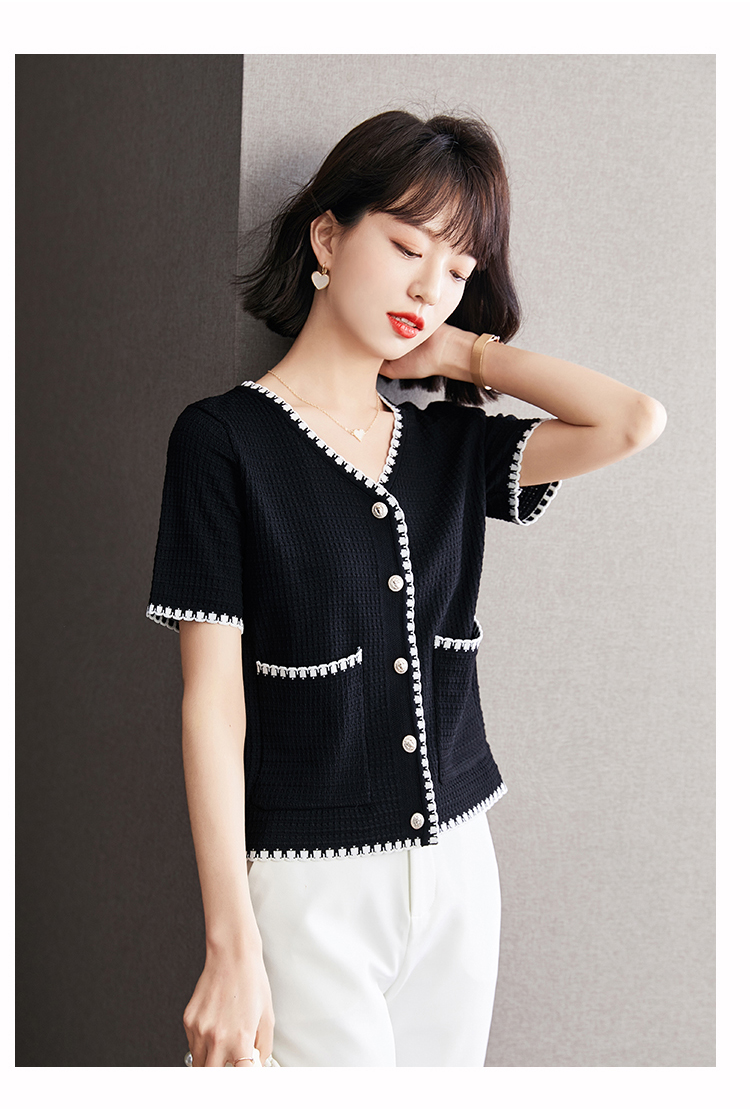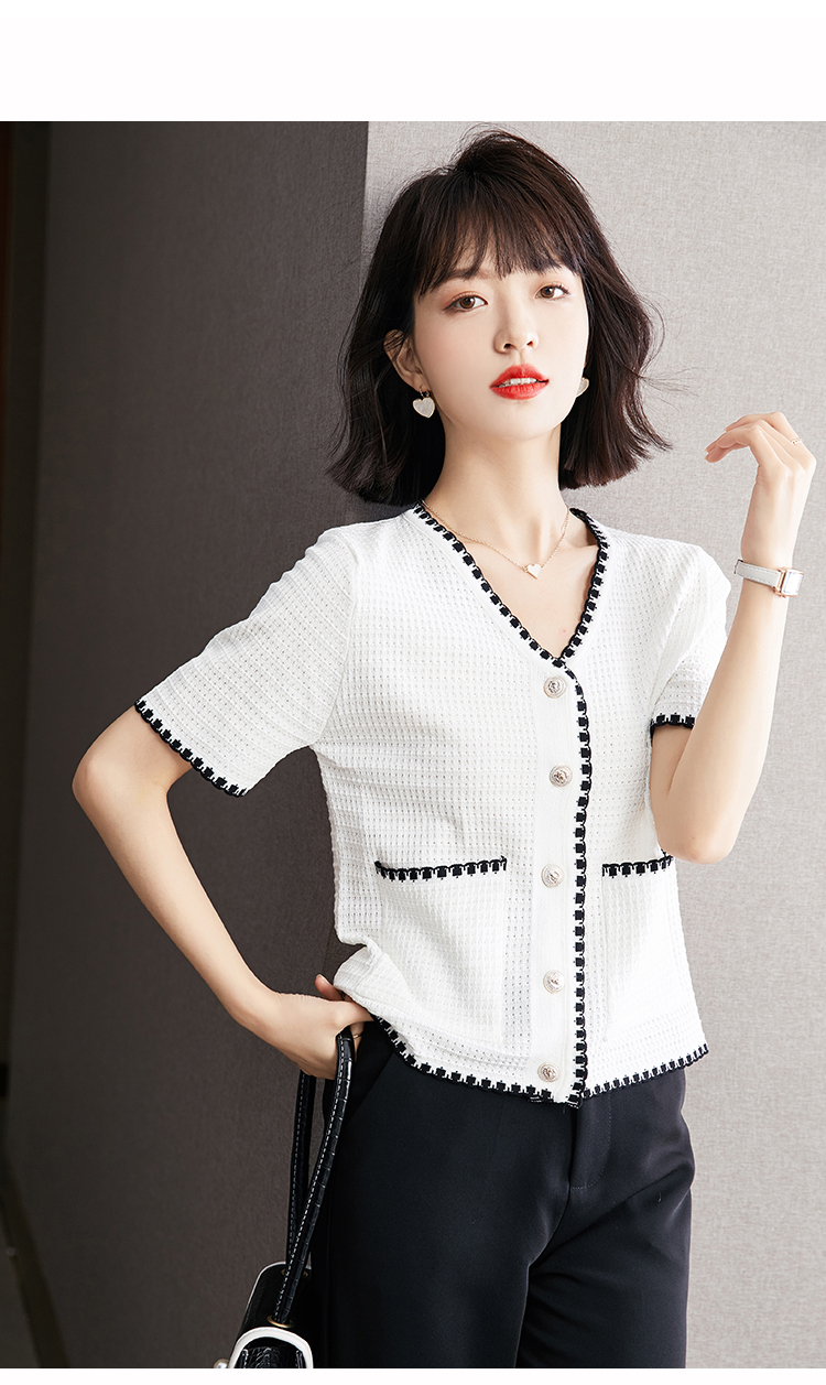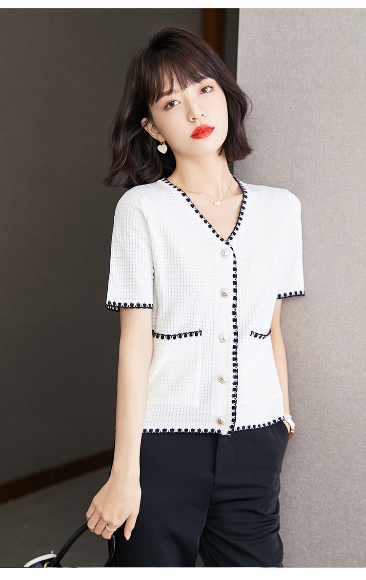 实拍#赫本小香风上衣白色t恤2021年新款开衫短款V领冰丝针织衫