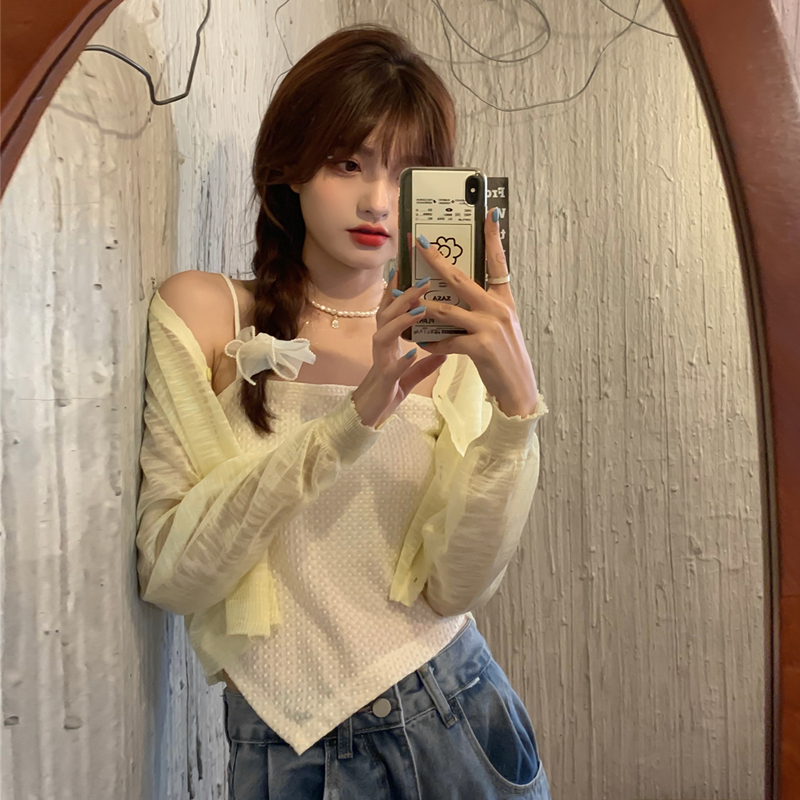 开衫:衣长41 胸围85 袖长58 肩宽36 吊带:衣长38(含肩带) 胸围80