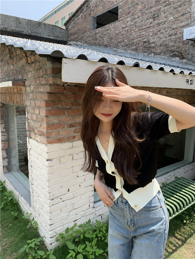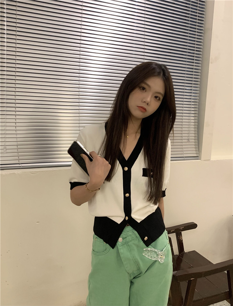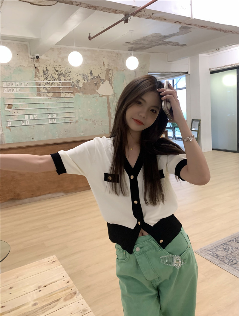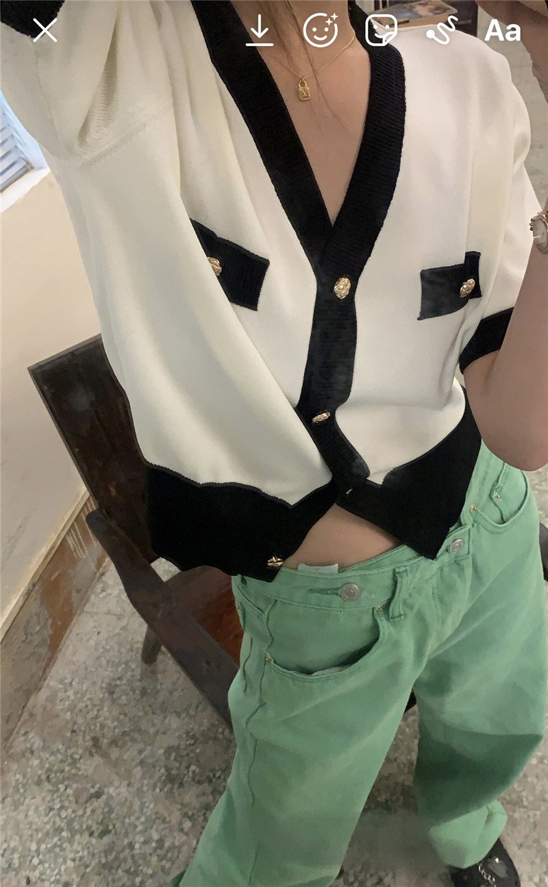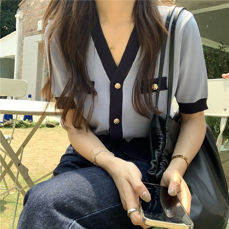 实价实拍 奶盐系显瘦V领香风拼色针织短袖上衣