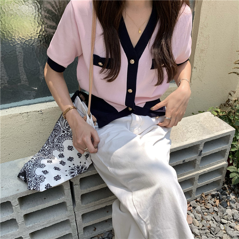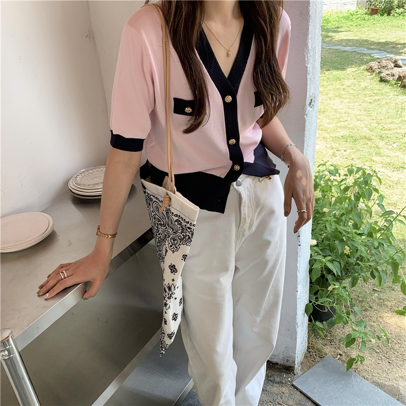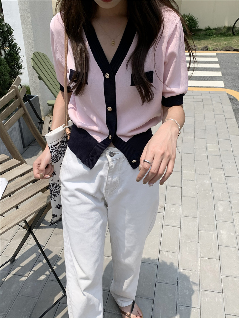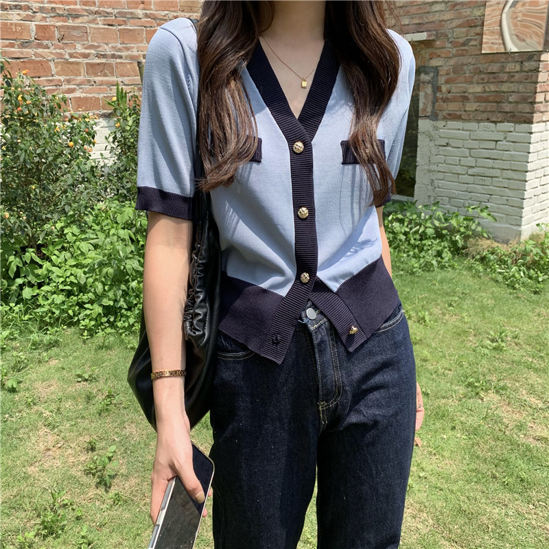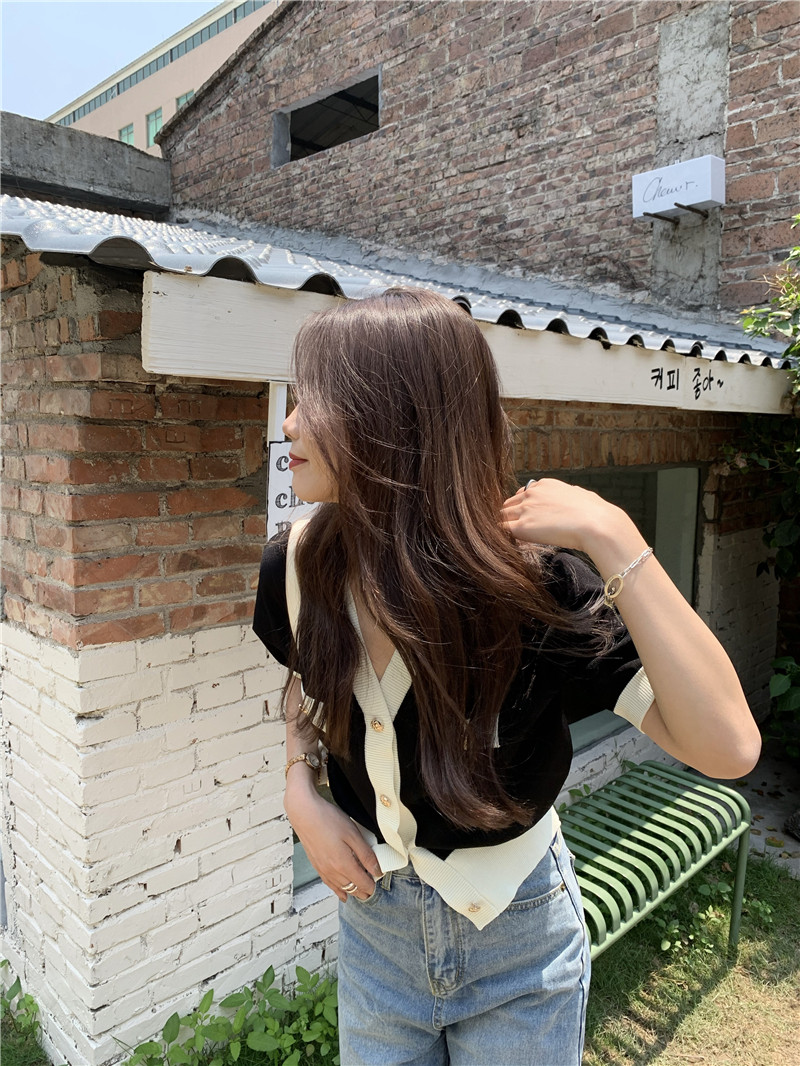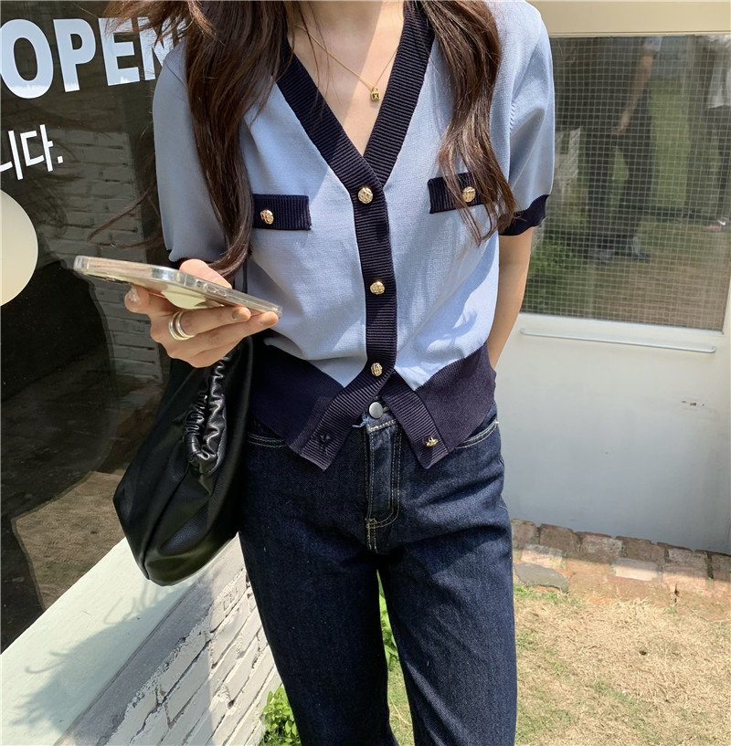 实价实拍 奶盐系显瘦V领香风拼色针织短袖上衣