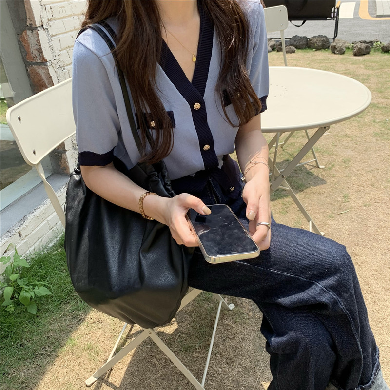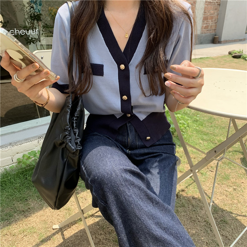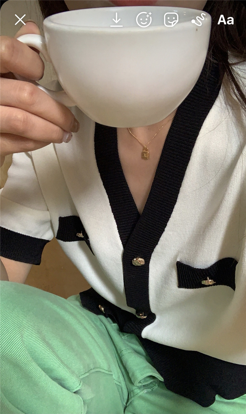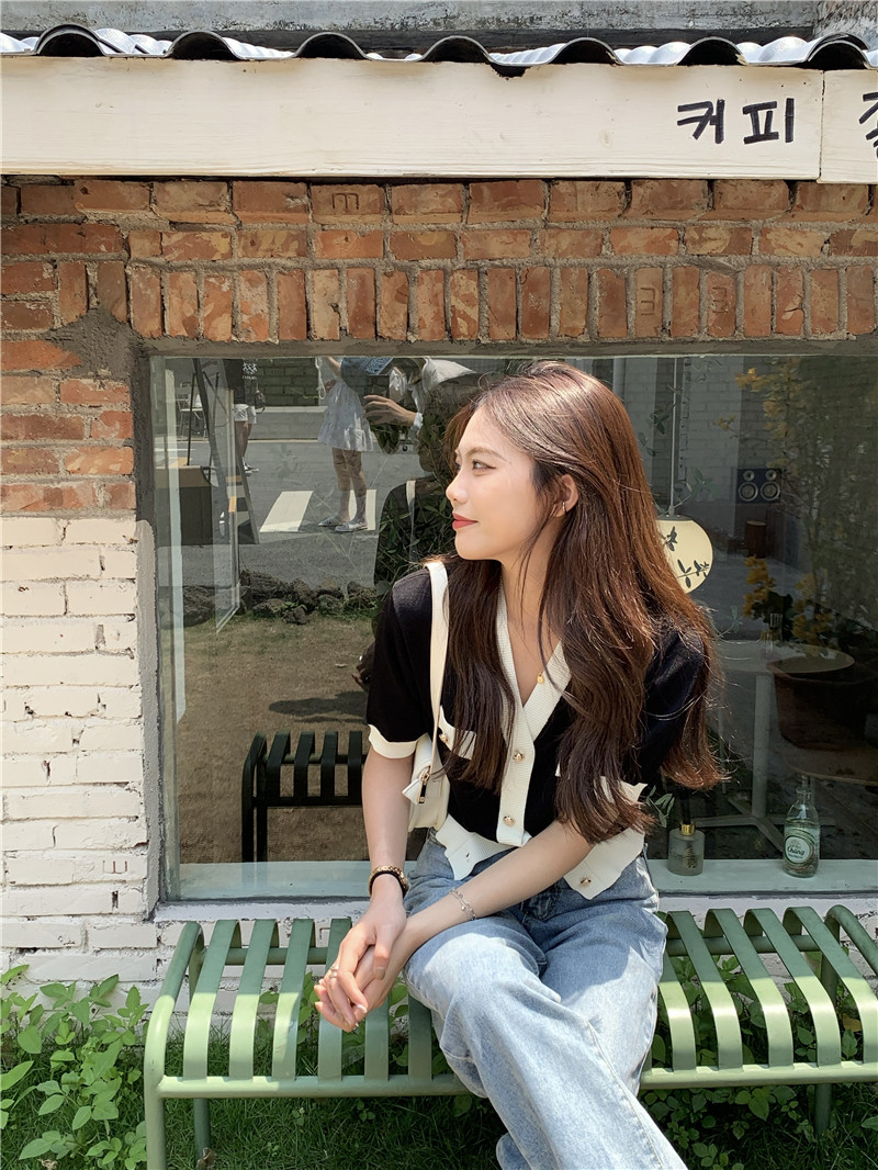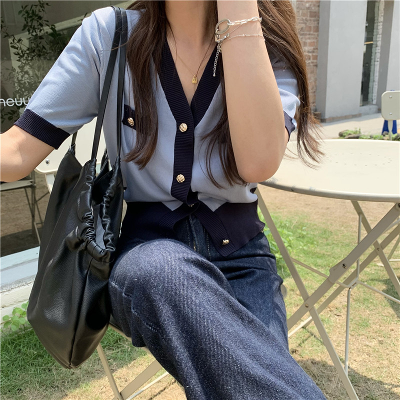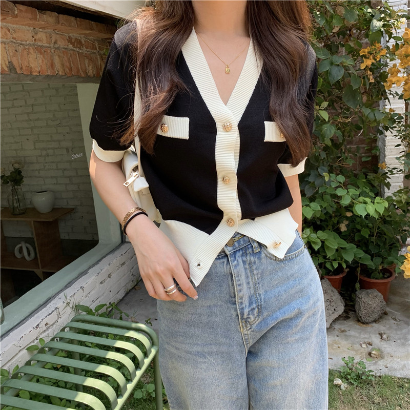 实价实拍 奶盐系显瘦V领香风拼色针织短袖上衣