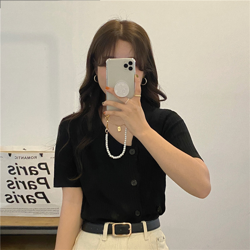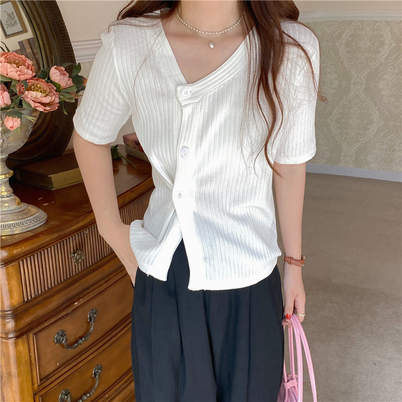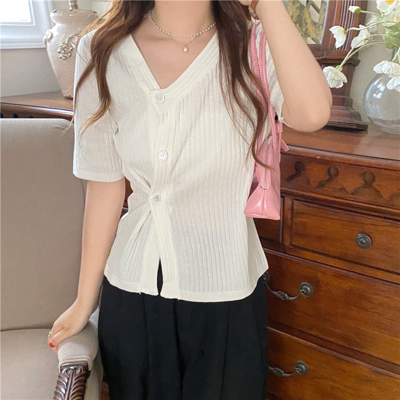 实拍实价 韩版冰丝针织开衫女薄款短袖侧边扣设计感v领修身上衣