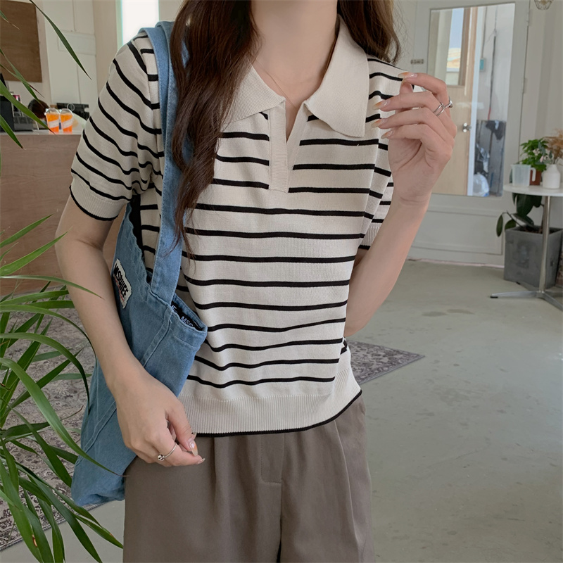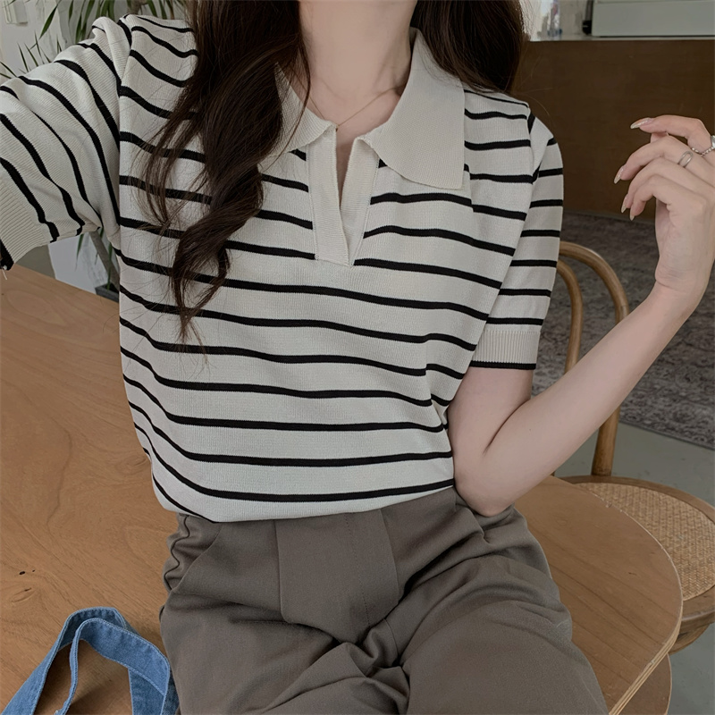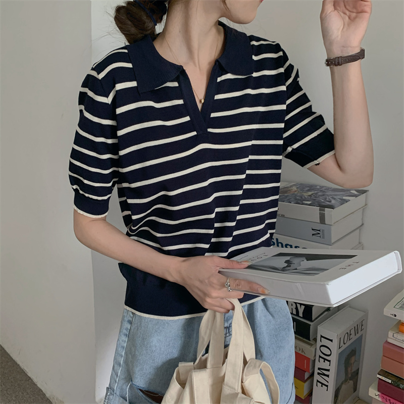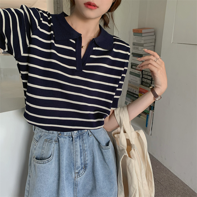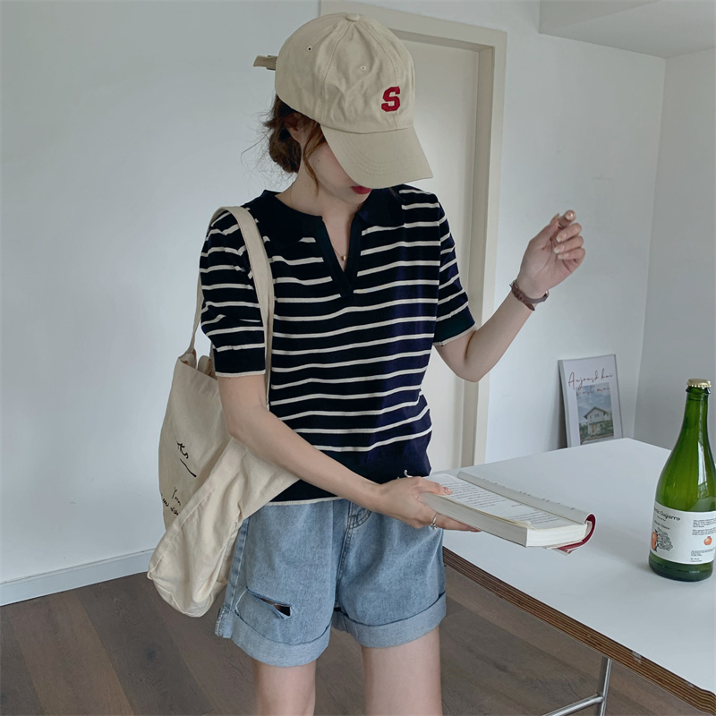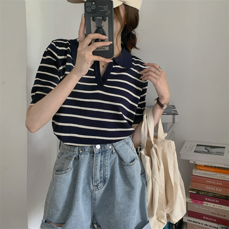实拍实价 夏季宽松V领小心机冰丝条纹针织衫polo领上衣