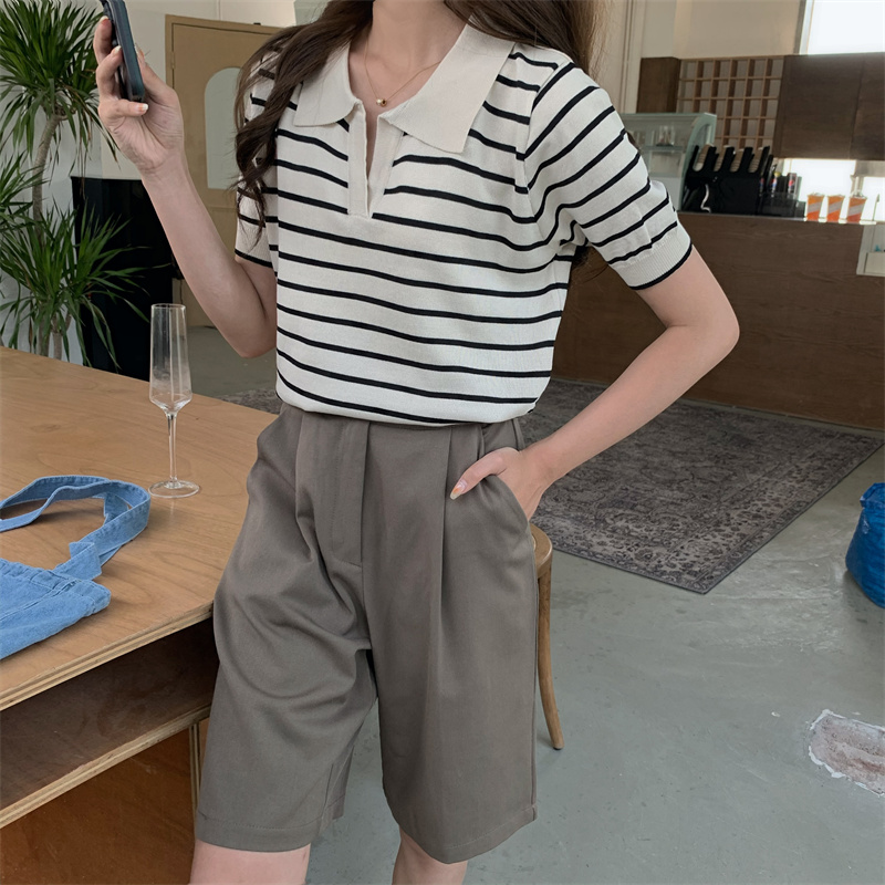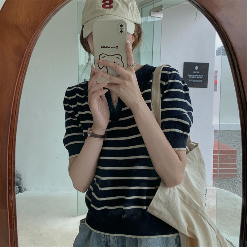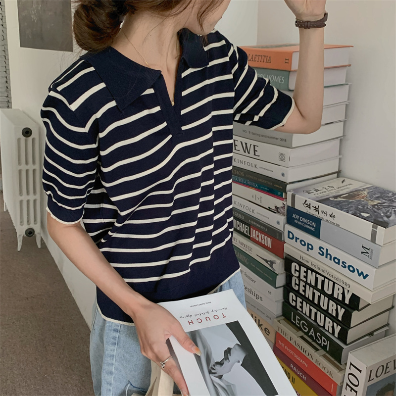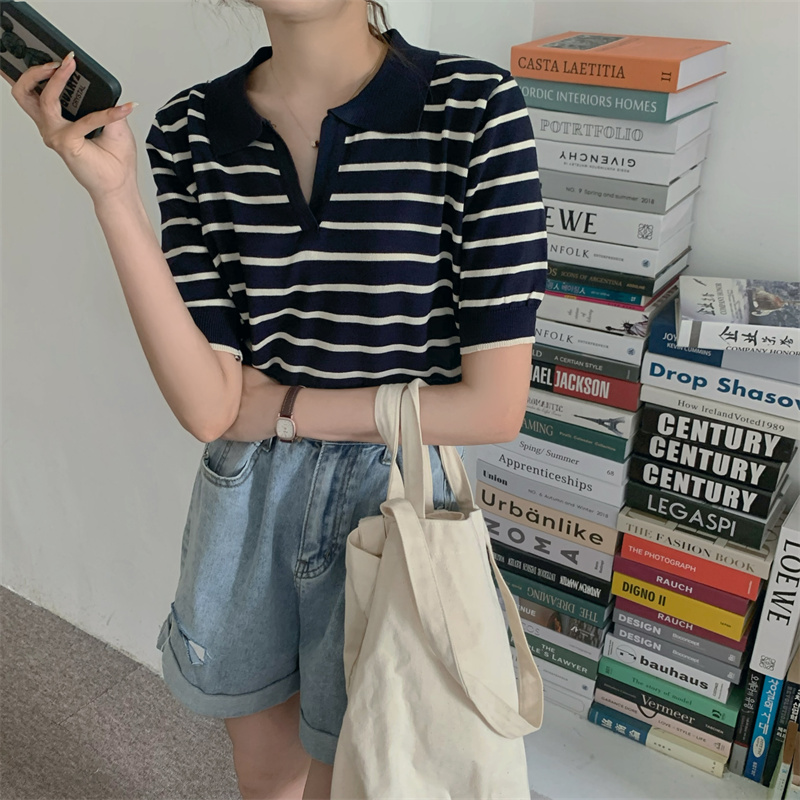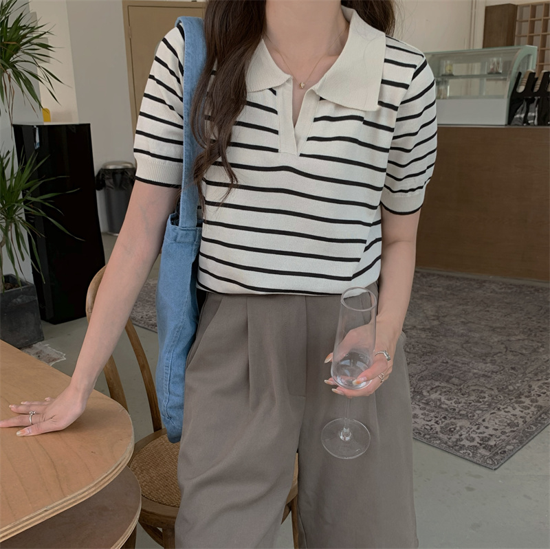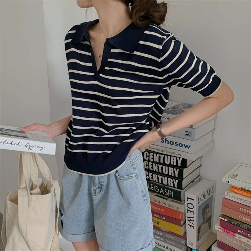 实拍实价 夏季宽松V领小心机冰丝条纹针织衫polo领上衣