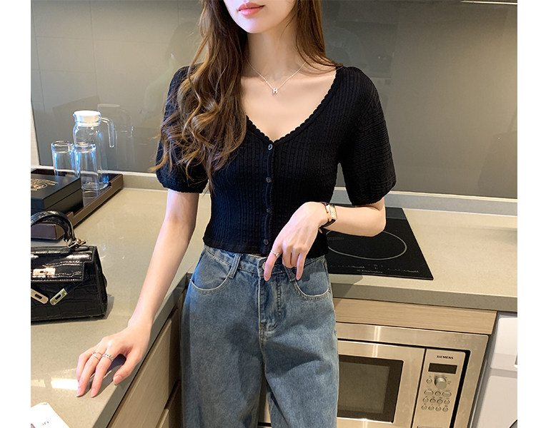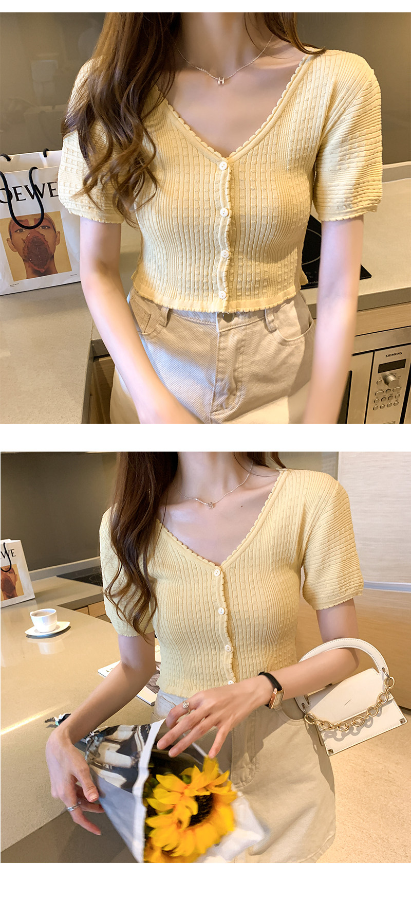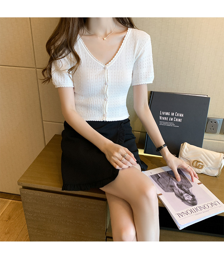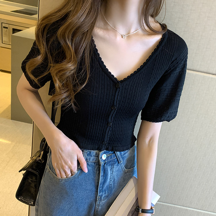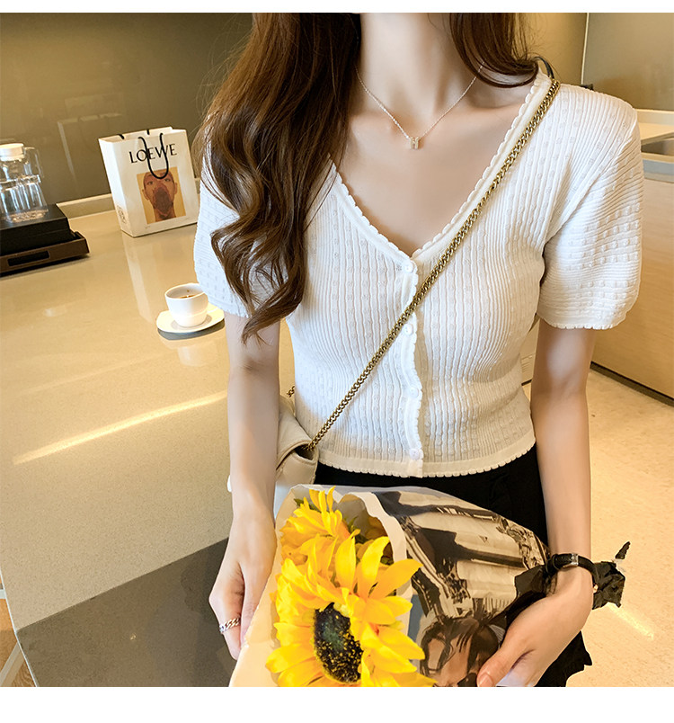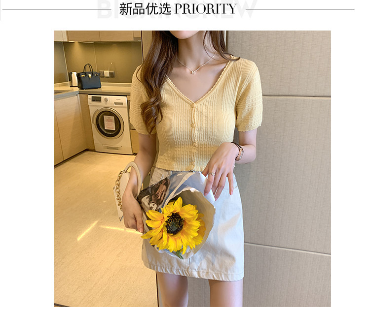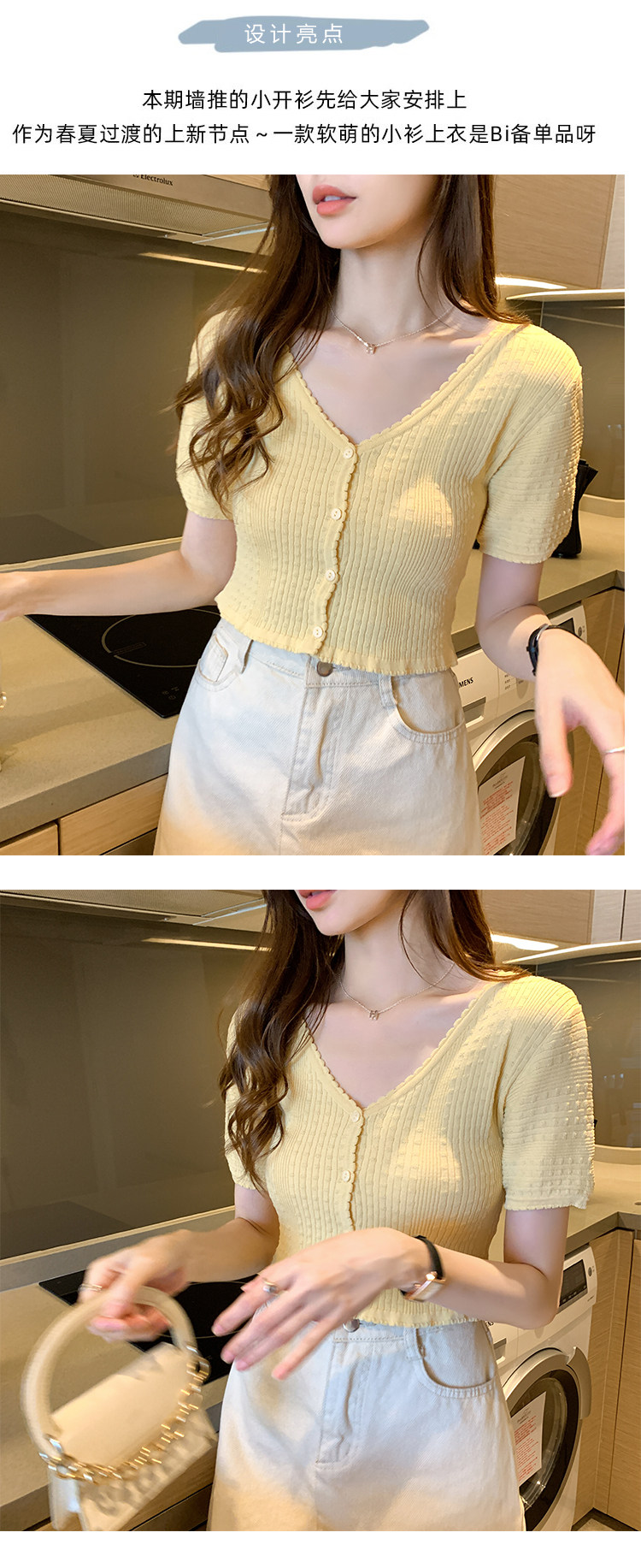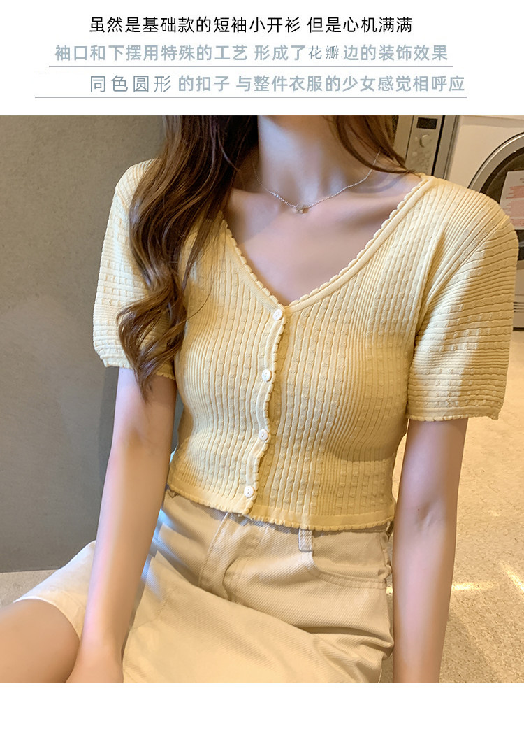 实拍2021春夏新款短袖薄针织小开衫女温柔风显瘦T恤短款高腰上衣