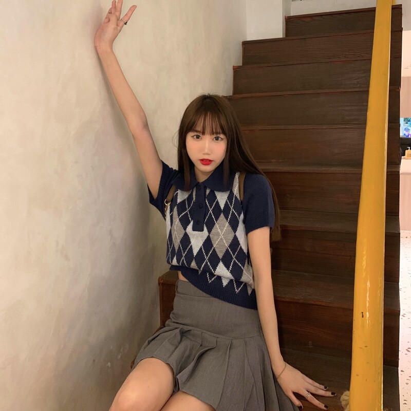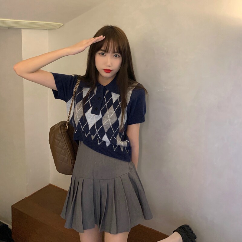 实拍#2021新款韩版菱格polo领针织衫薄款女短款撞色修身短袖上衣