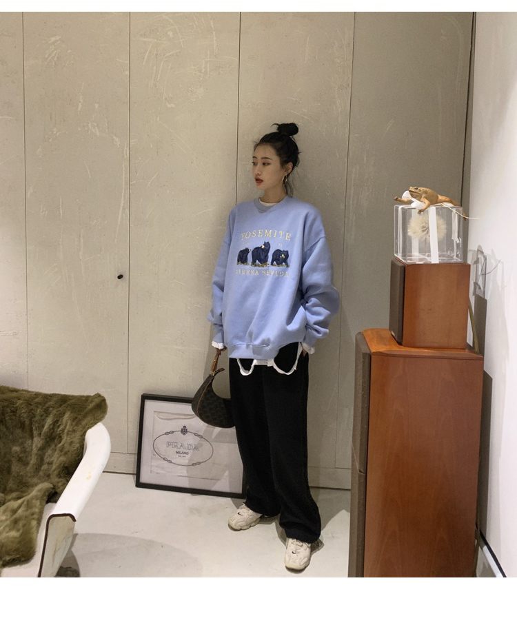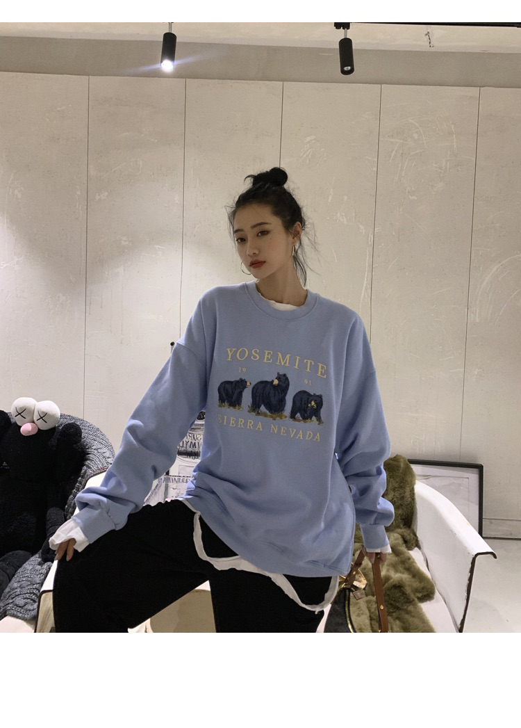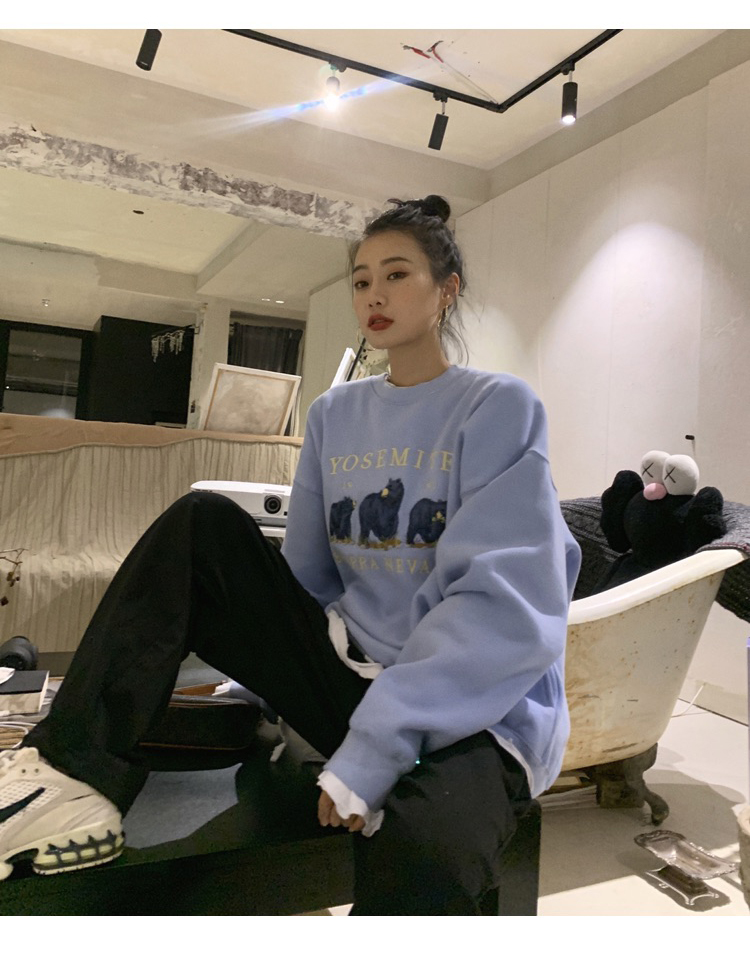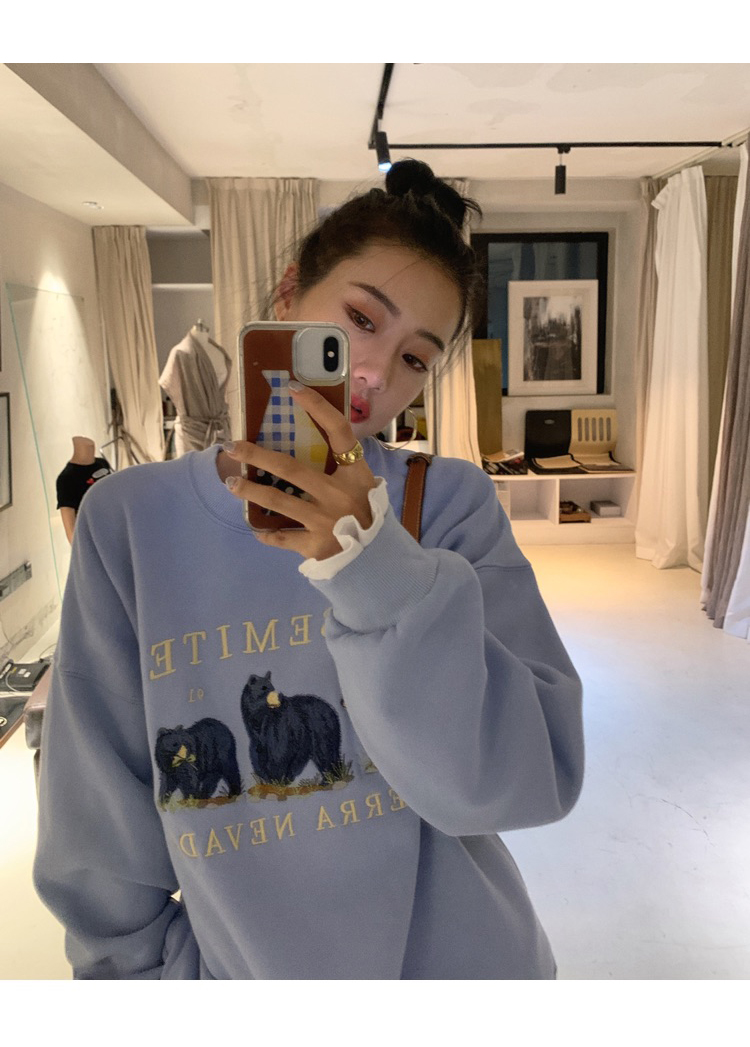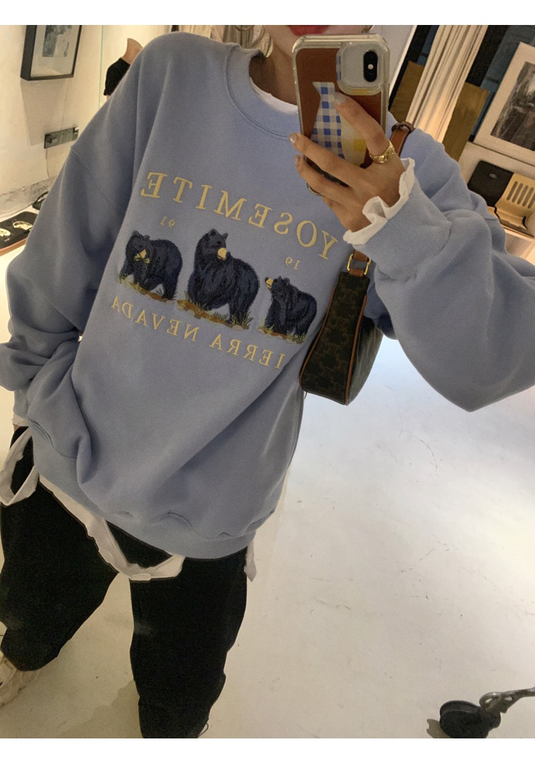 实拍 2020秋冬季新韩版加绒宽松刺绣圆领三只熊卡通卫衣女潮ins