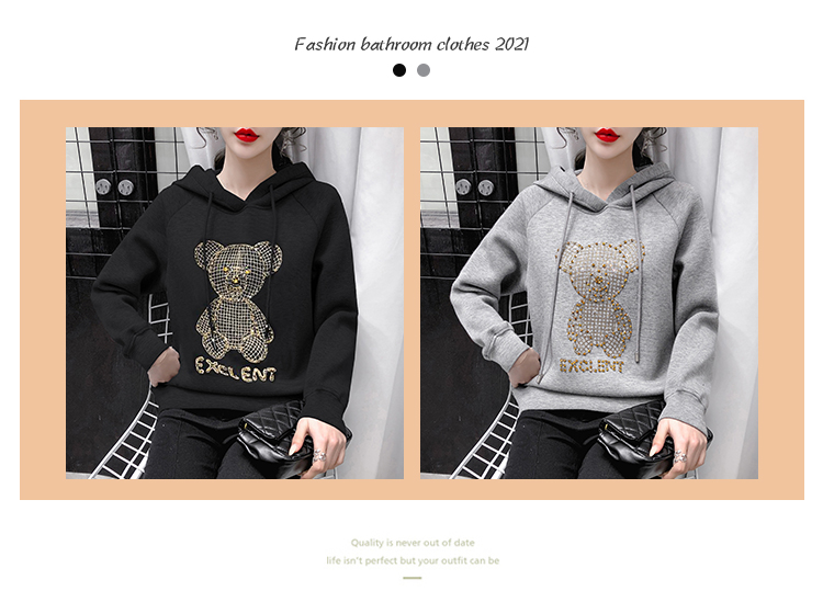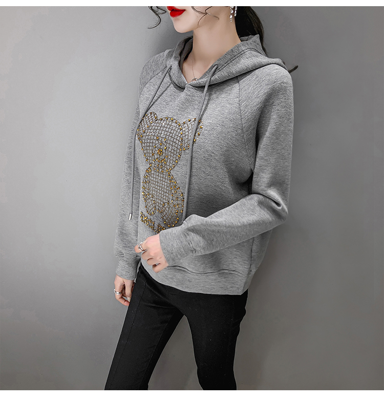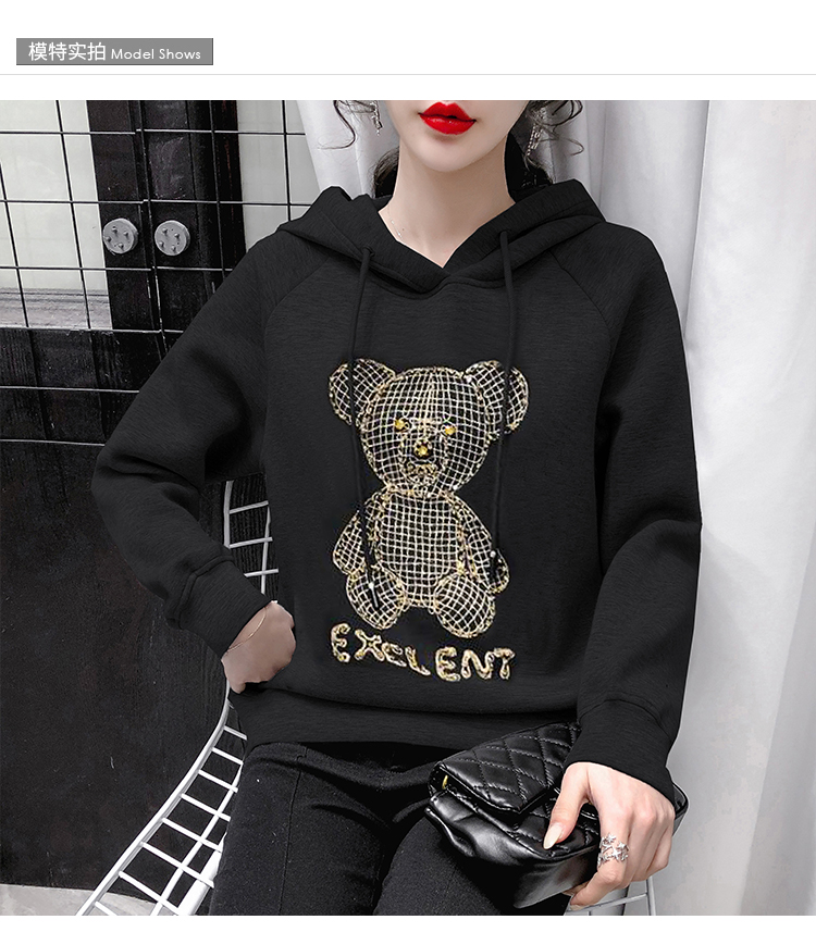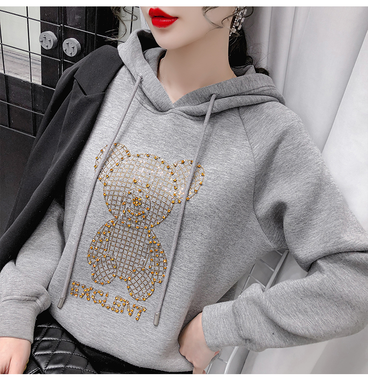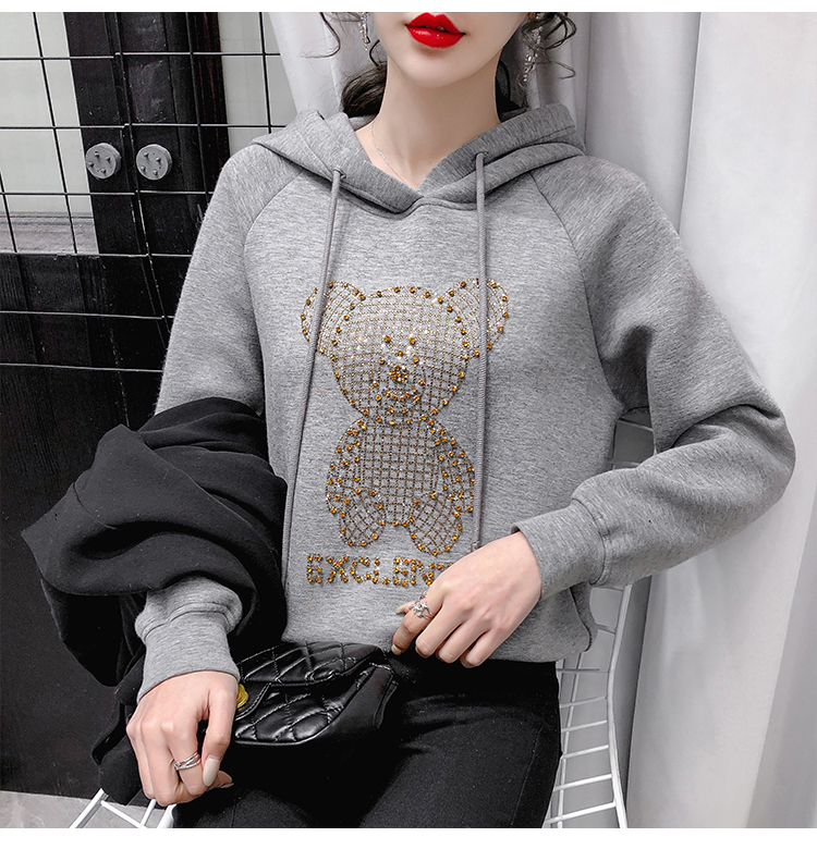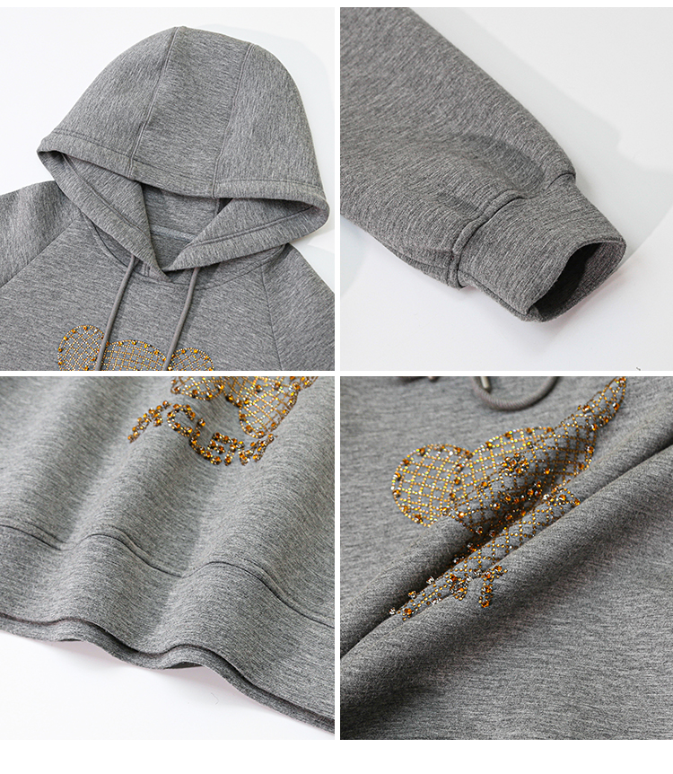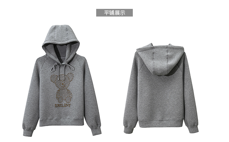 现货实拍 太空棉连帽卫衣女2021早春新款宽松短款重工镶钻上衣