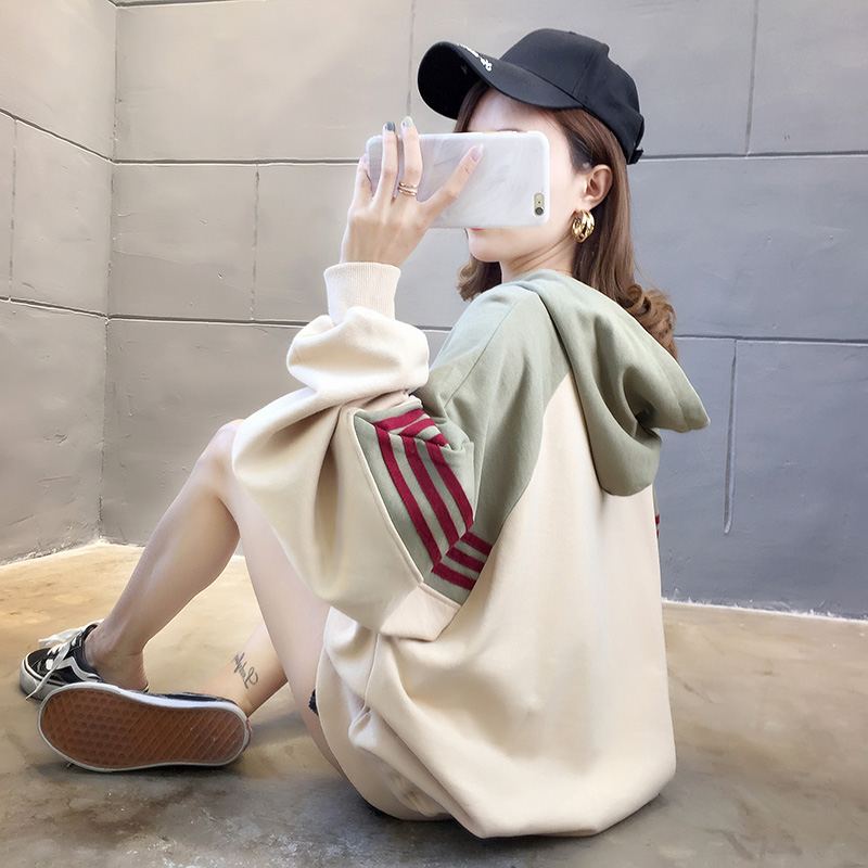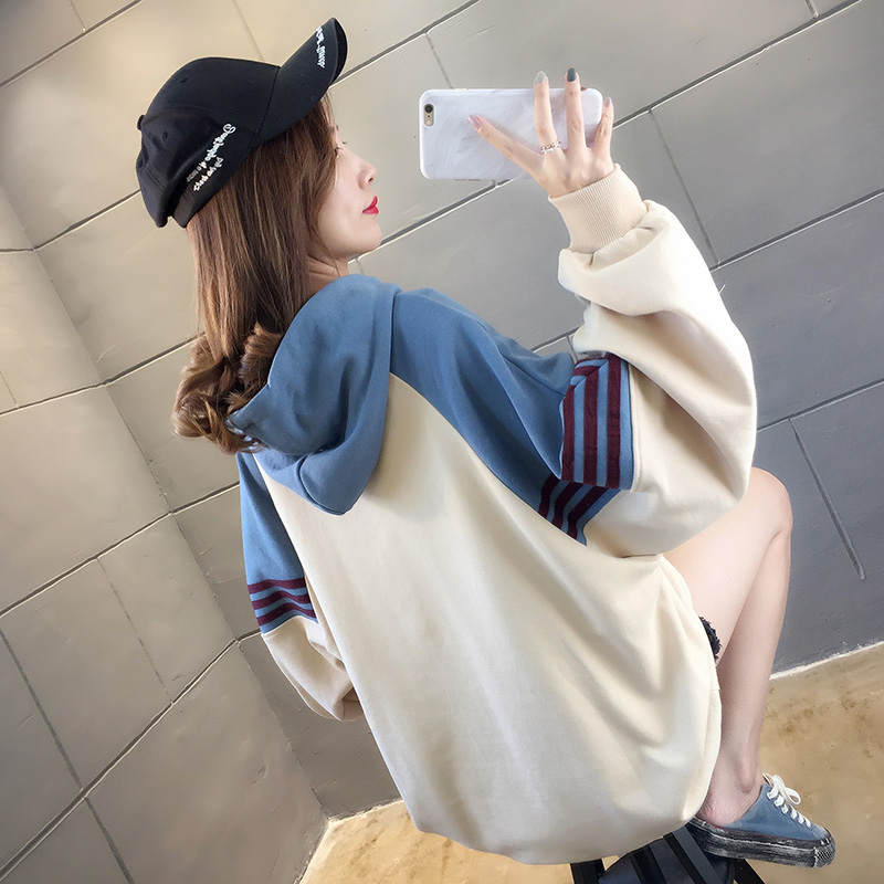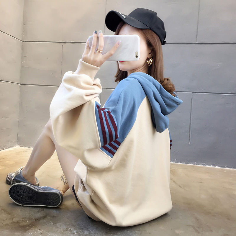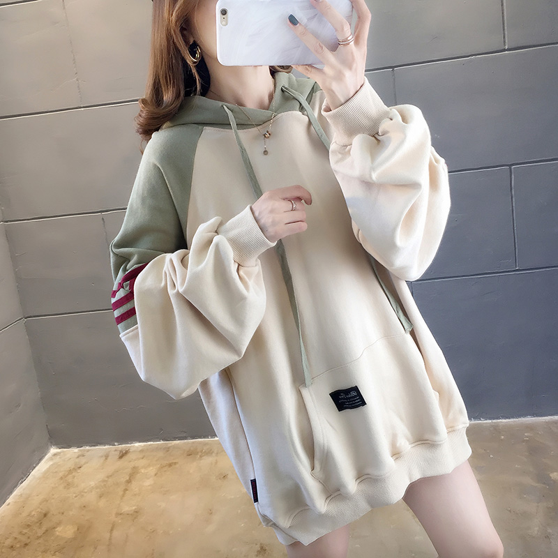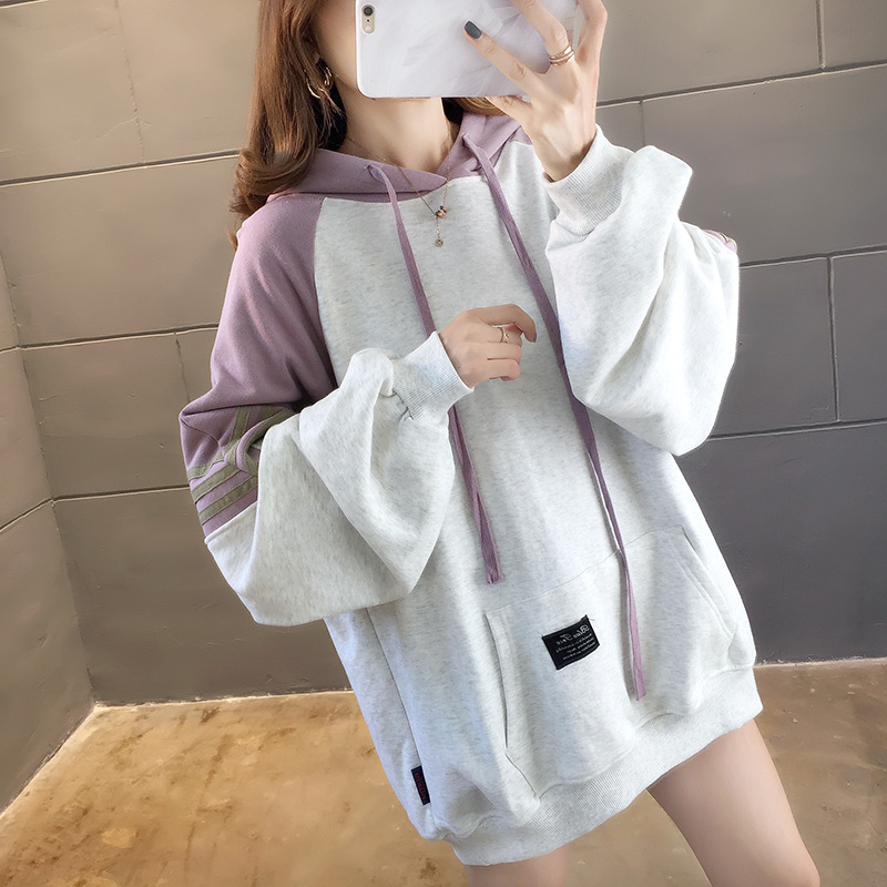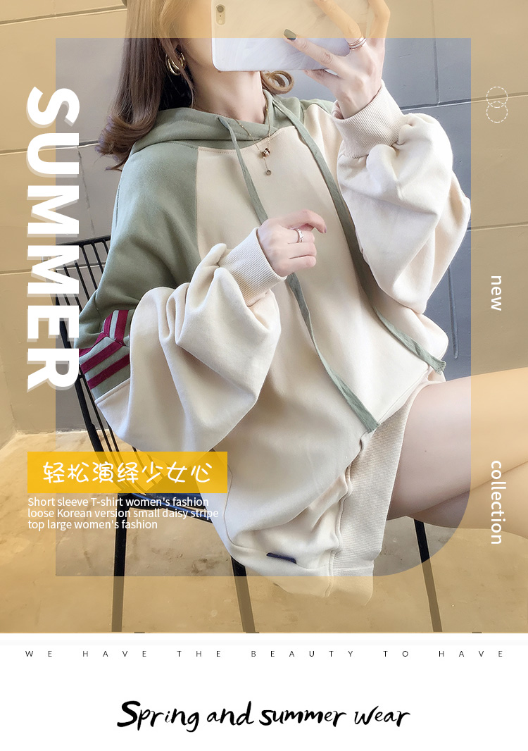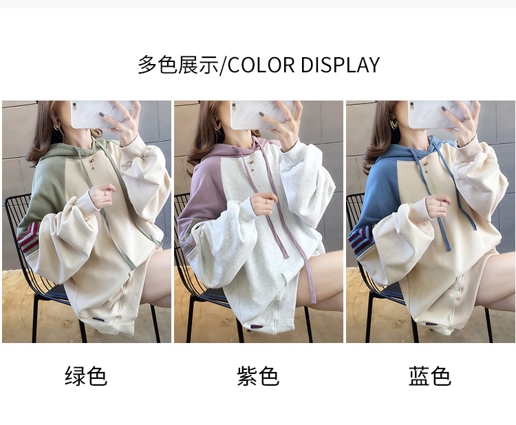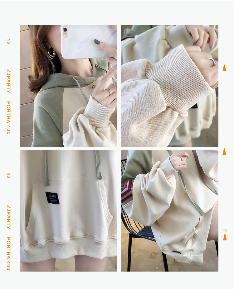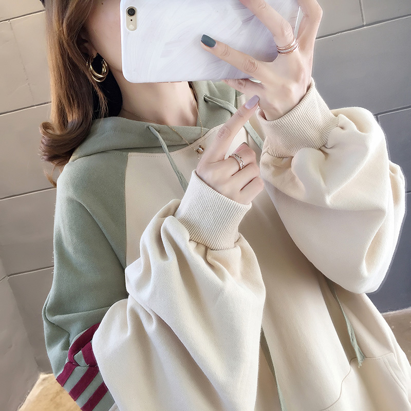 实拍2021春装韩版宽松连帽拼色百搭上衣大码女装长袖薄款卫衣女