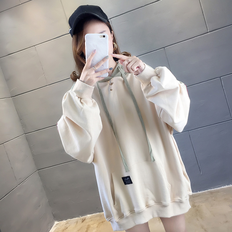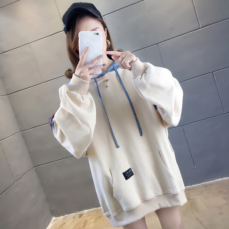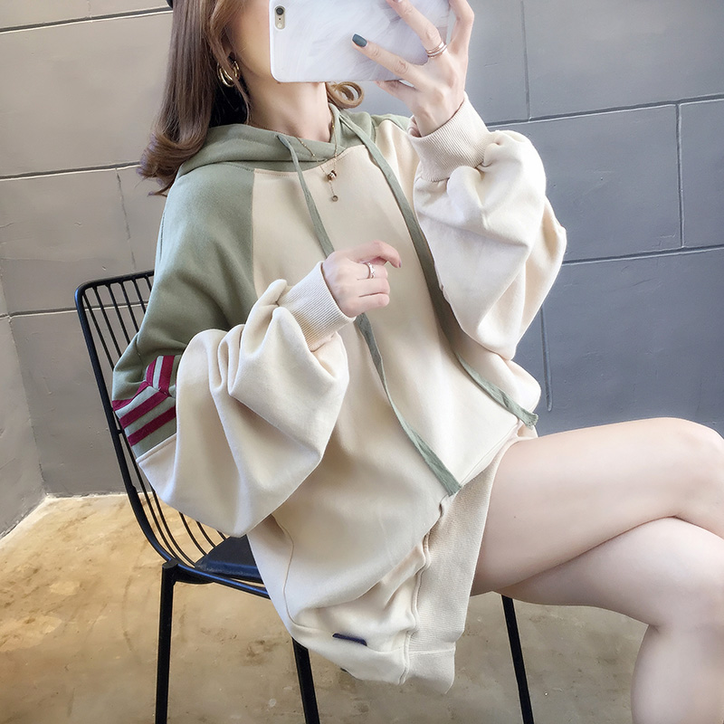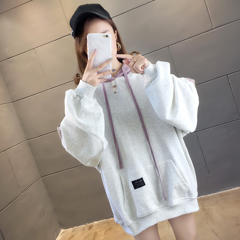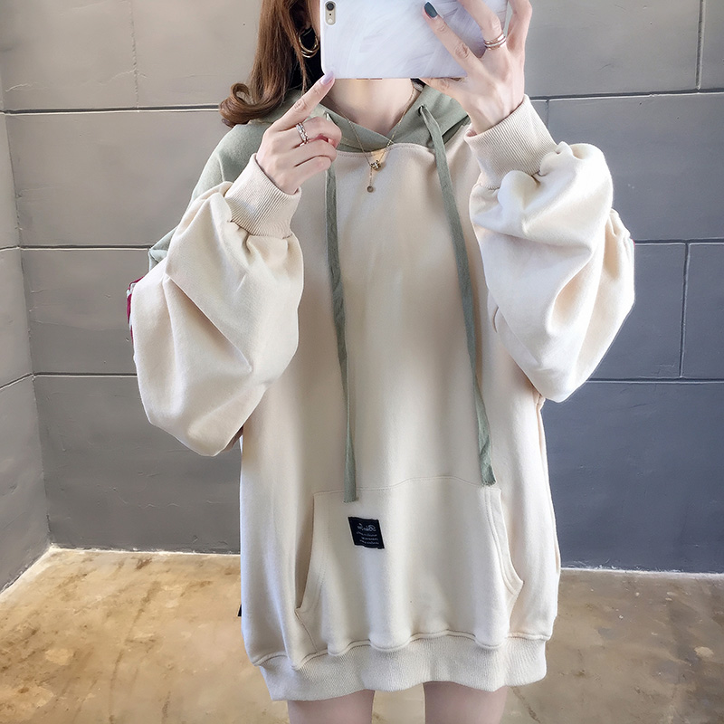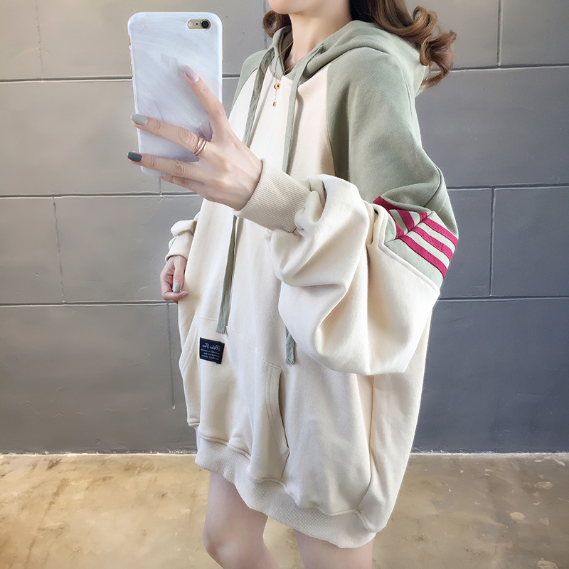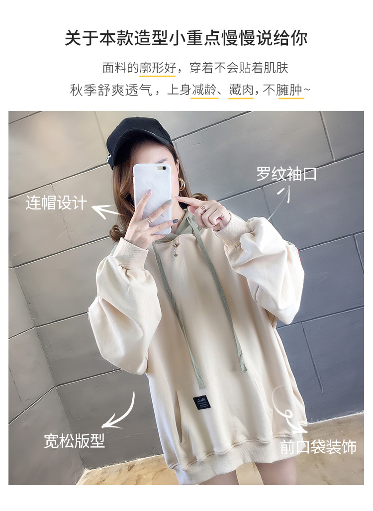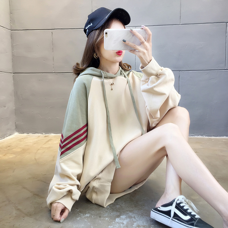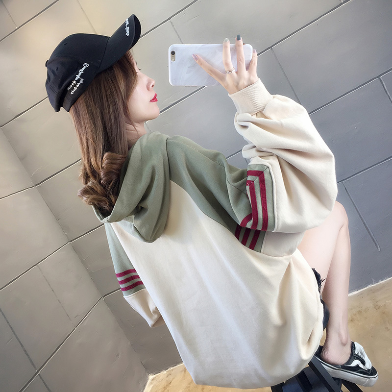 实拍2021春装韩版宽松连帽拼色百搭上衣大码女装长袖薄款卫衣女