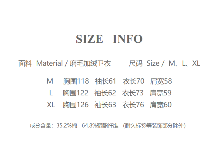 面料 Material / 磨毛加绒卫衣 尺码 Size / M、L、XL