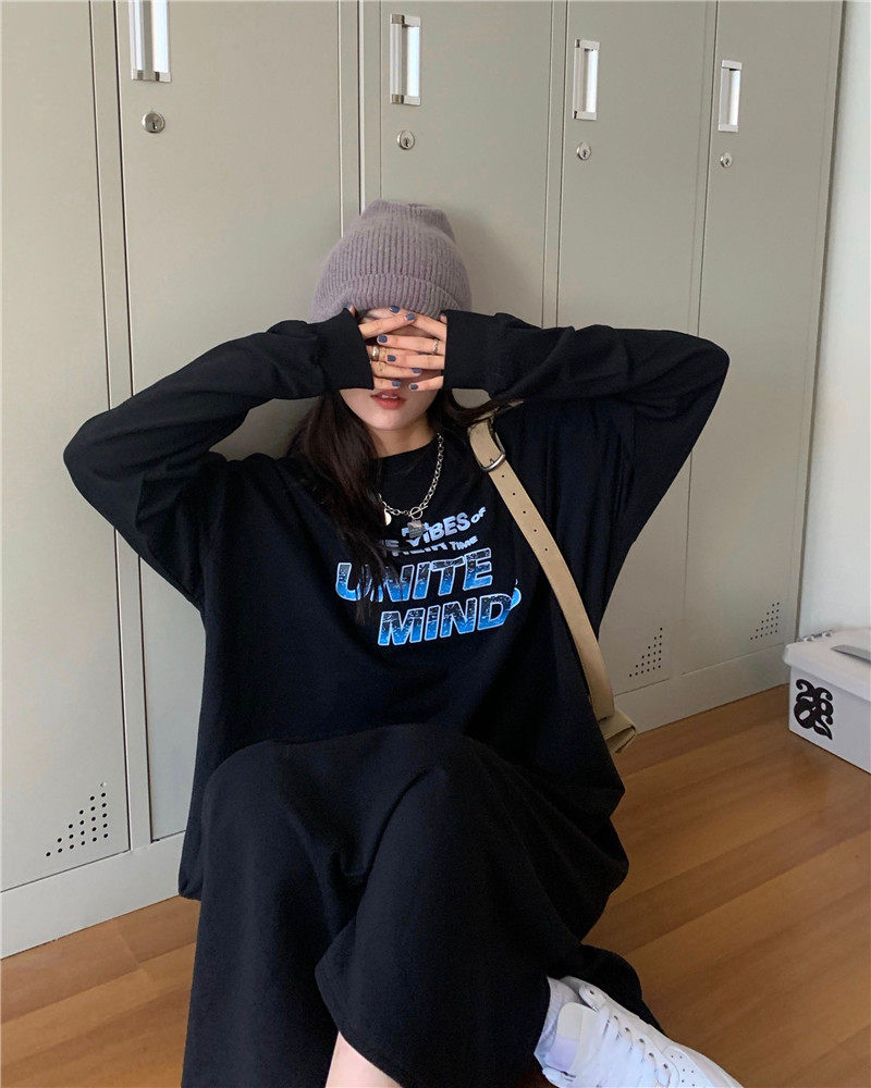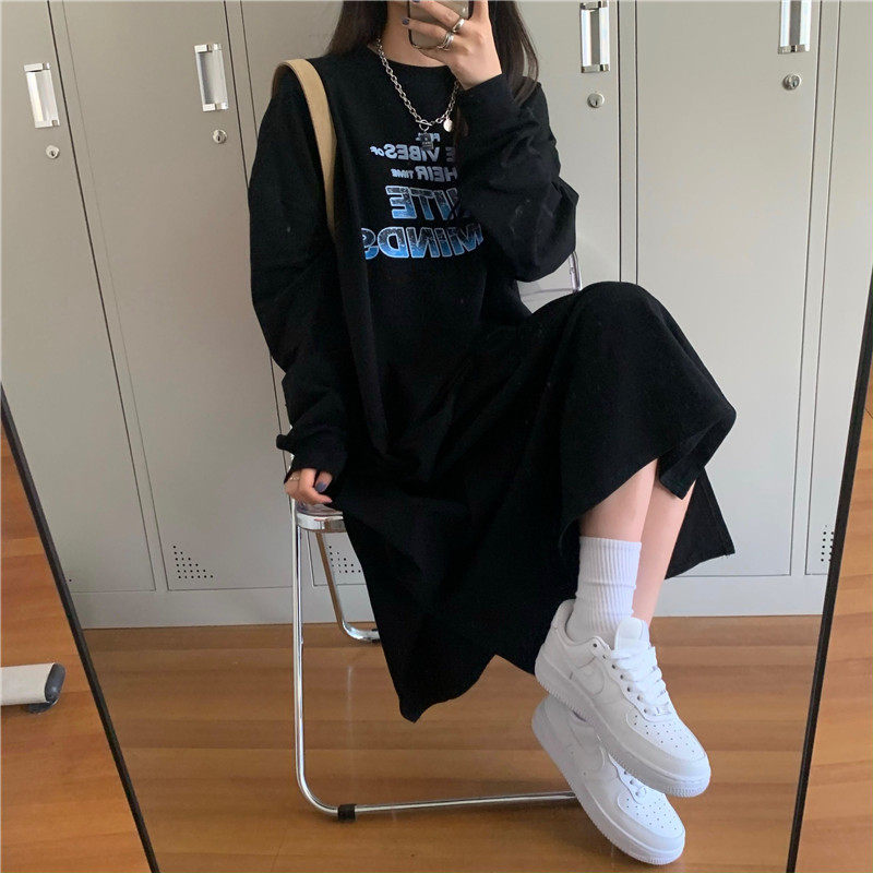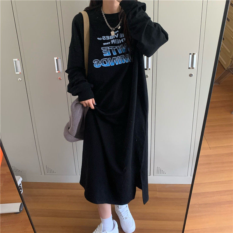 实拍实价 复古字母印花长袖圆领卫衣长款连衣裙开叉