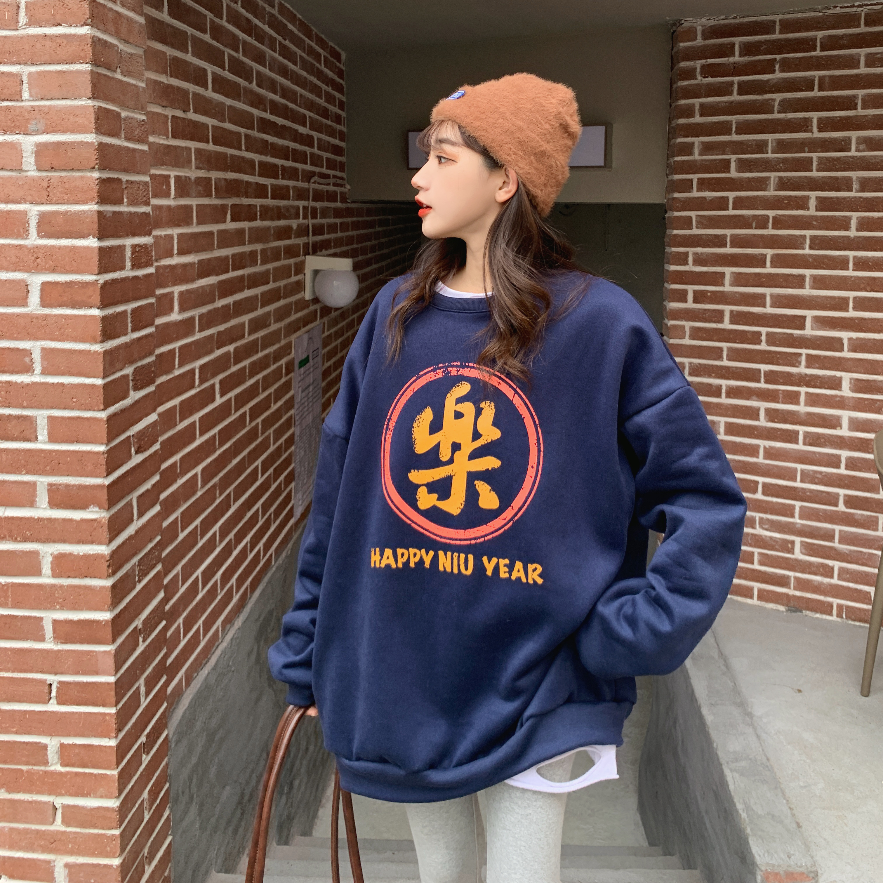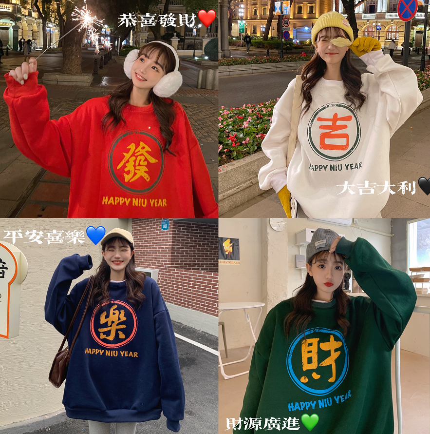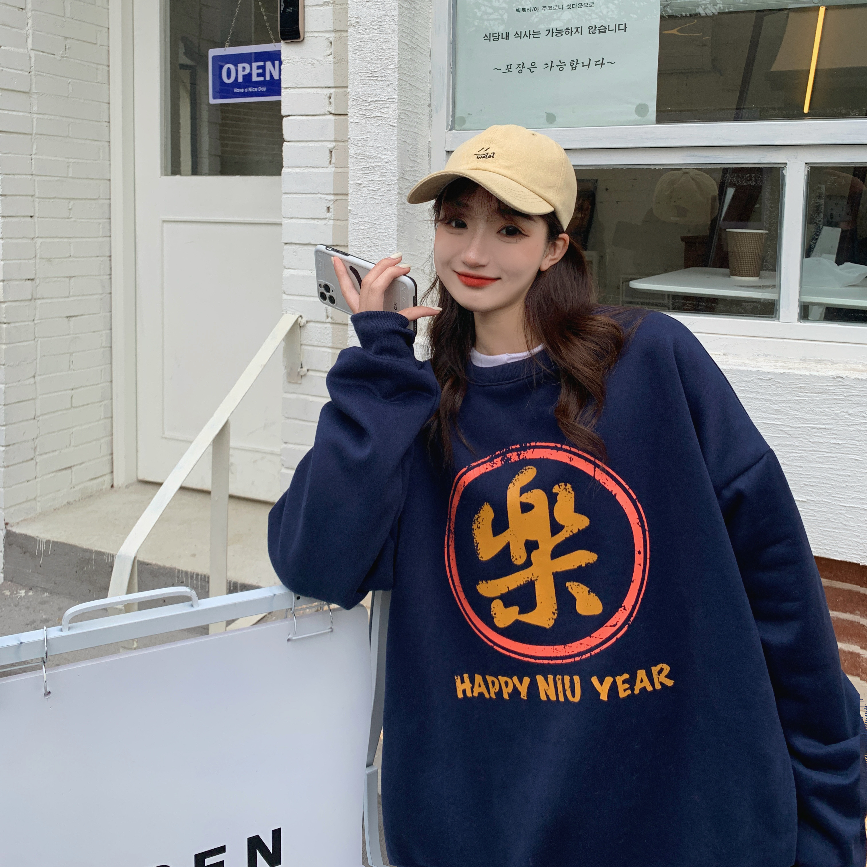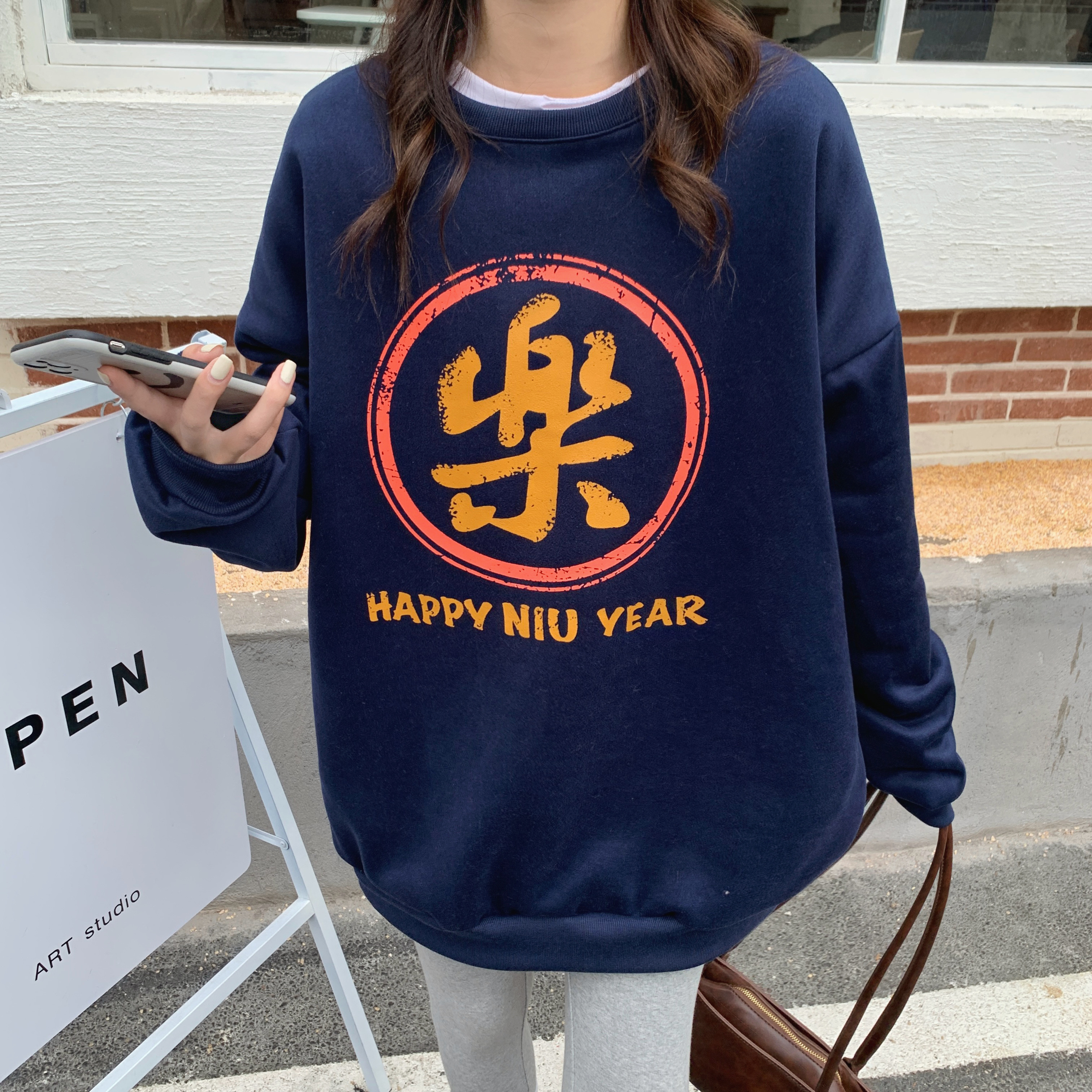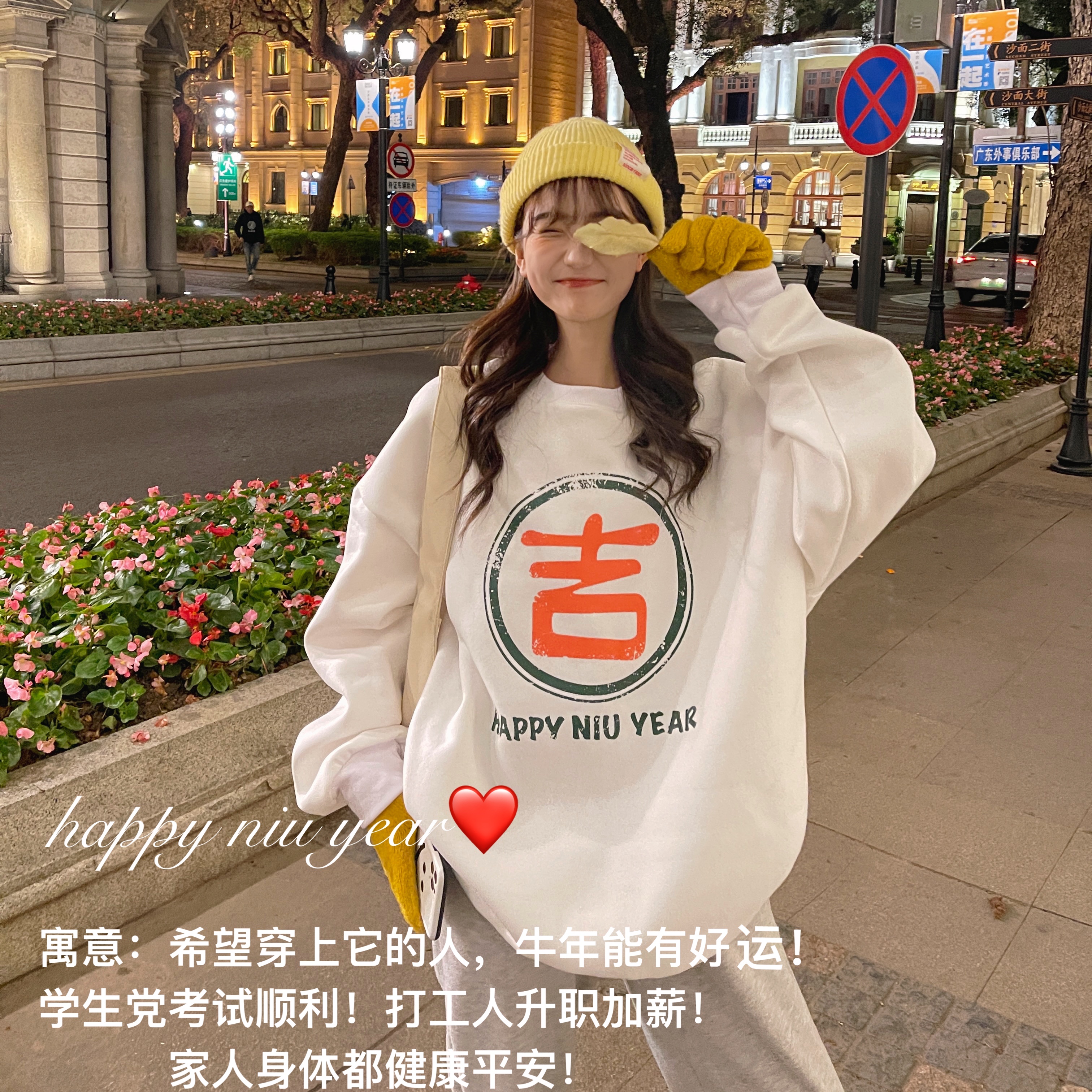 实拍实价~新年圣诞happy“牛”year圆领套头加绒卫衣
