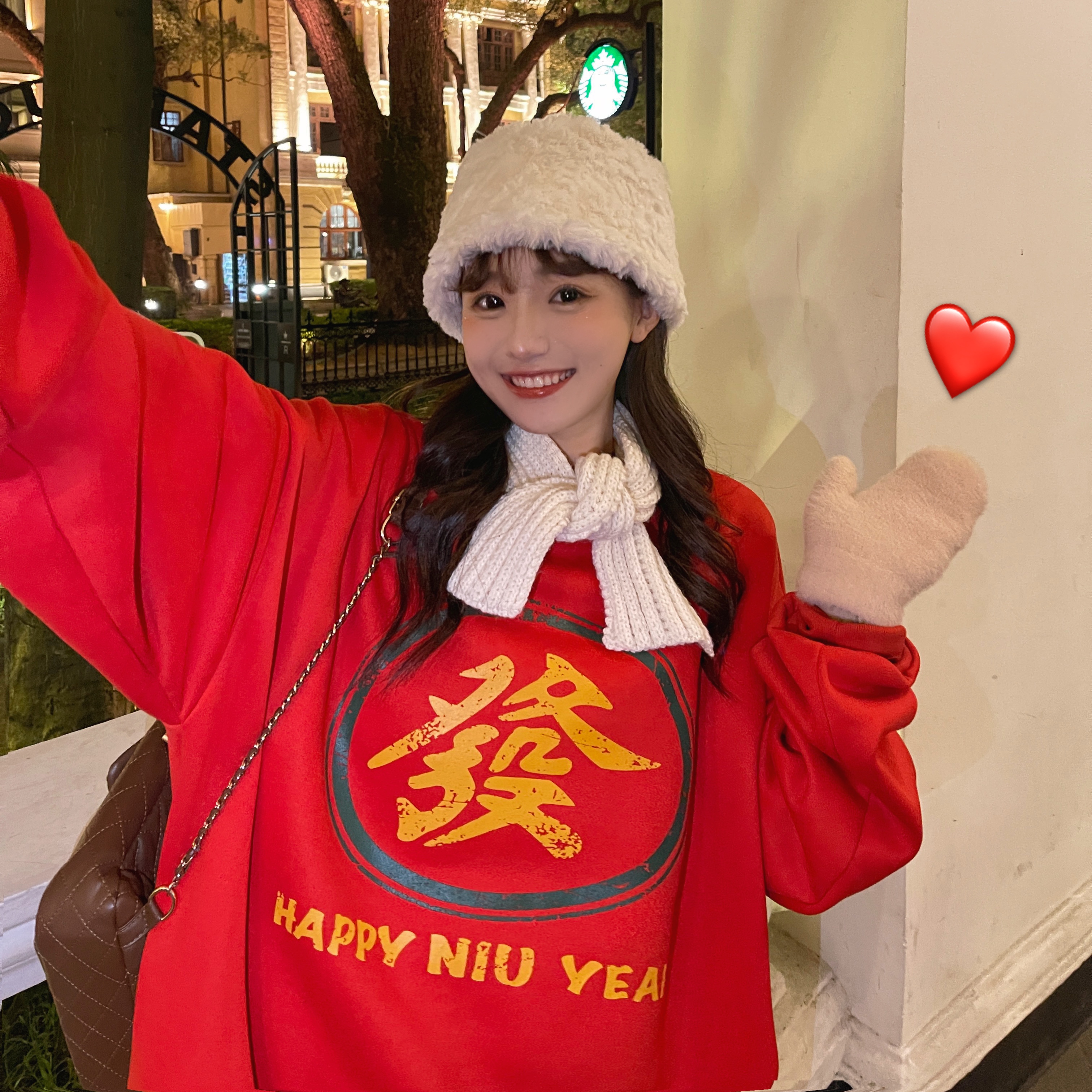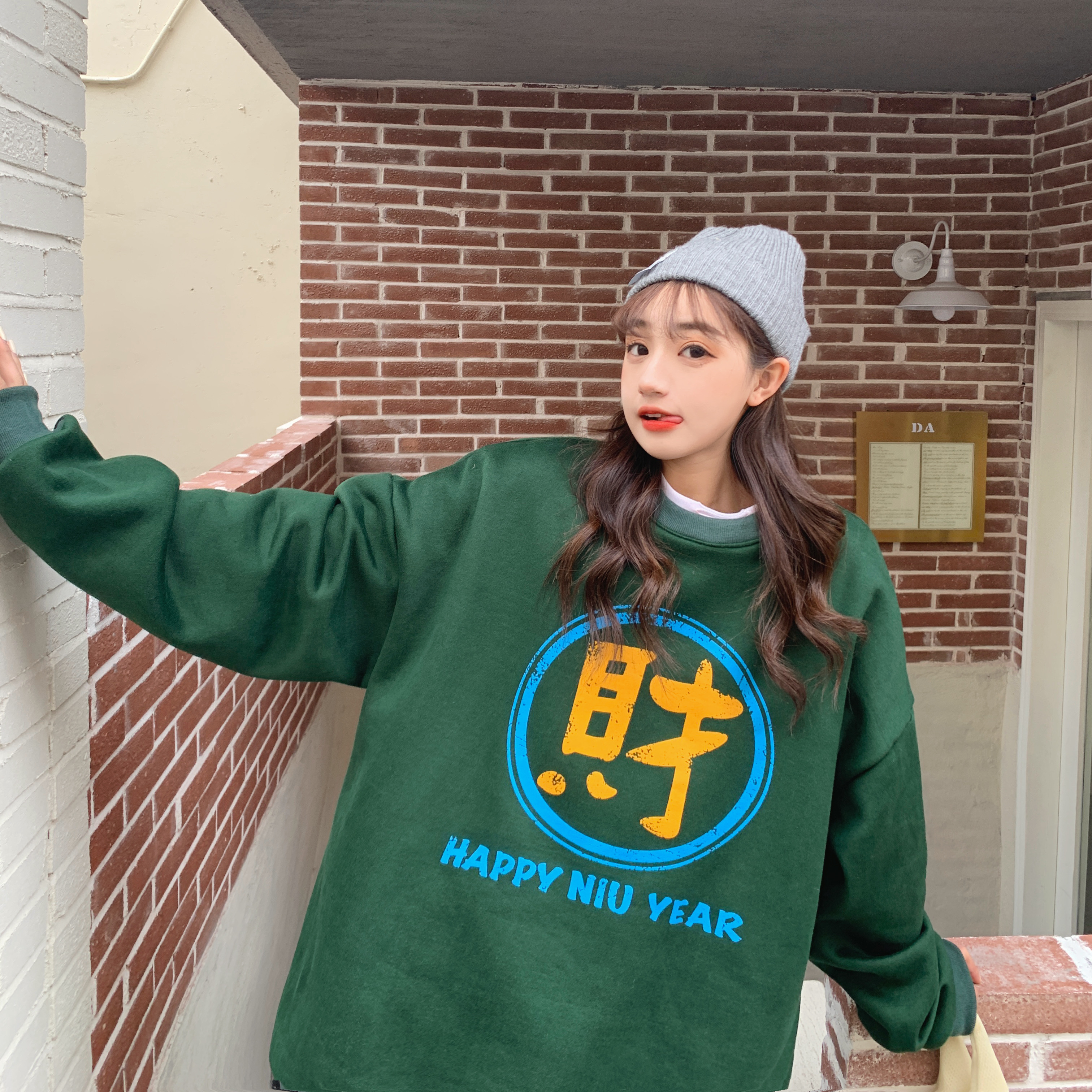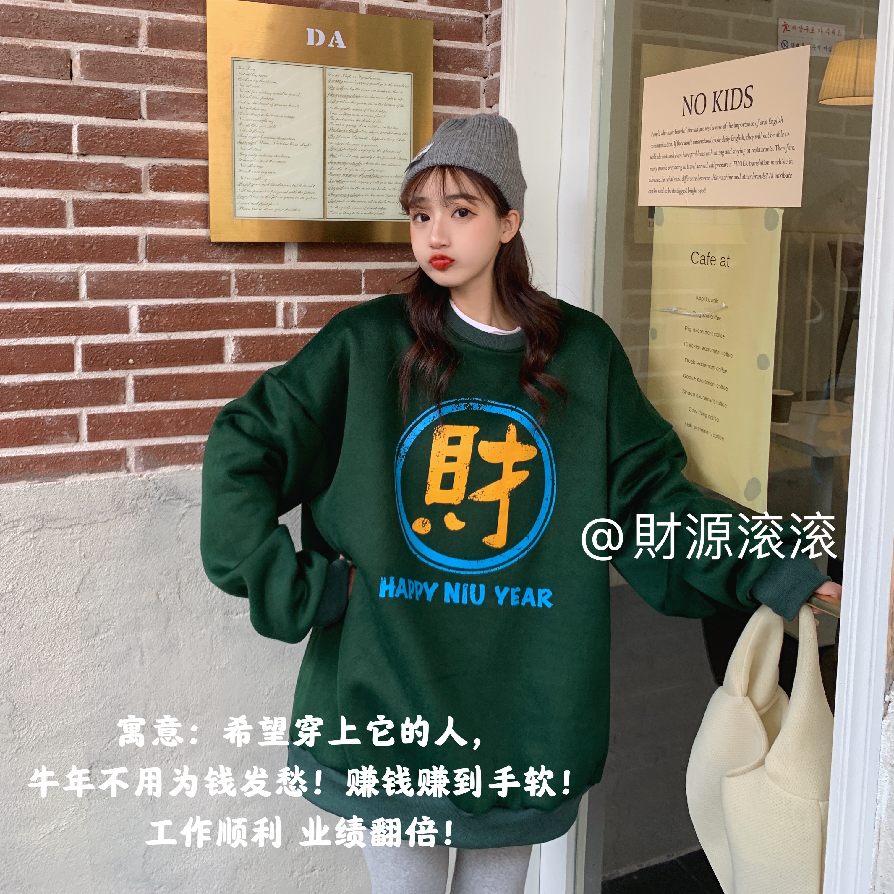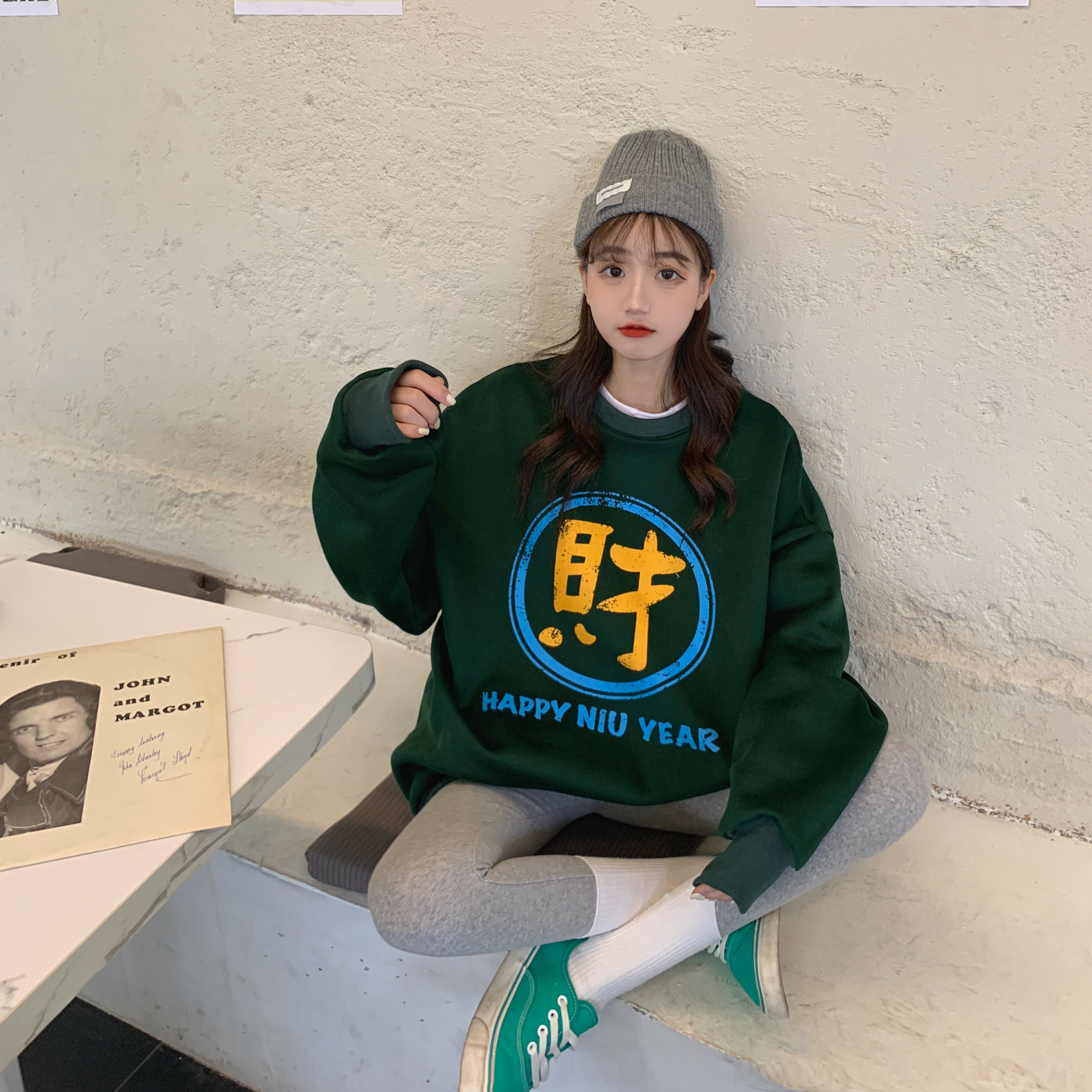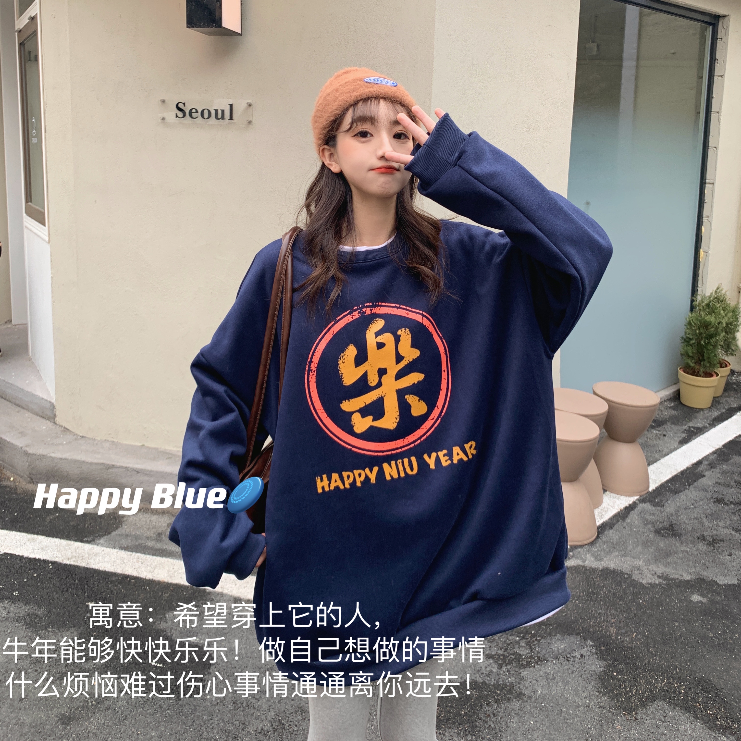 实拍实价~新年圣诞happy“牛”year圆领套头加绒卫衣