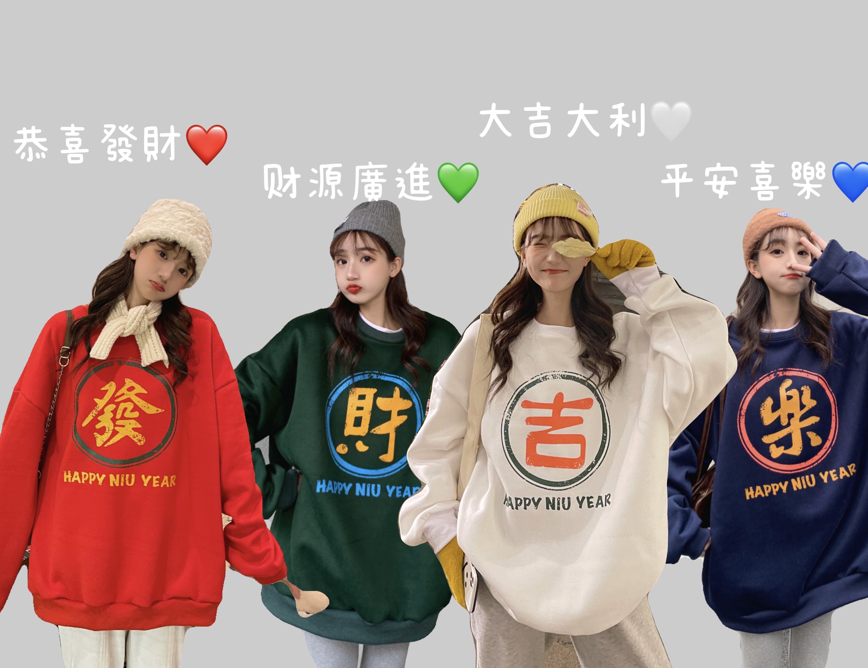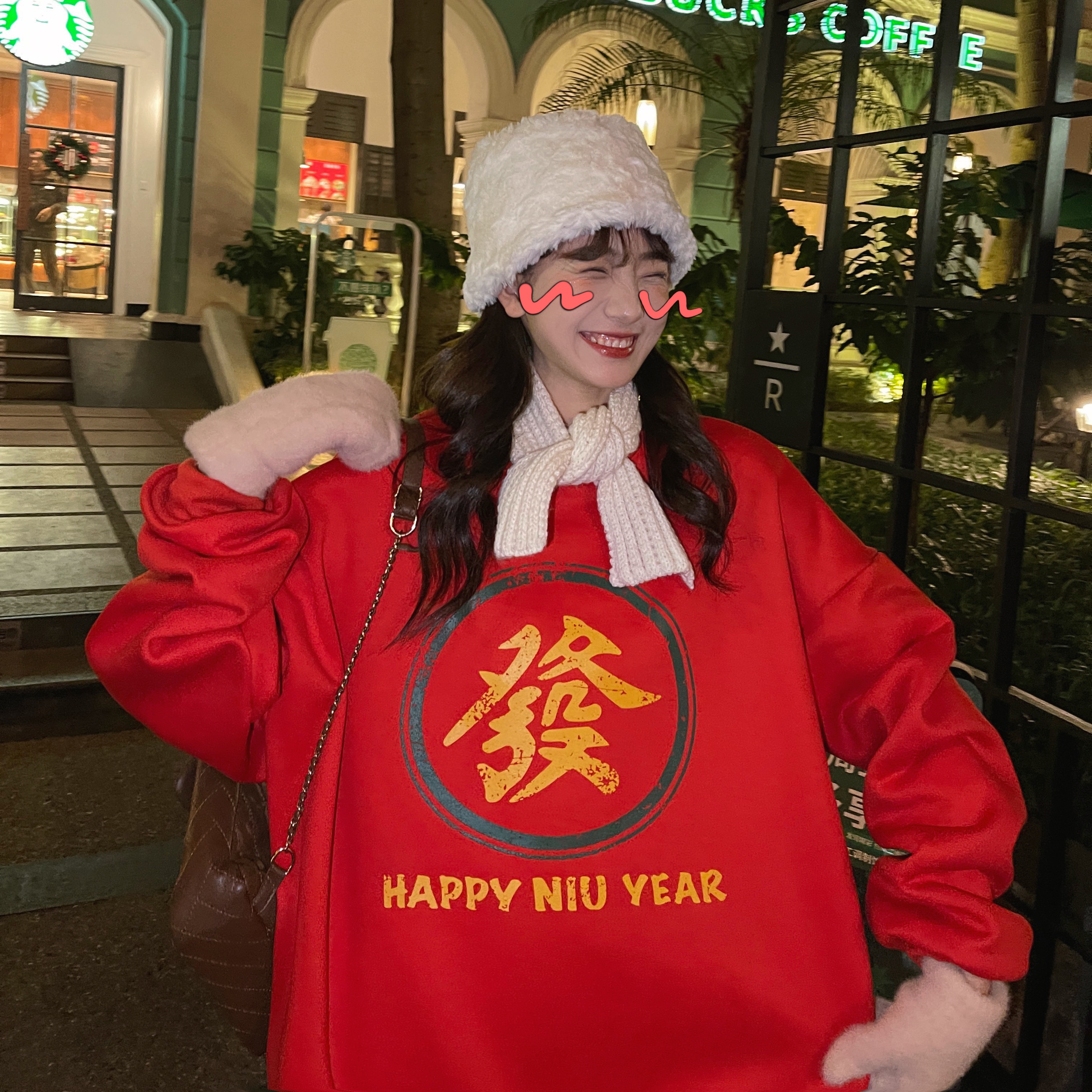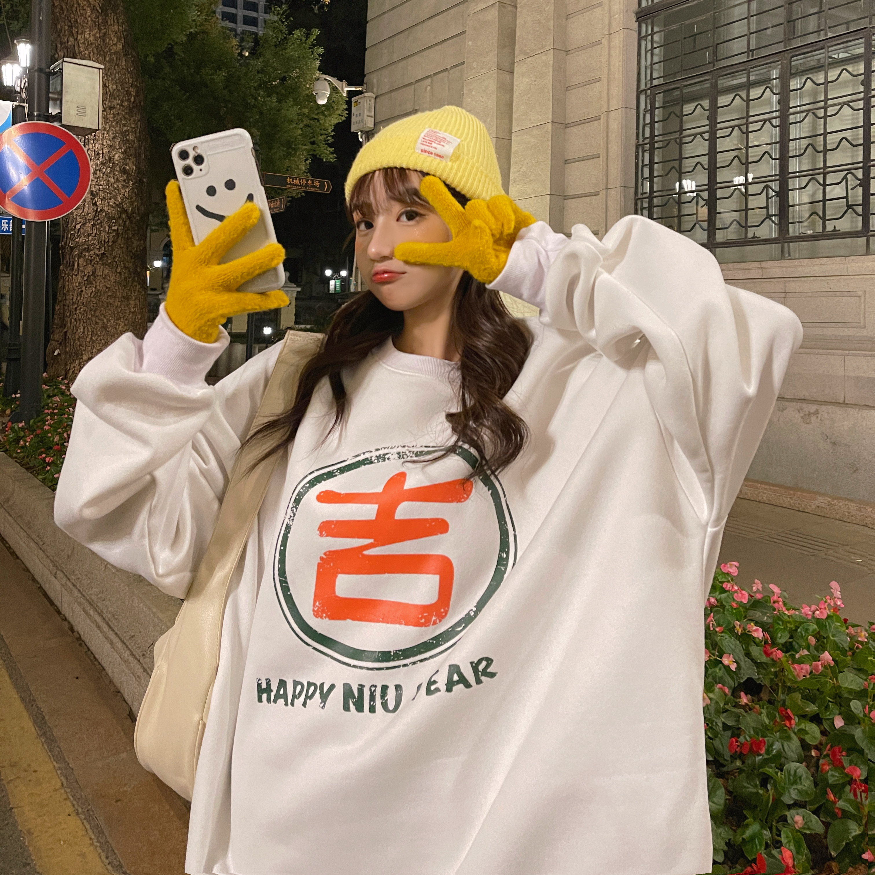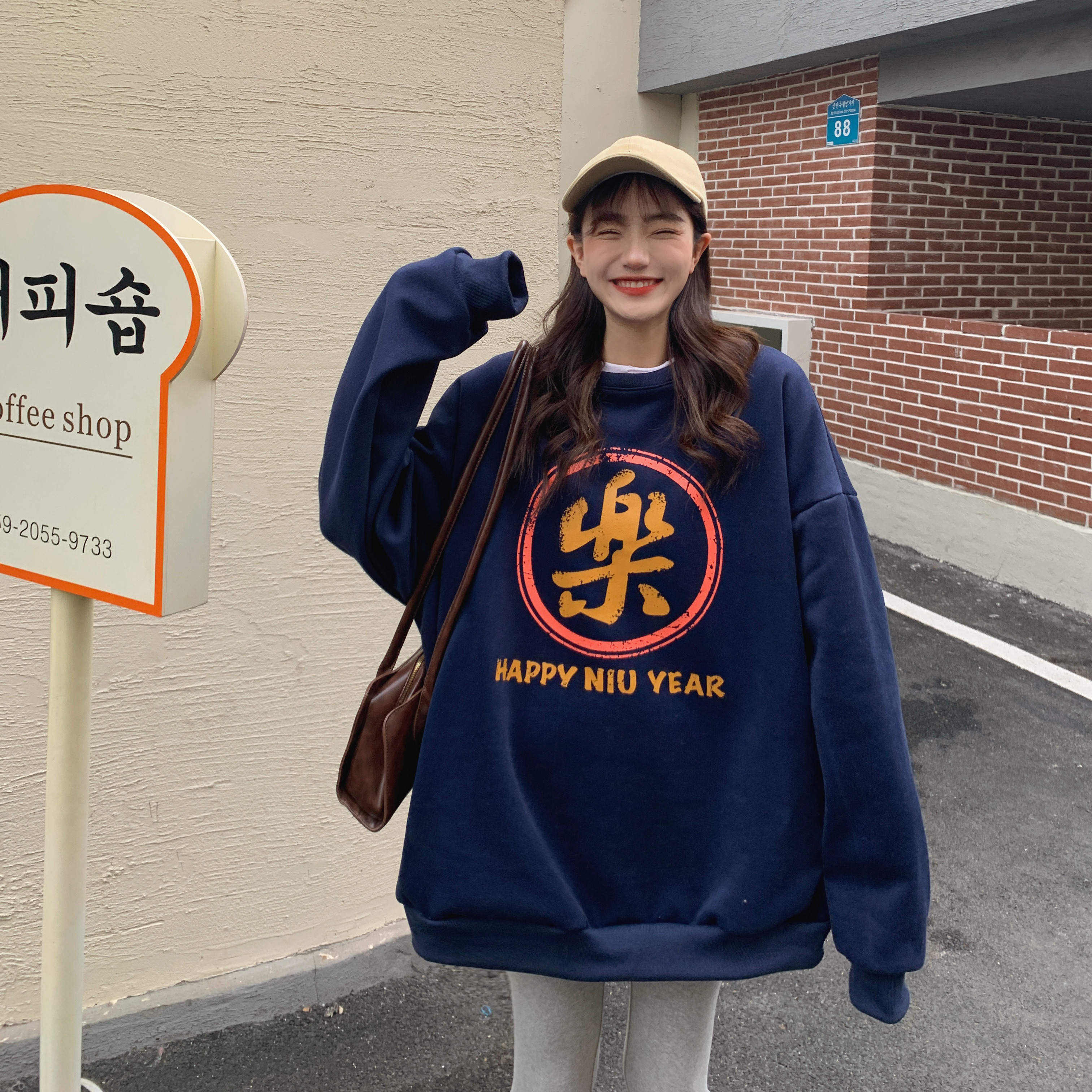 实拍实价~新年圣诞happy“牛”year圆领套头加绒卫衣