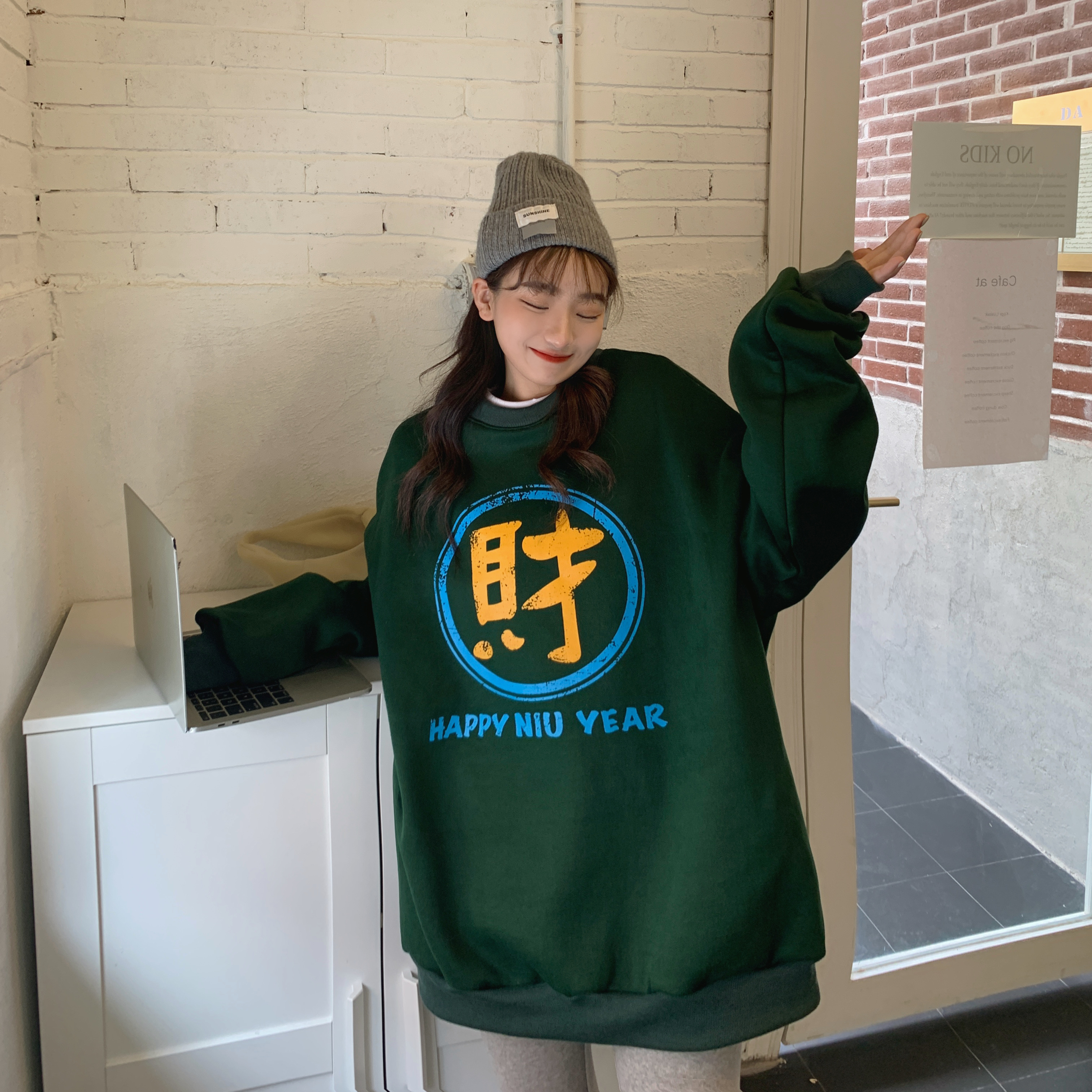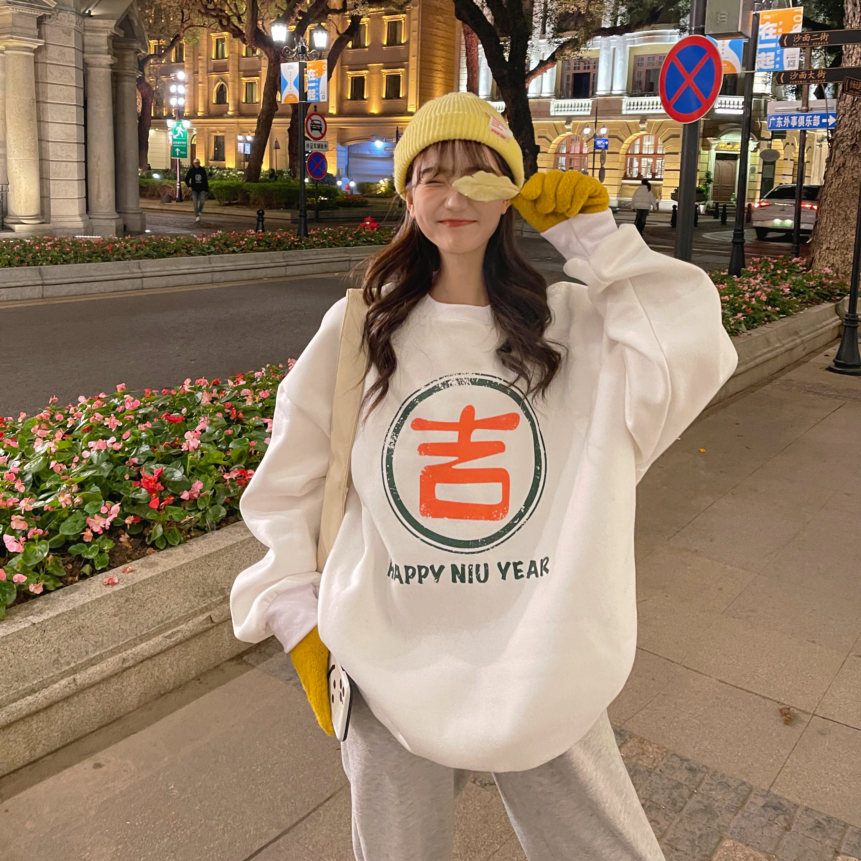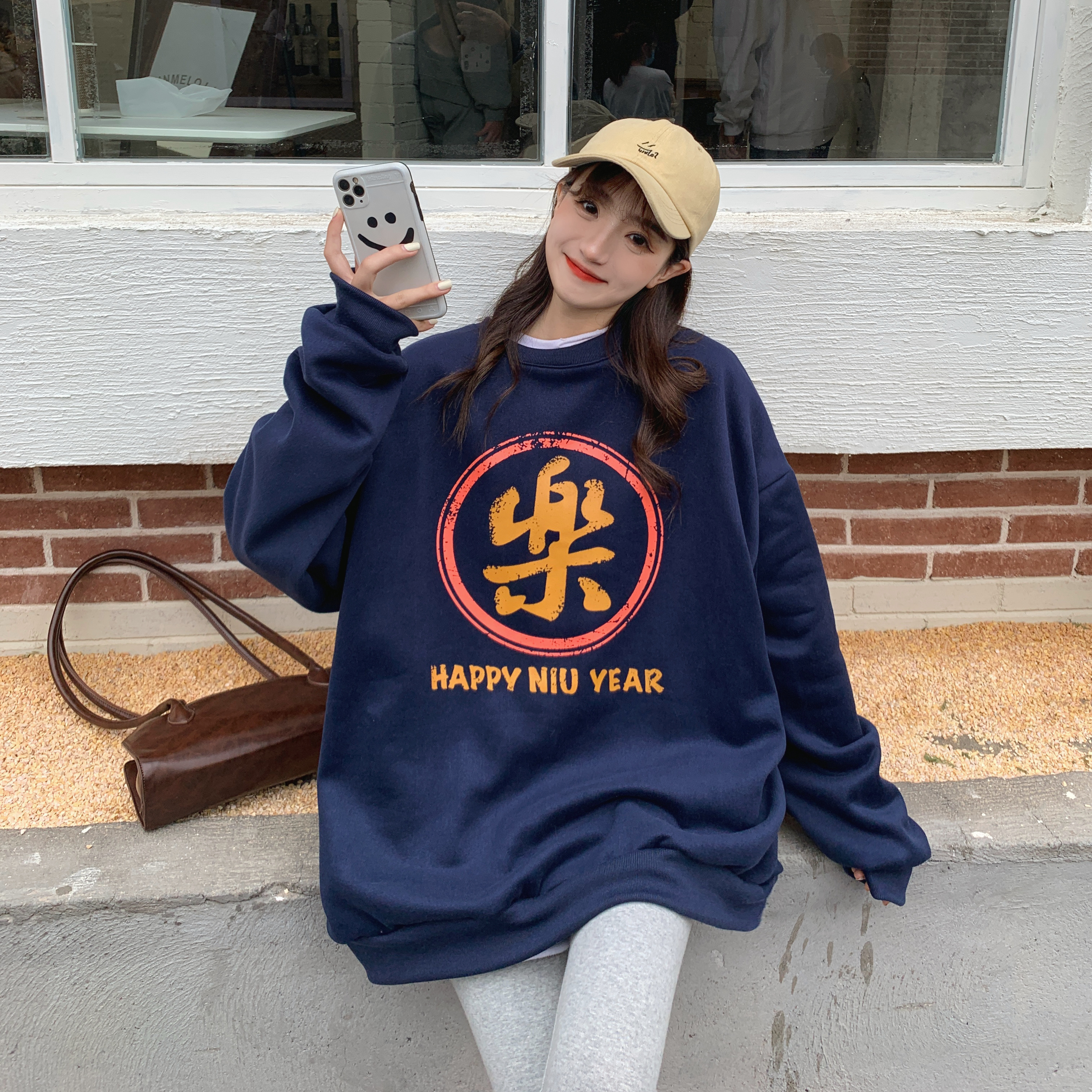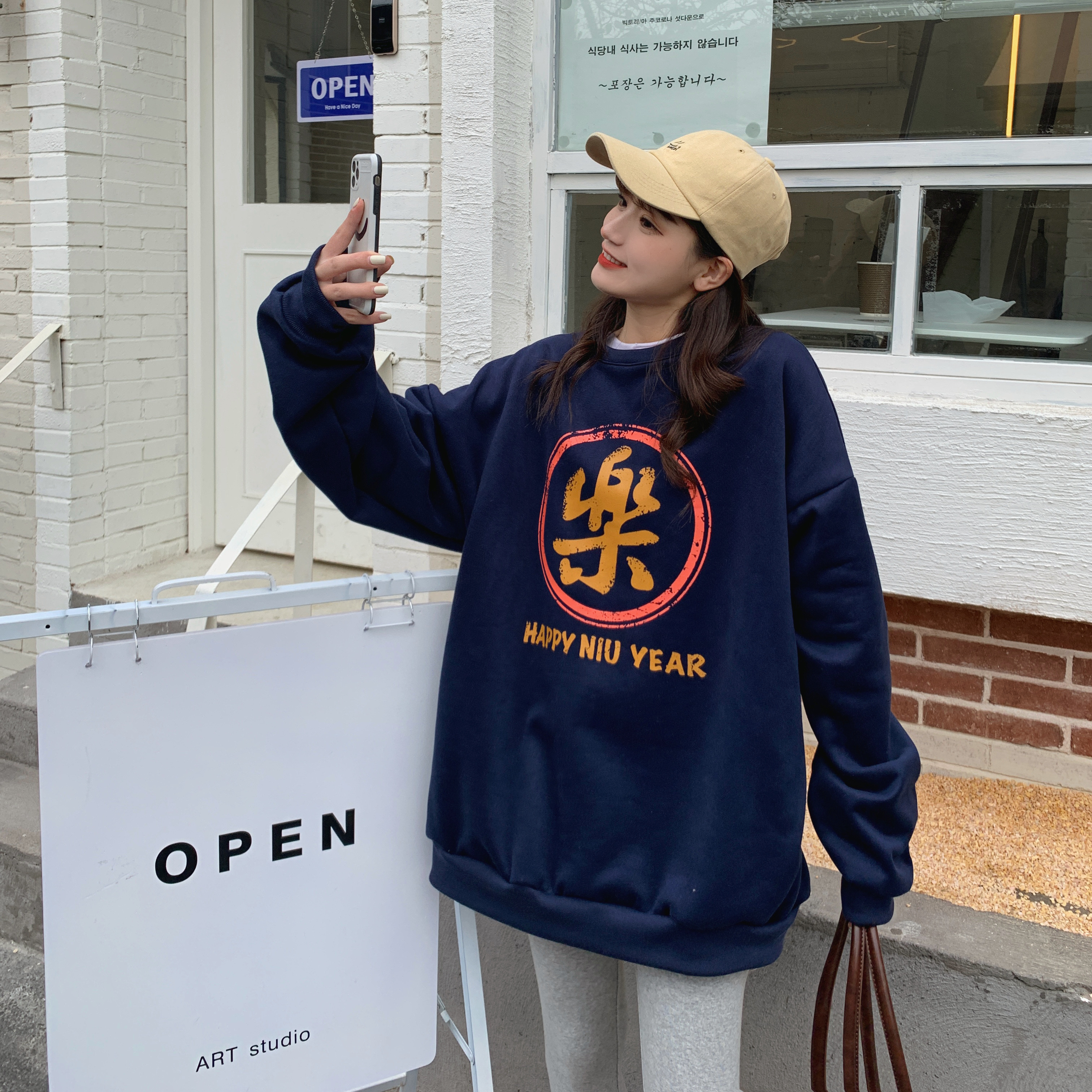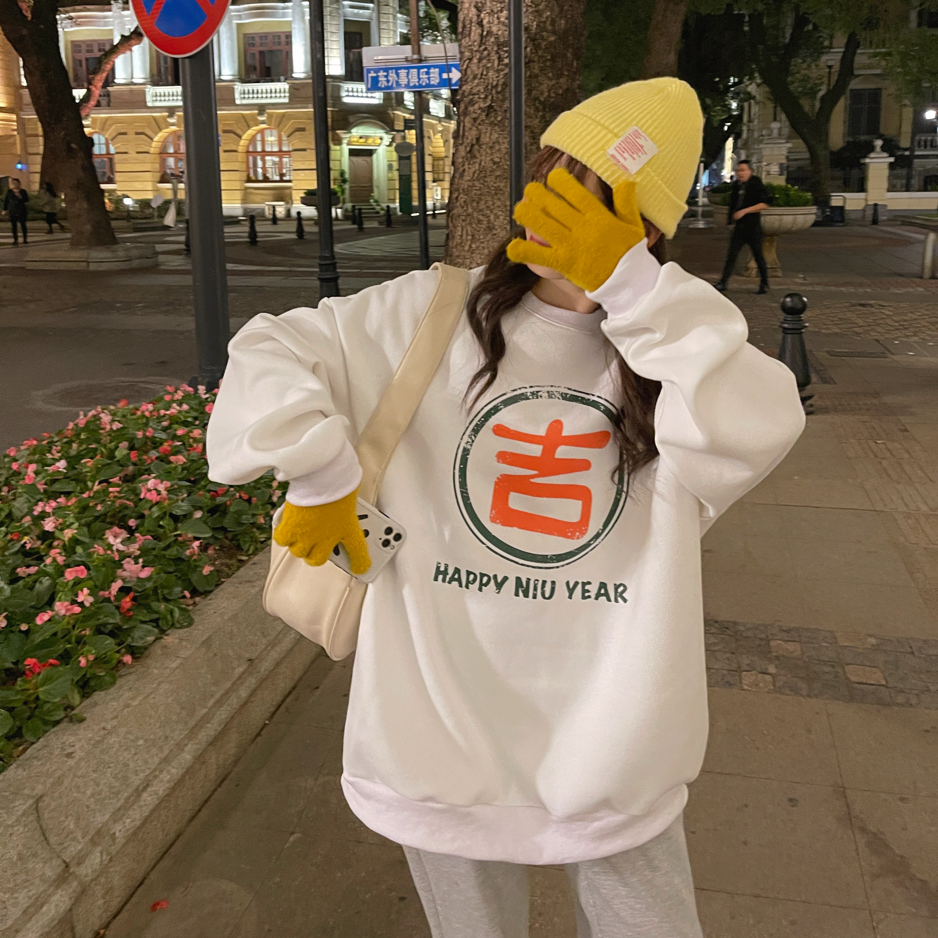实拍实价~新年圣诞happy“牛”year圆领套头加绒卫衣