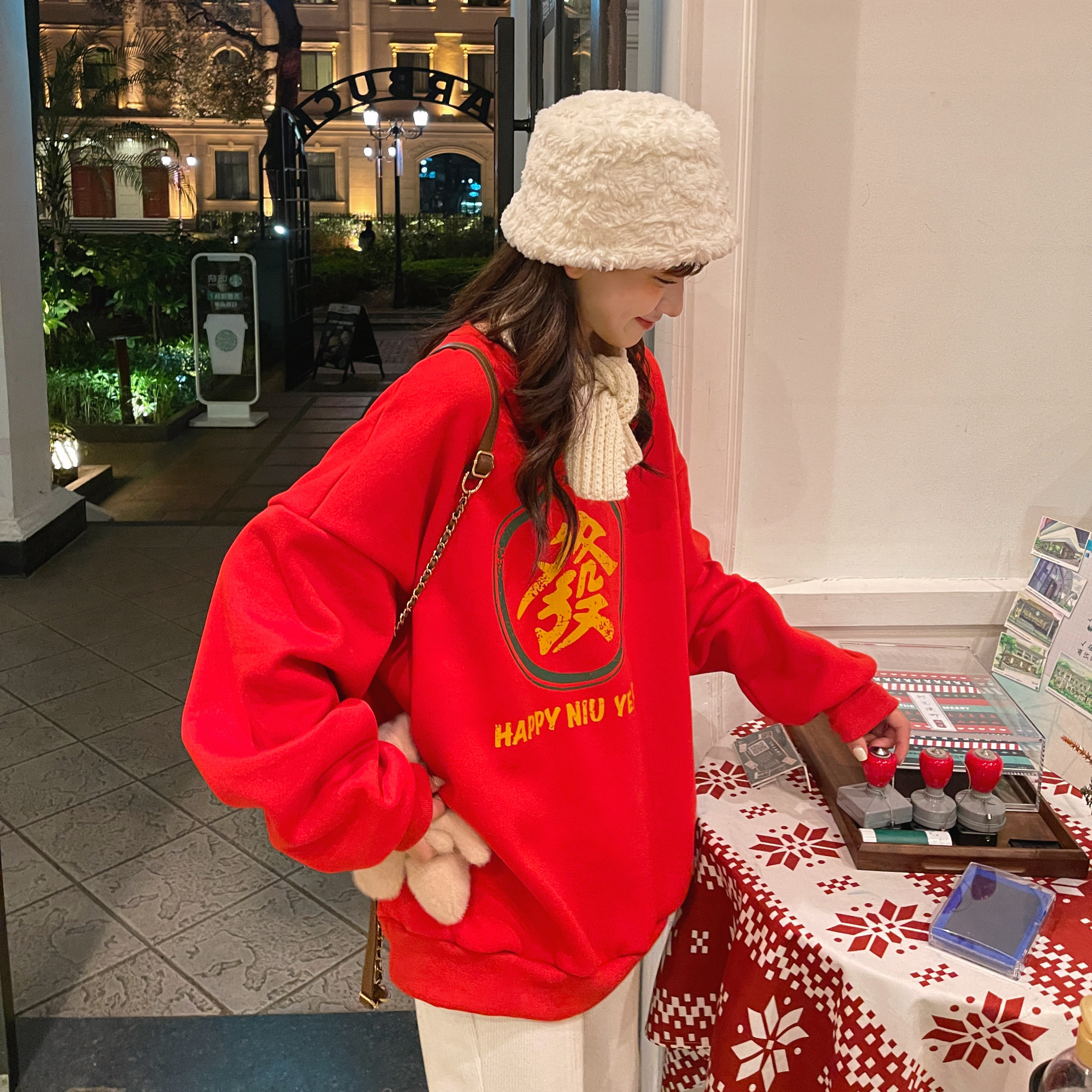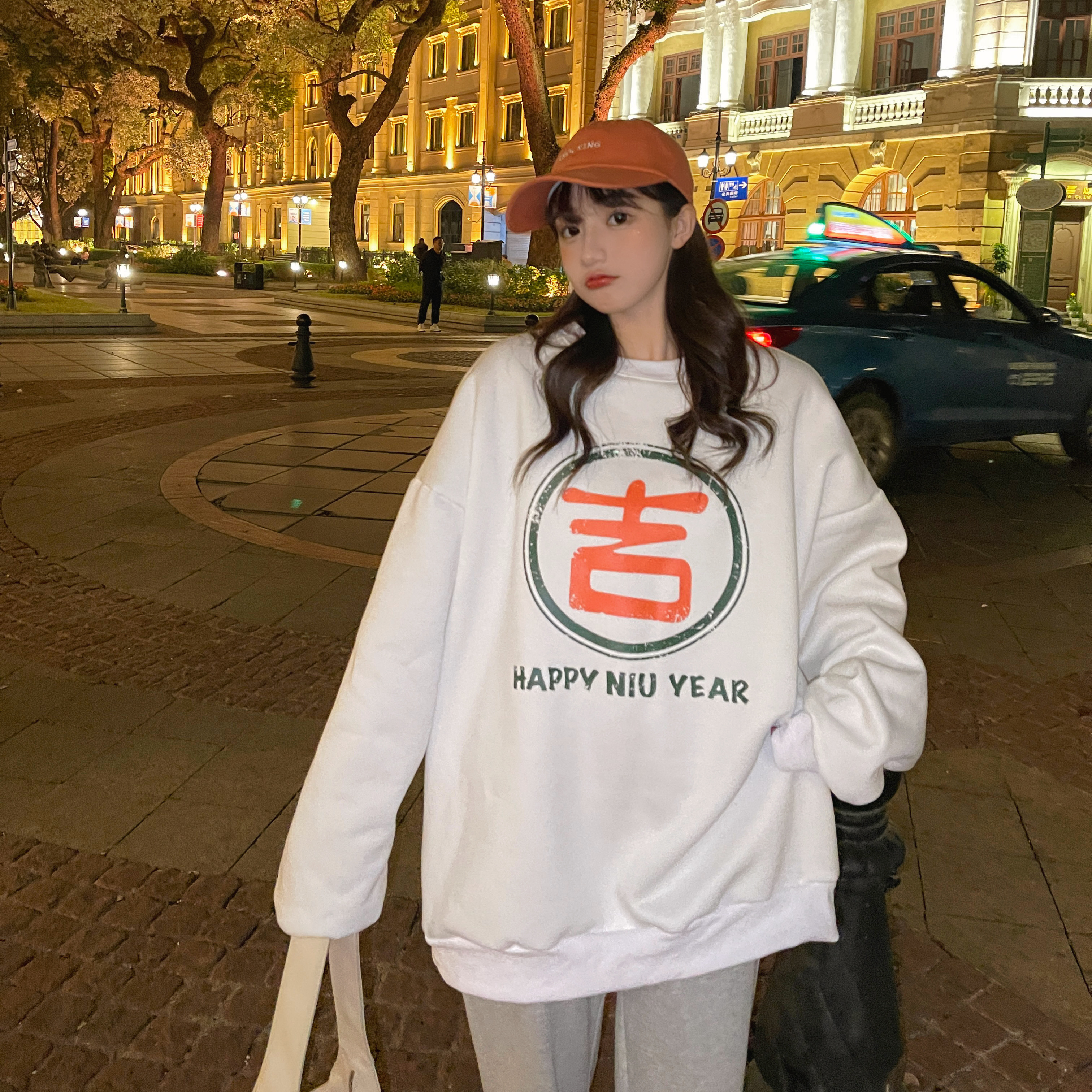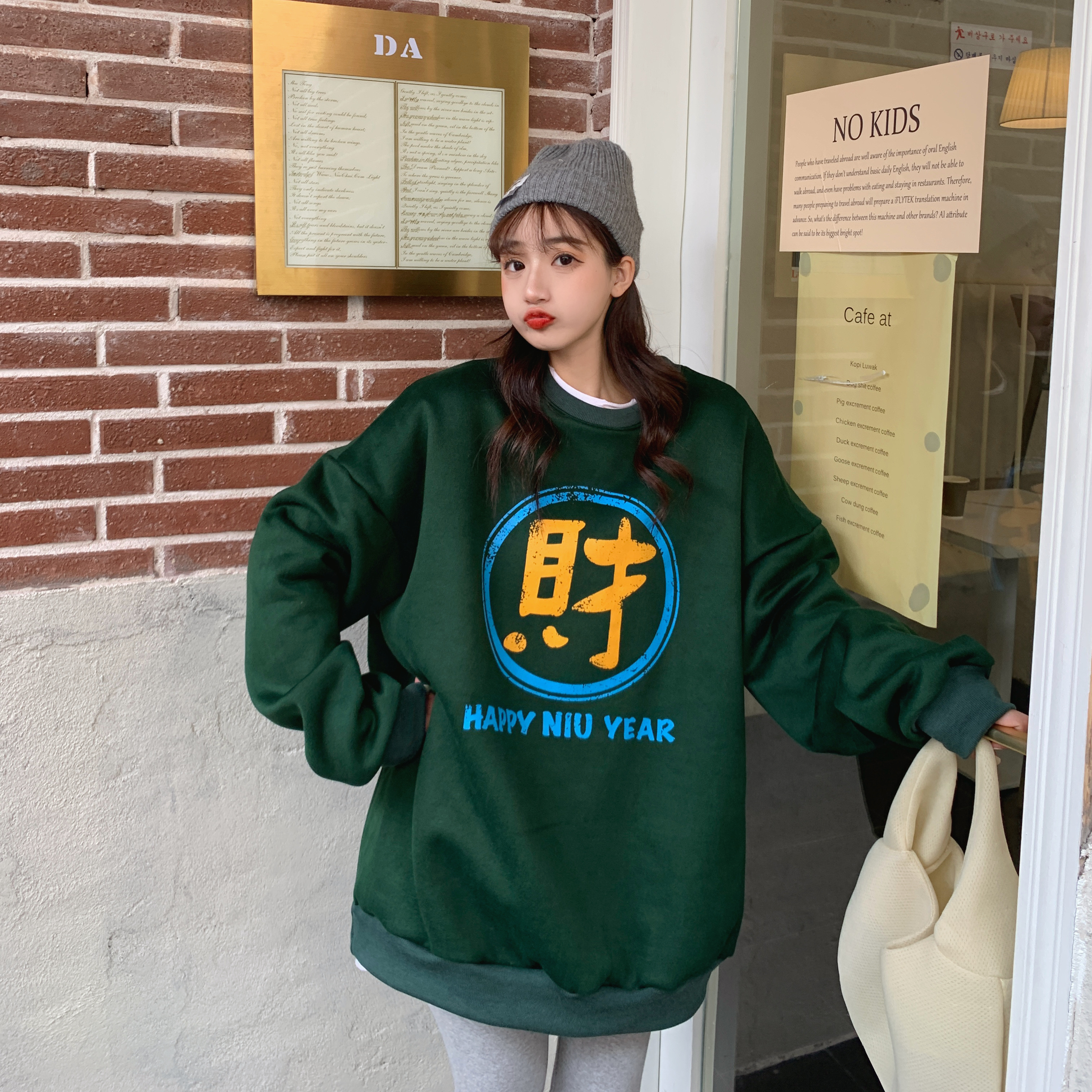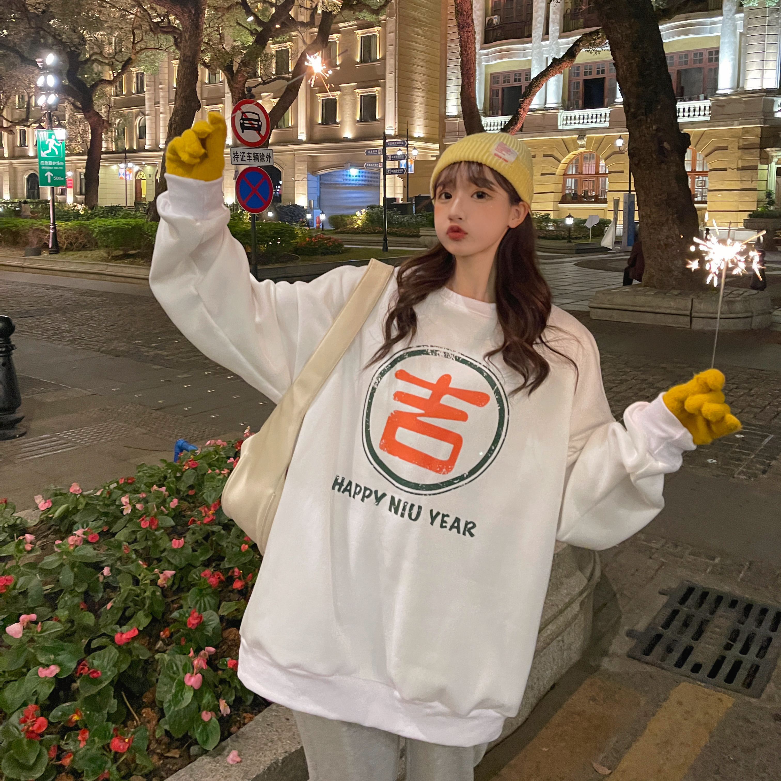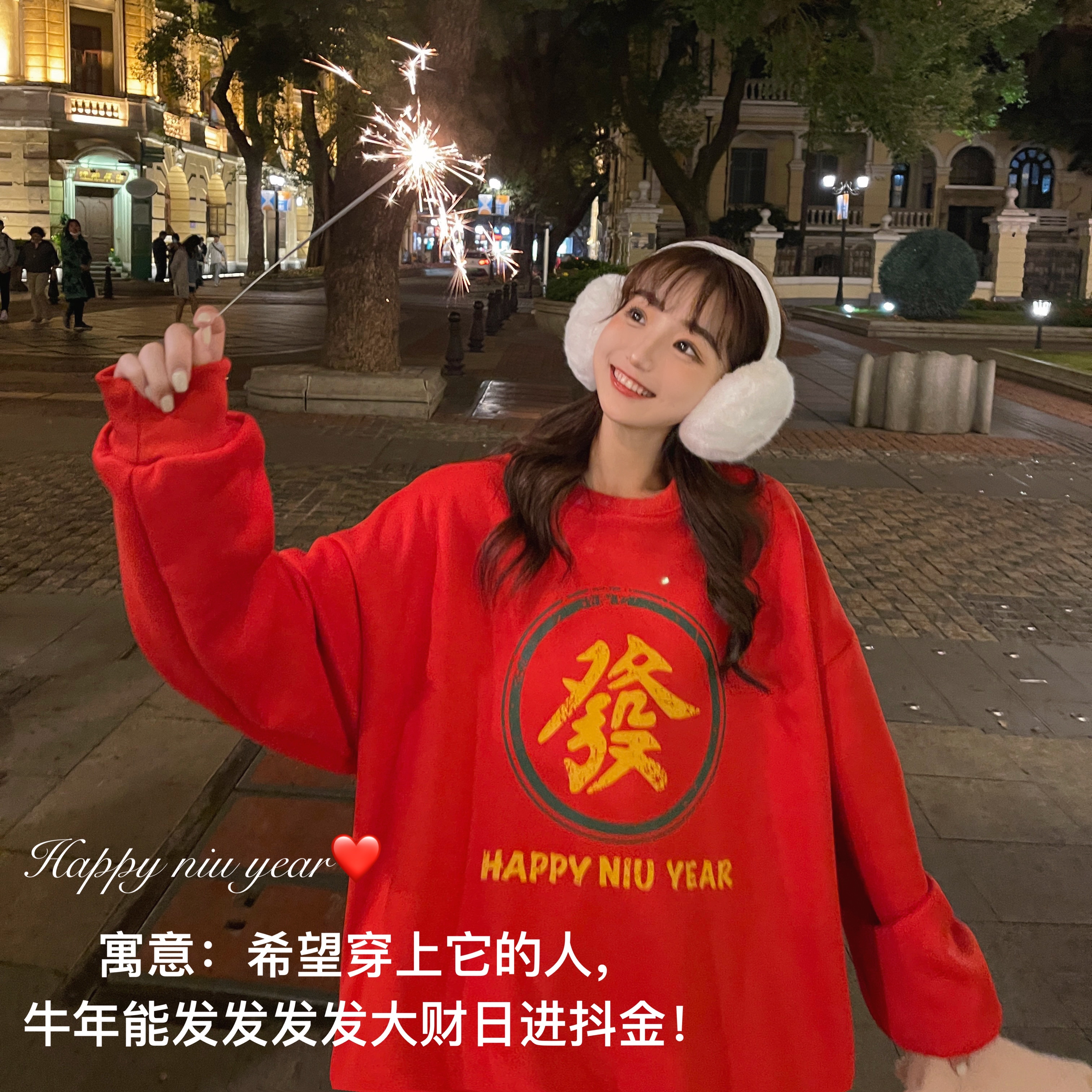 实拍实价~新年圣诞happy“牛”year圆领套头加绒卫衣