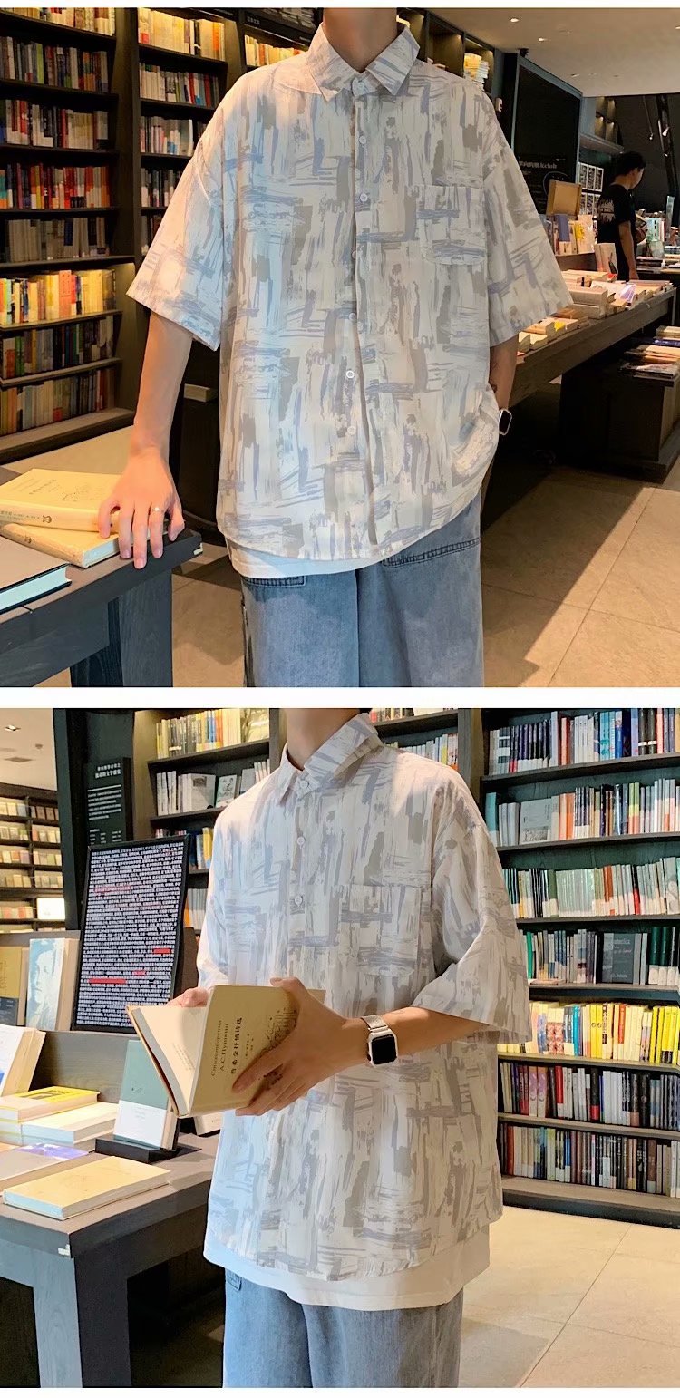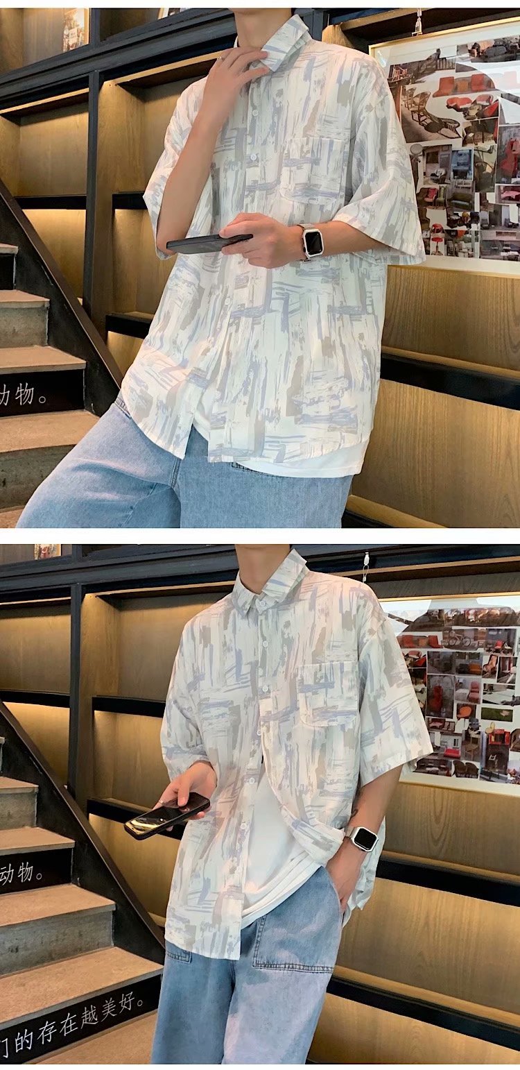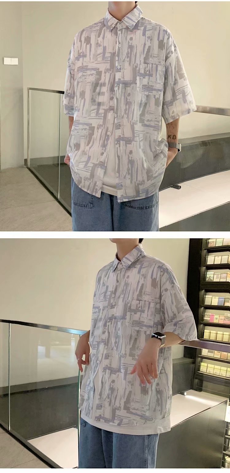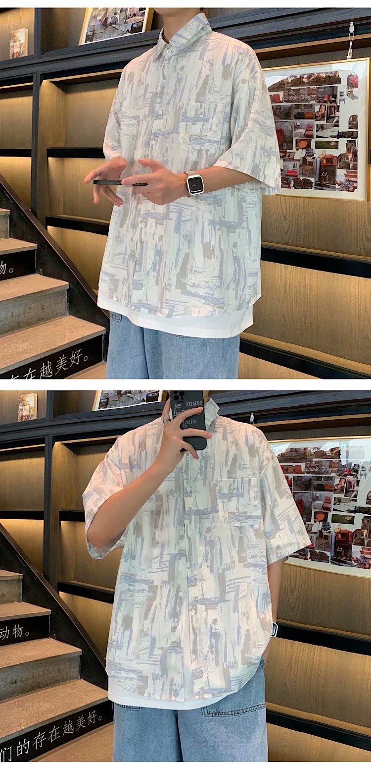 实拍痞帅衬衫男短袖设计感花衬衣男夏季ins港风休闲宽松百搭衣服