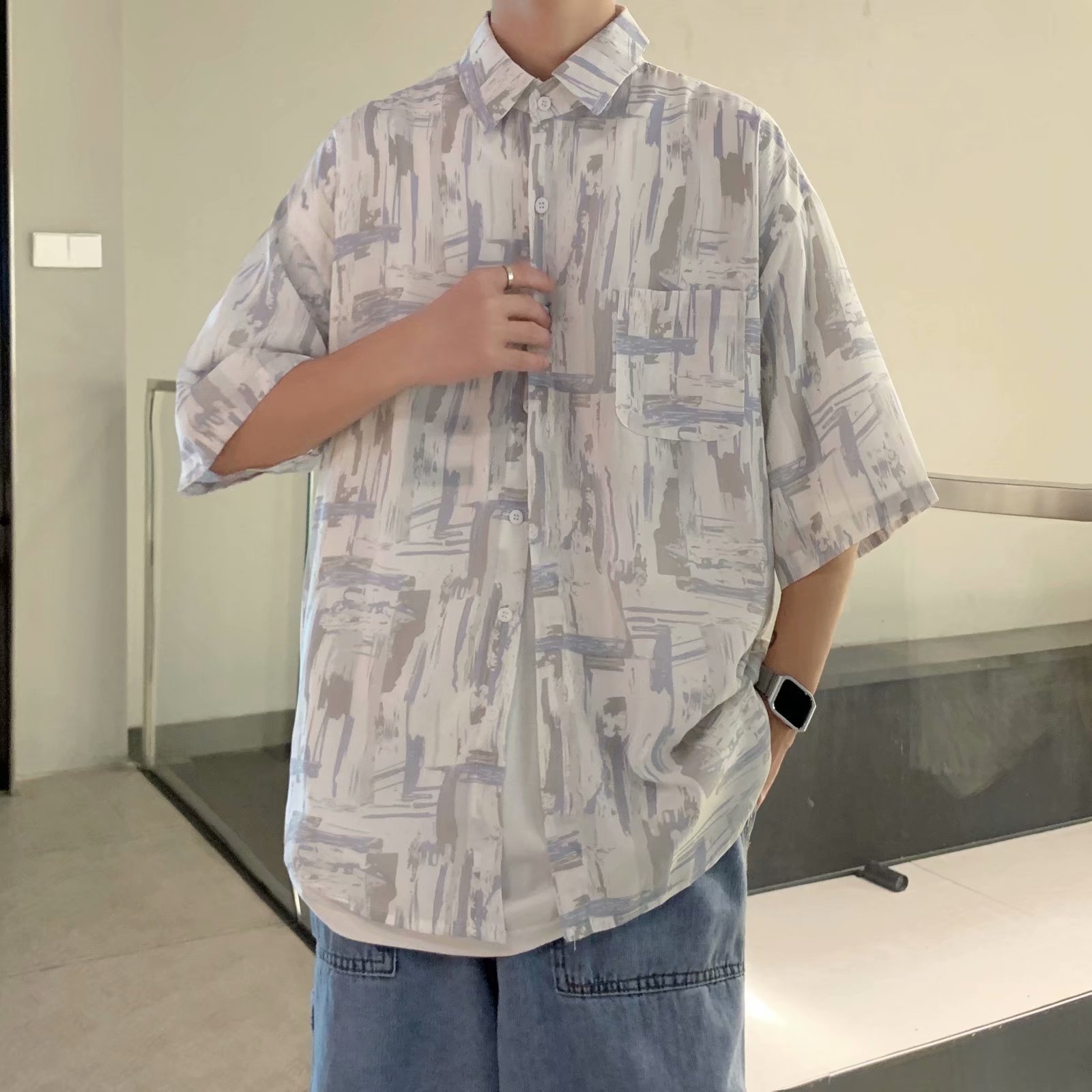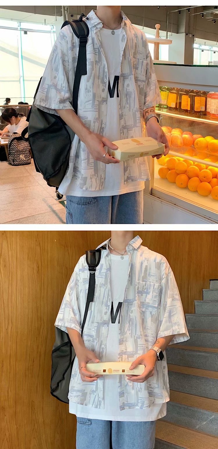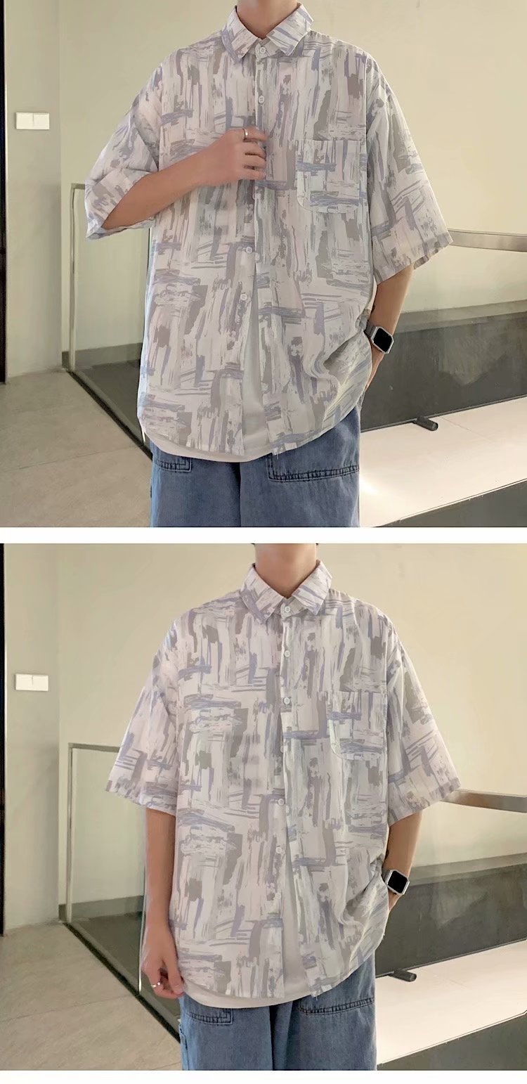 实拍痞帅衬衫男短袖设计感花衬衣男夏季ins港风休闲宽松百搭衣服