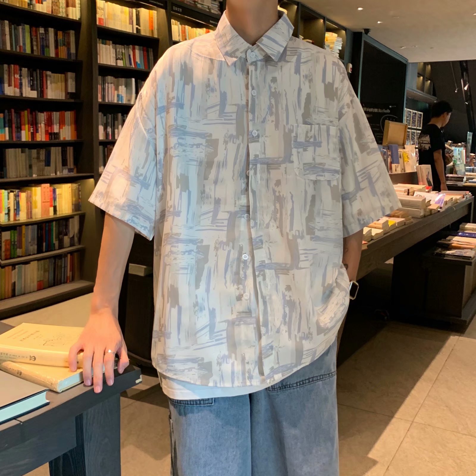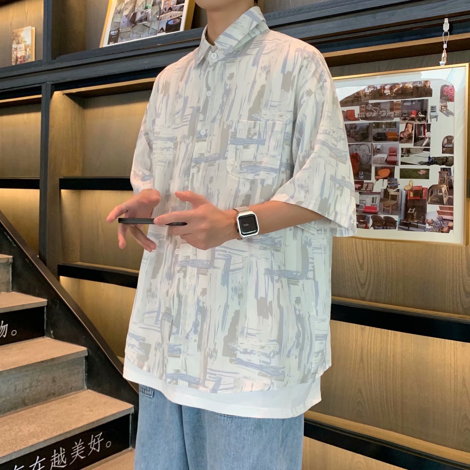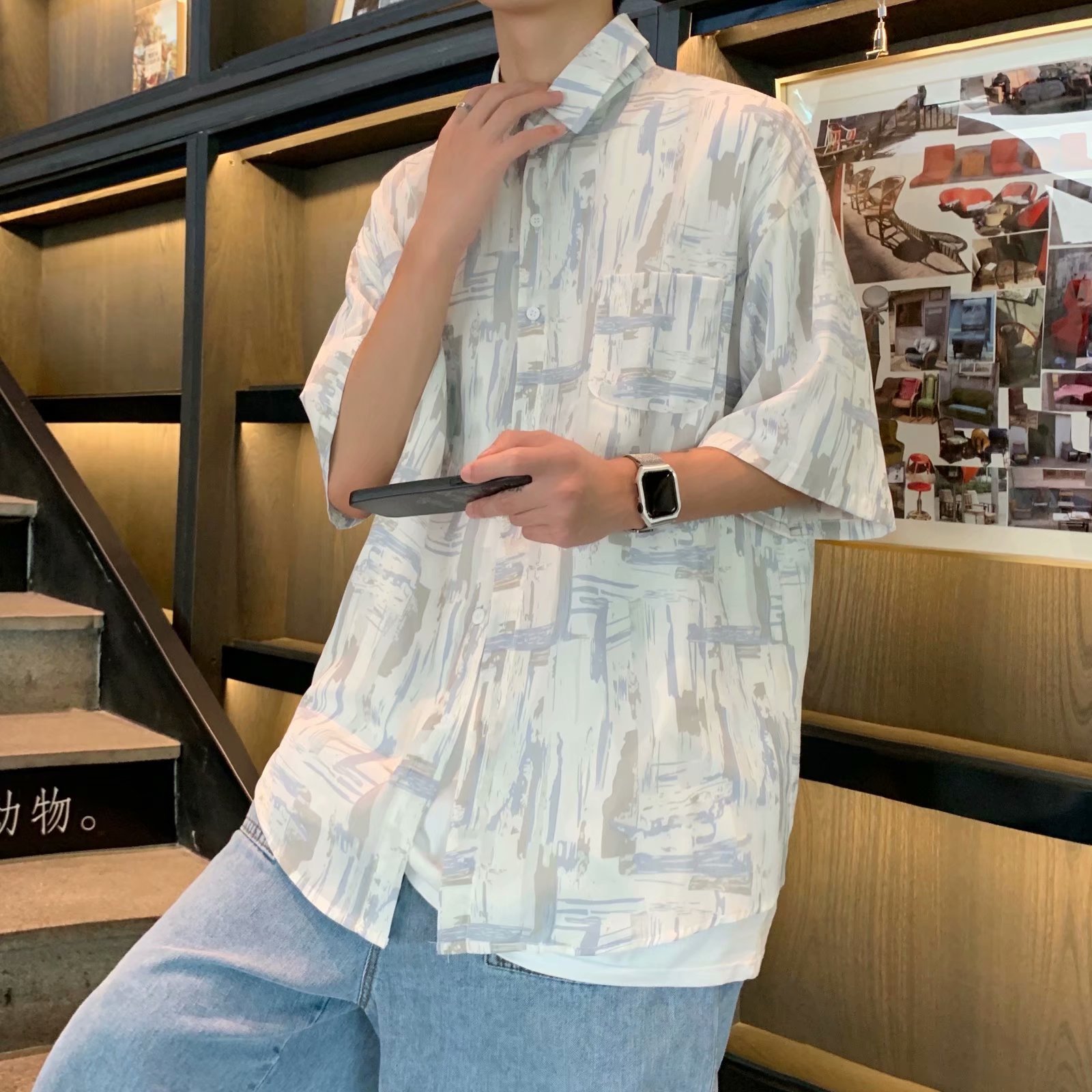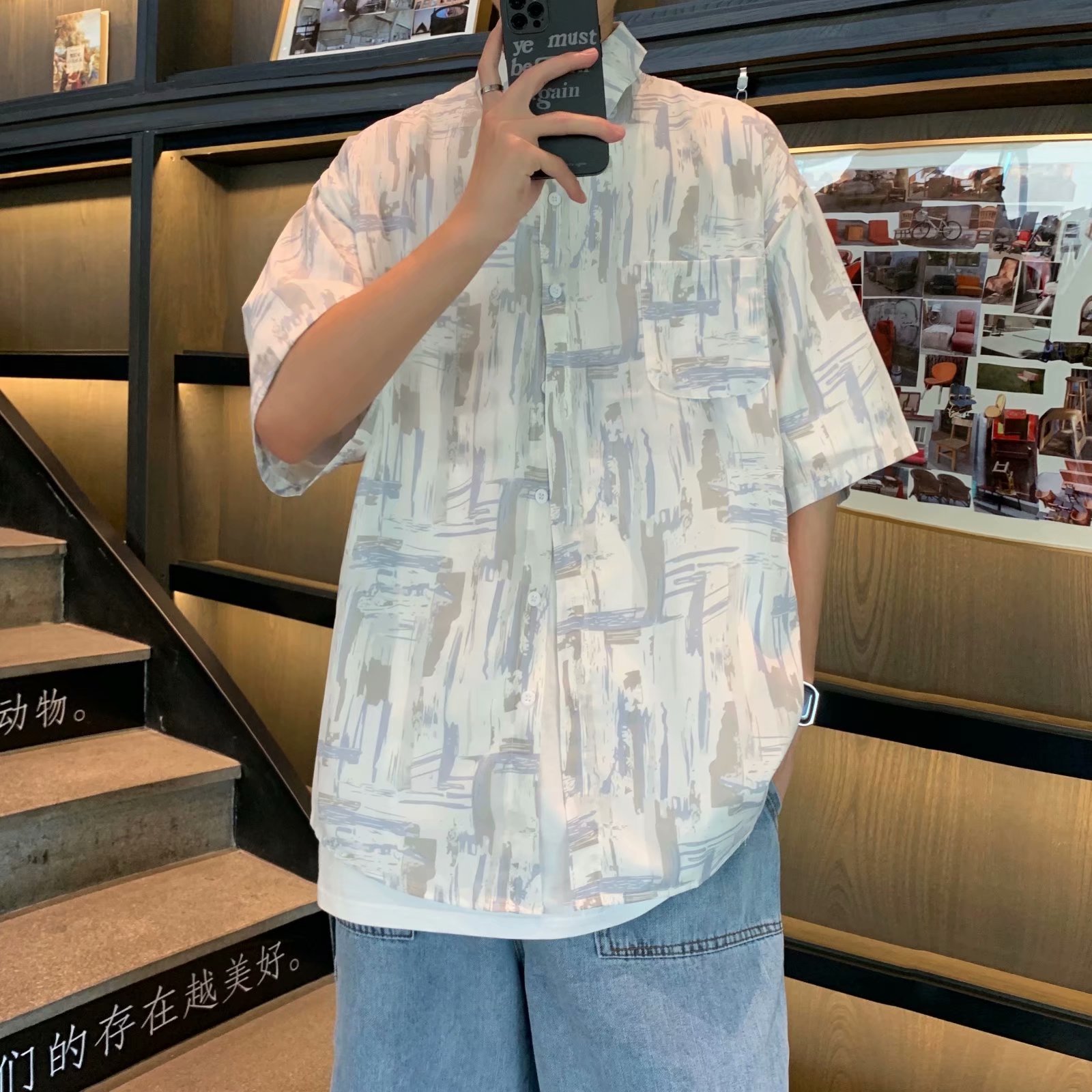 实拍痞帅衬衫男短袖设计感花衬衣男夏季ins港风休闲宽松百搭衣服