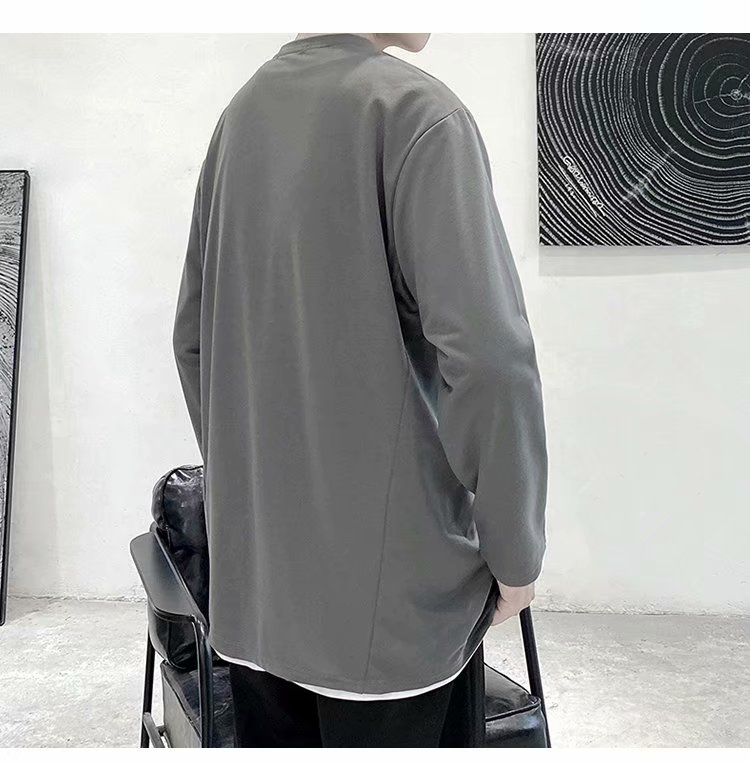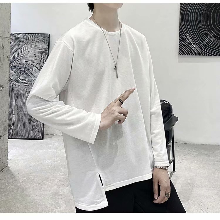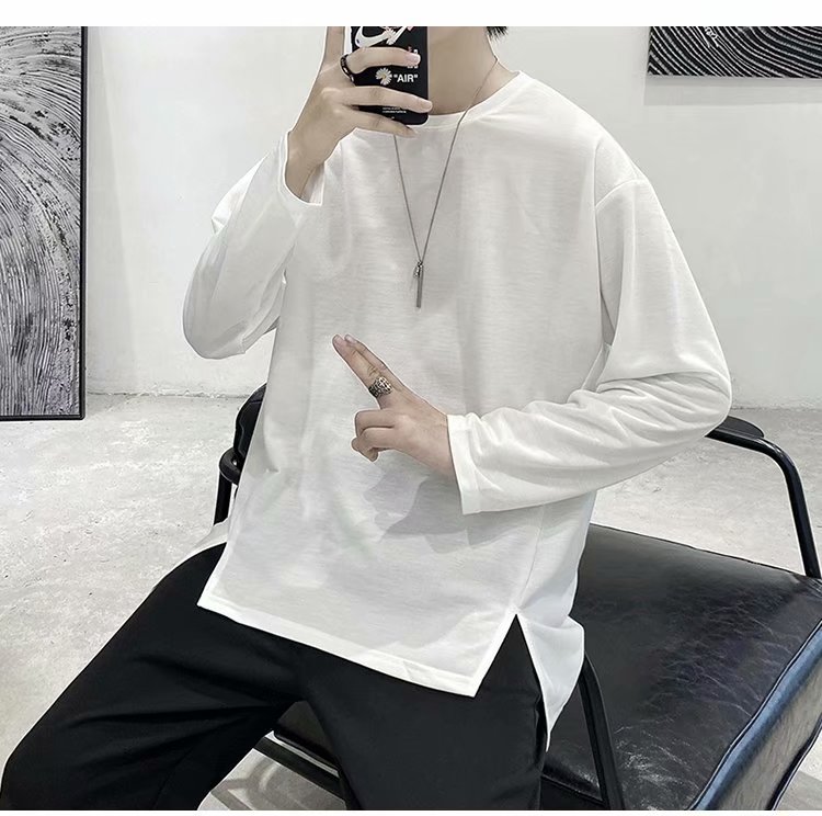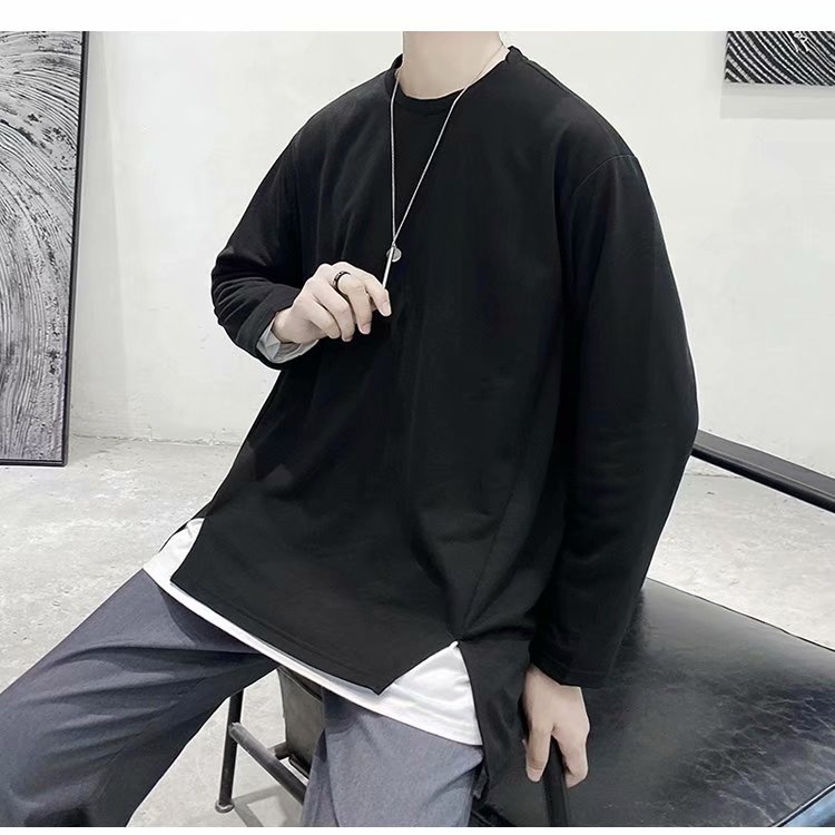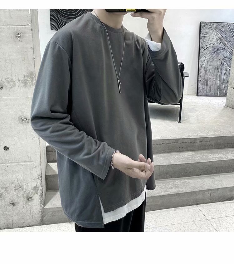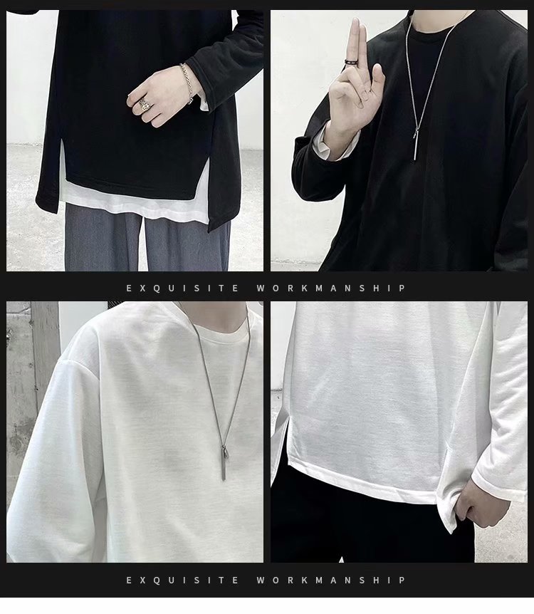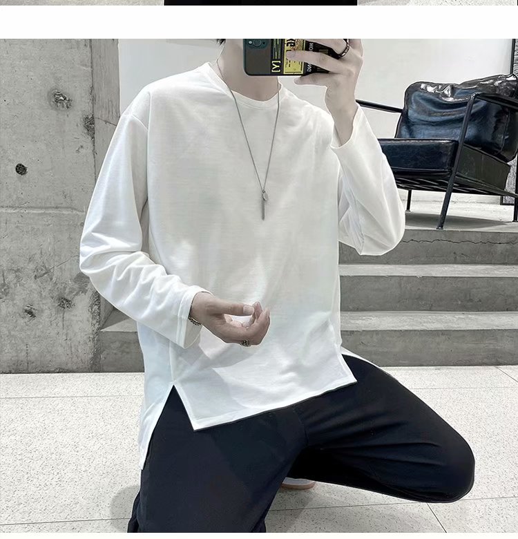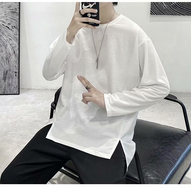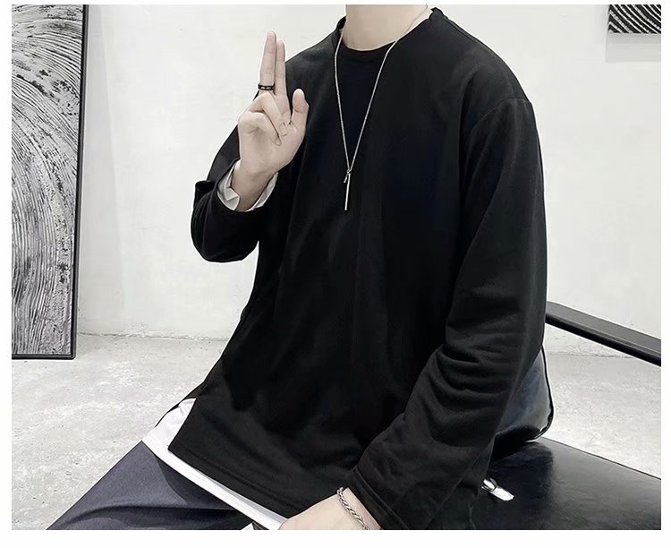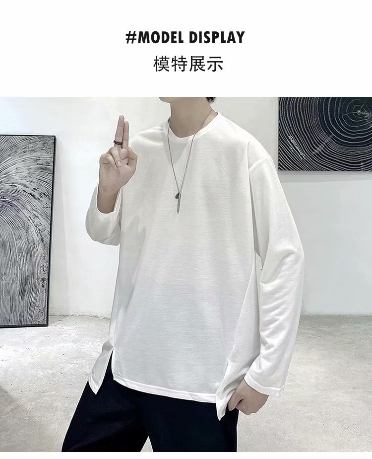 实拍 港风街头百搭纯色长袖T恤韩版潮流宽松落肩圆领上衣男