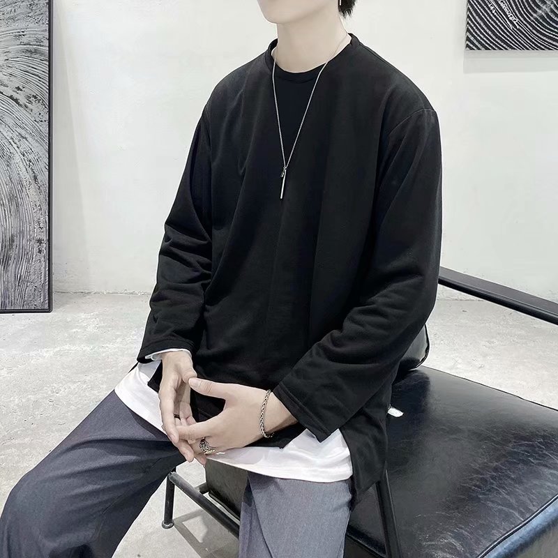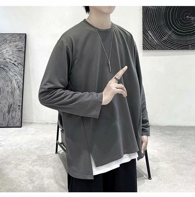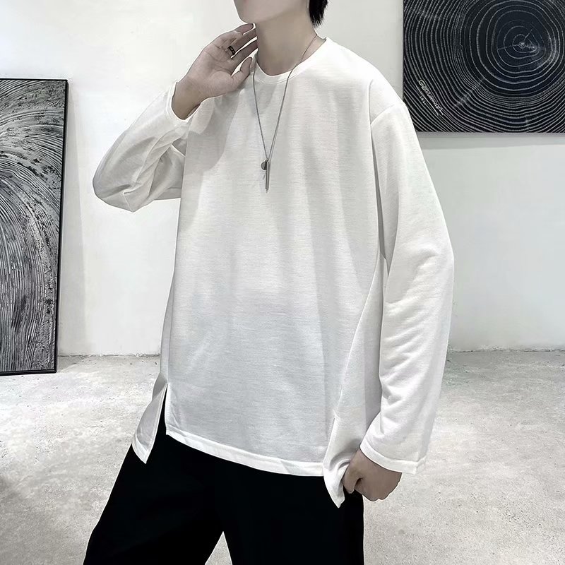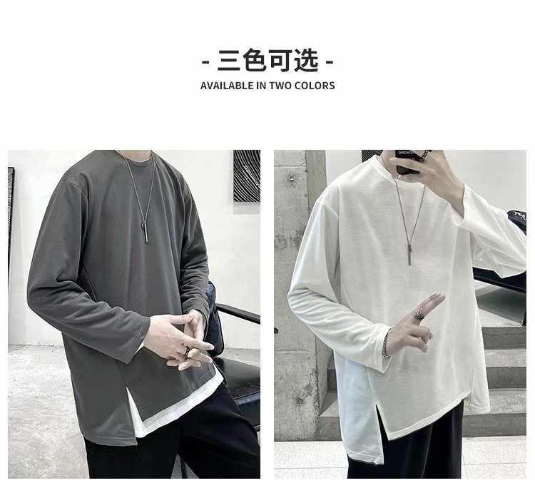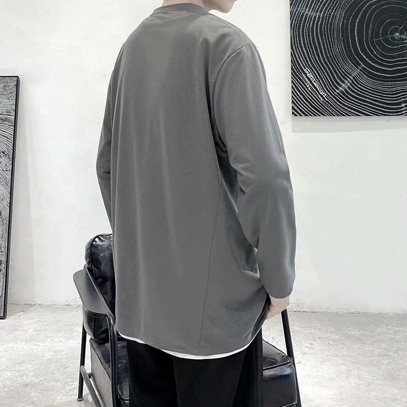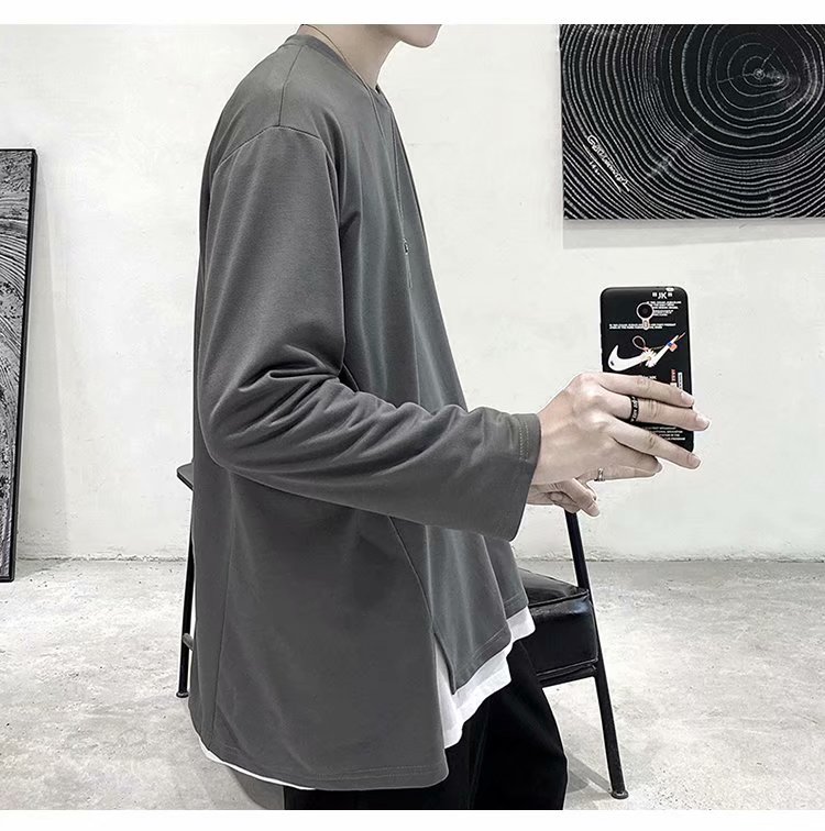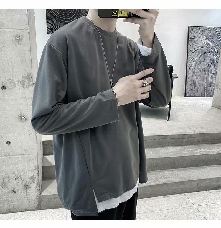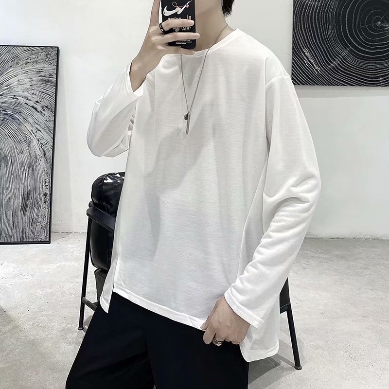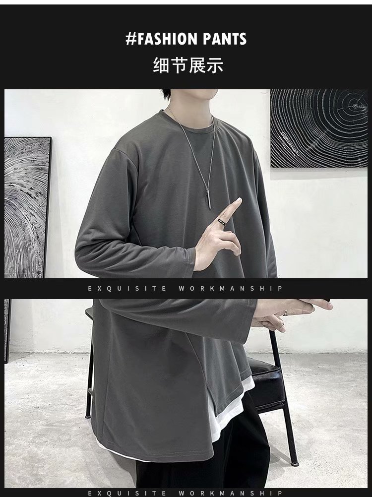 实拍 港风街头百搭纯色长袖T恤韩版潮流宽松落肩圆领上衣男