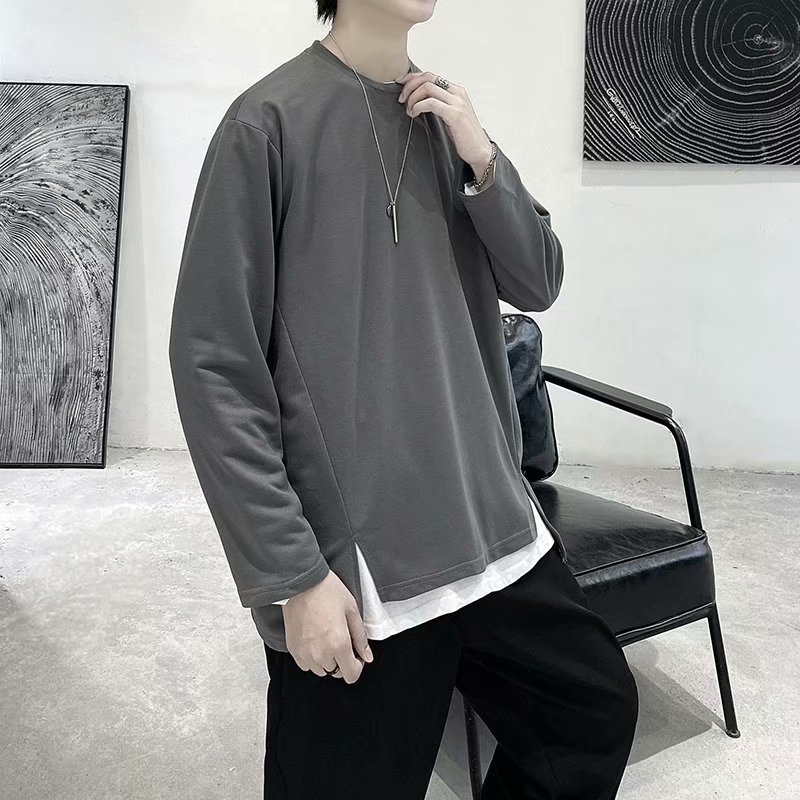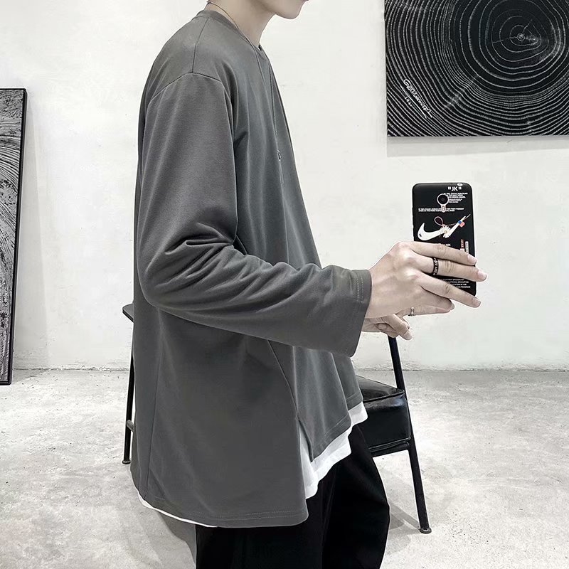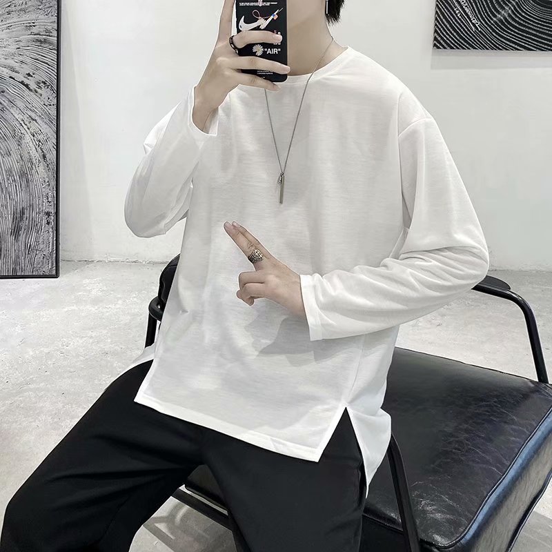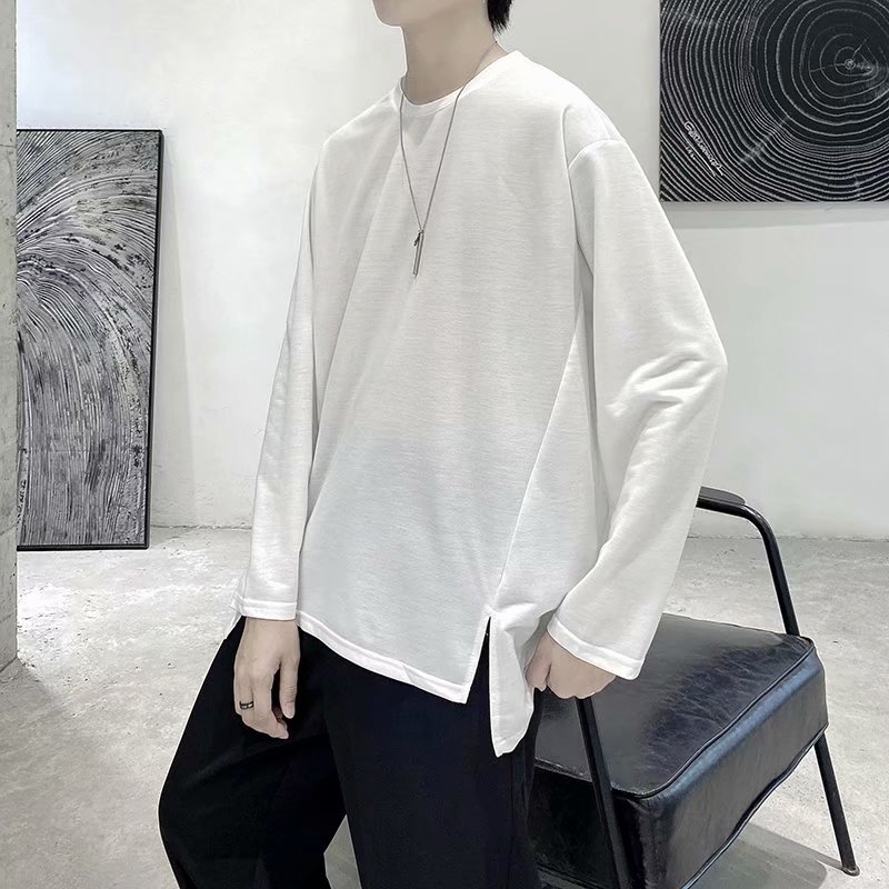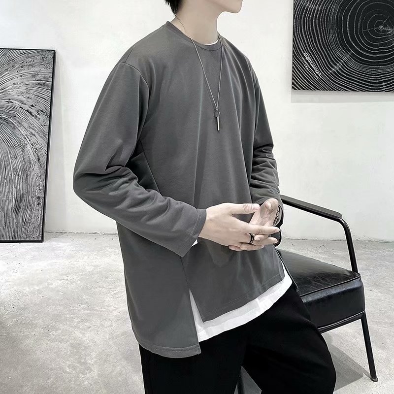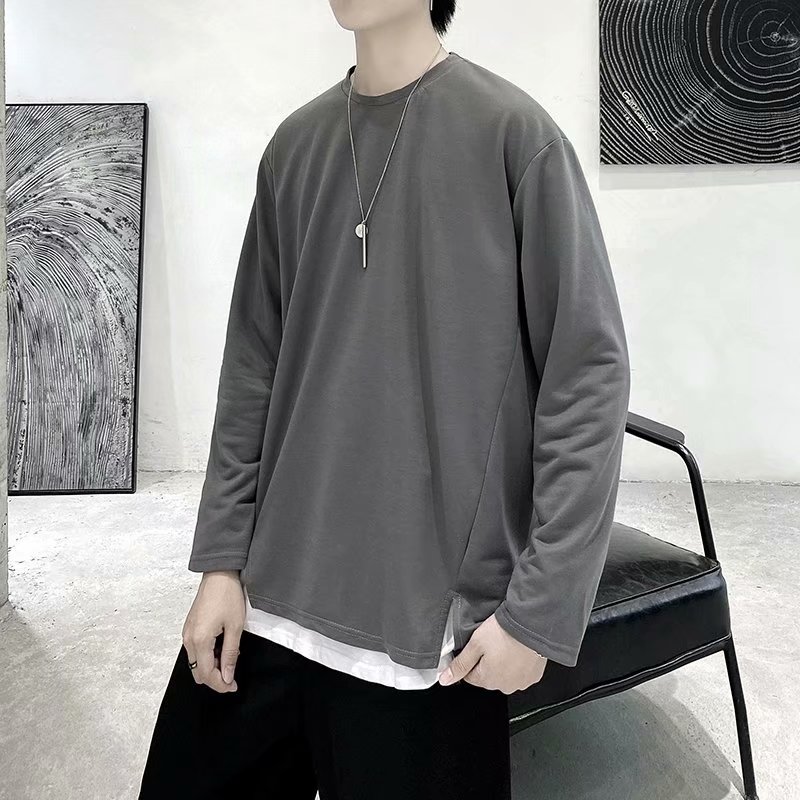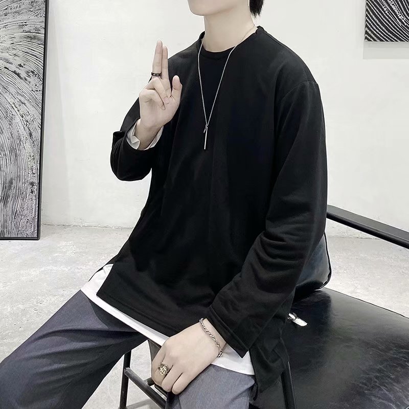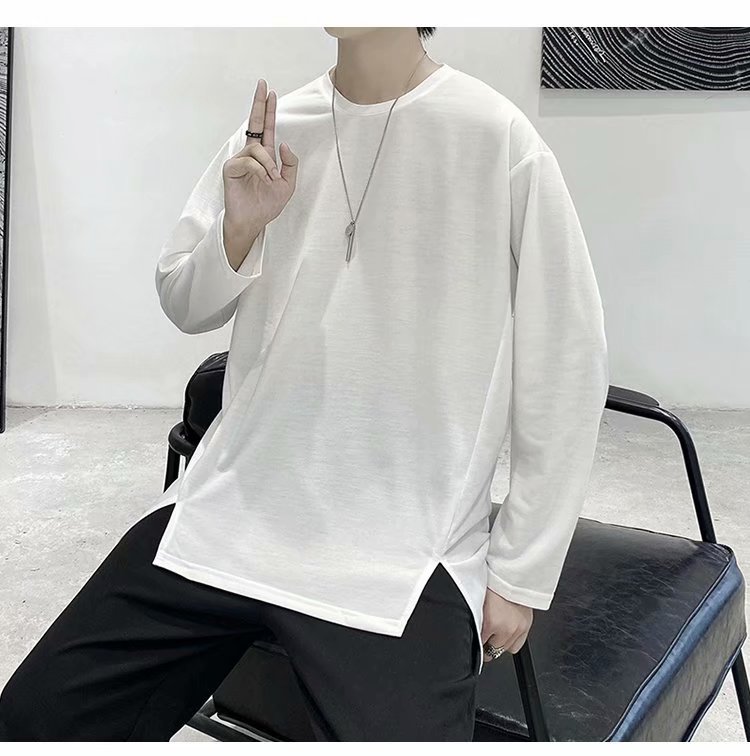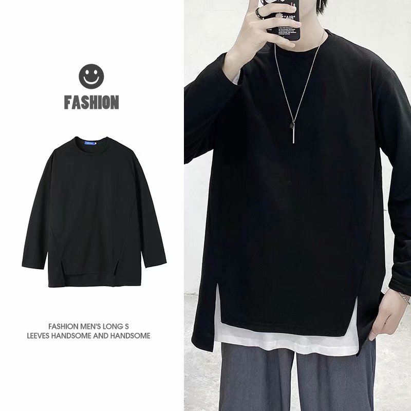 实拍 港风街头百搭纯色长袖T恤韩版潮流宽松落肩圆领上衣男