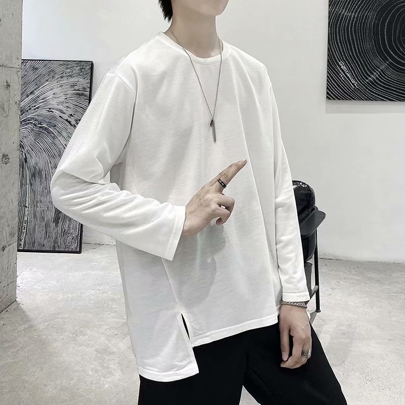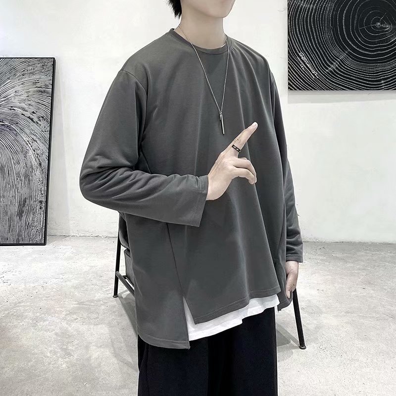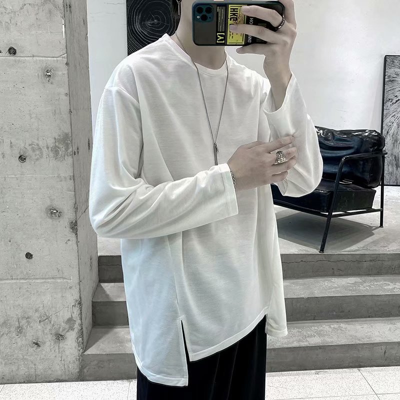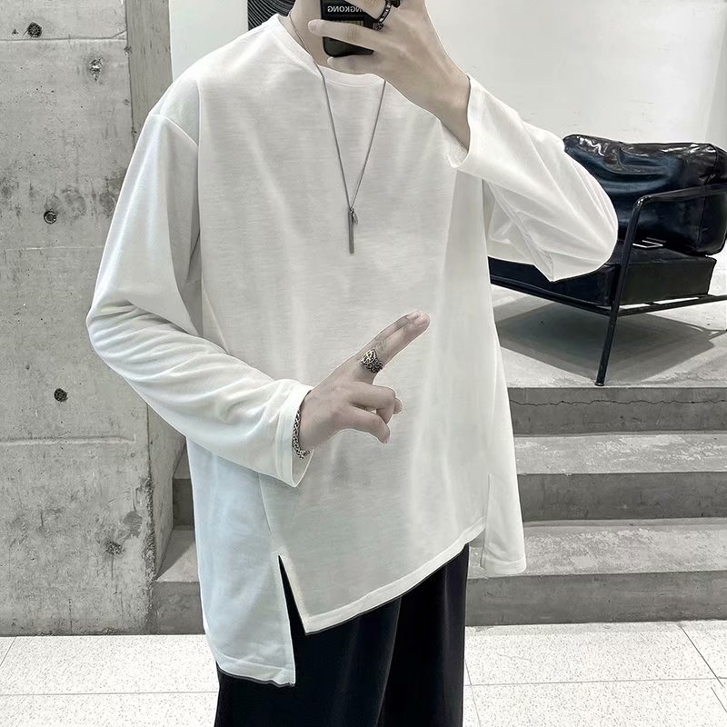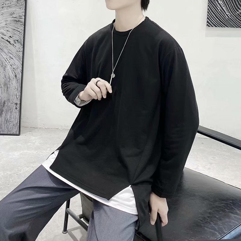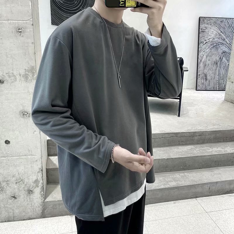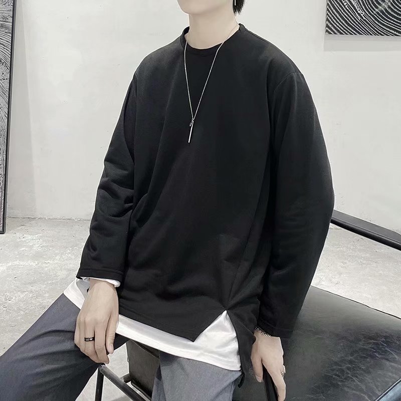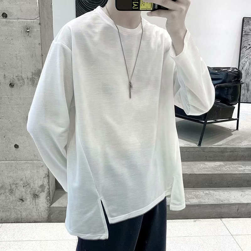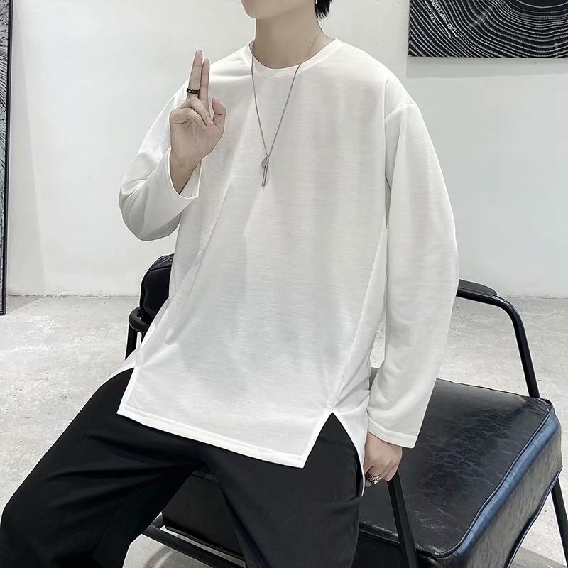 实拍 港风街头百搭纯色长袖T恤韩版潮流宽松落肩圆领上衣男