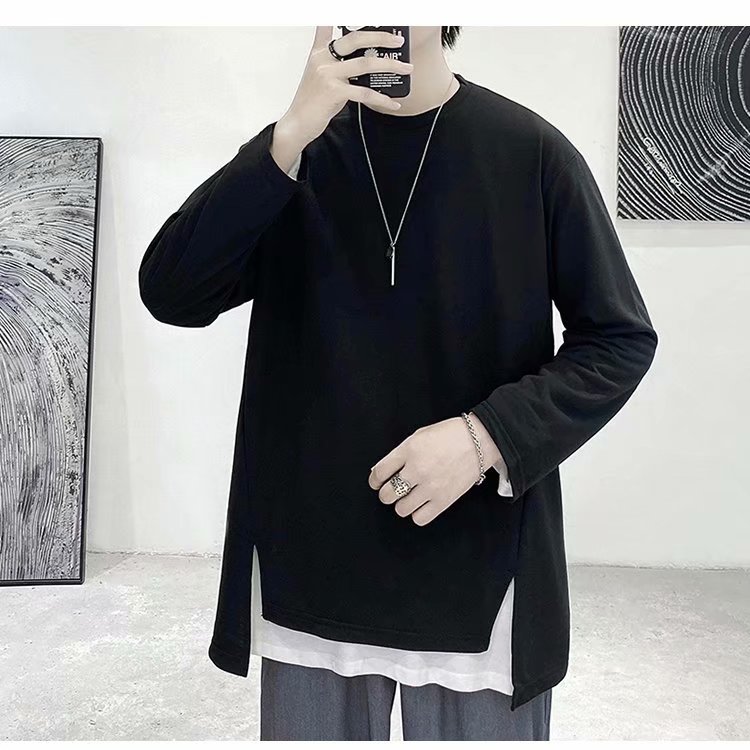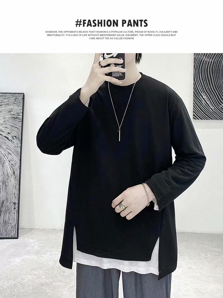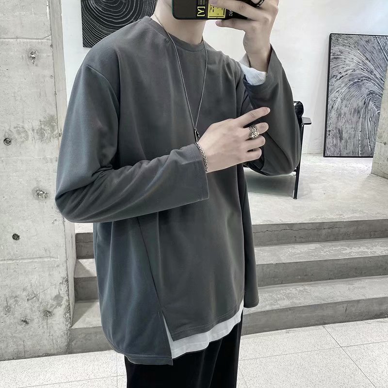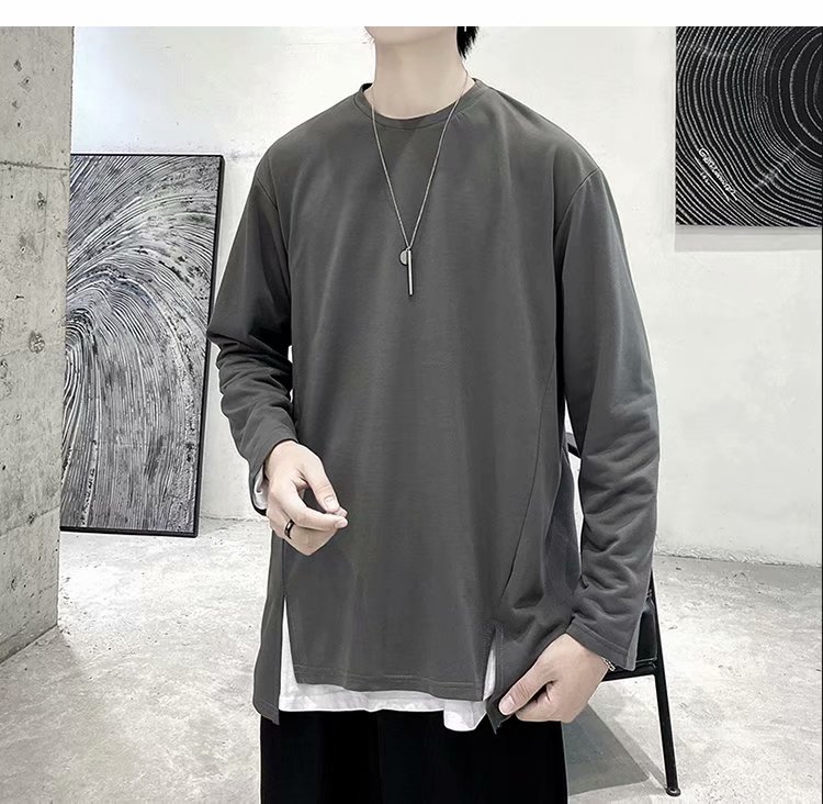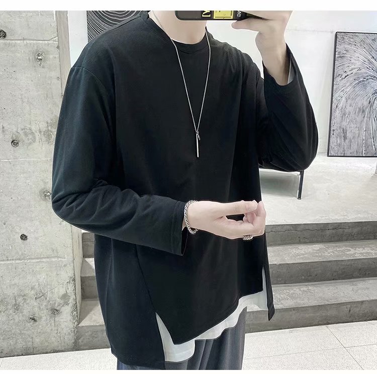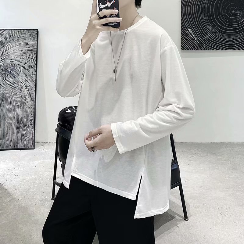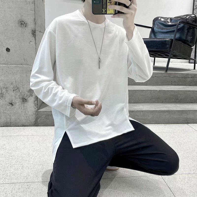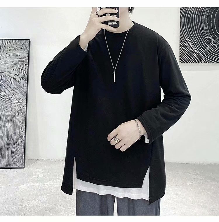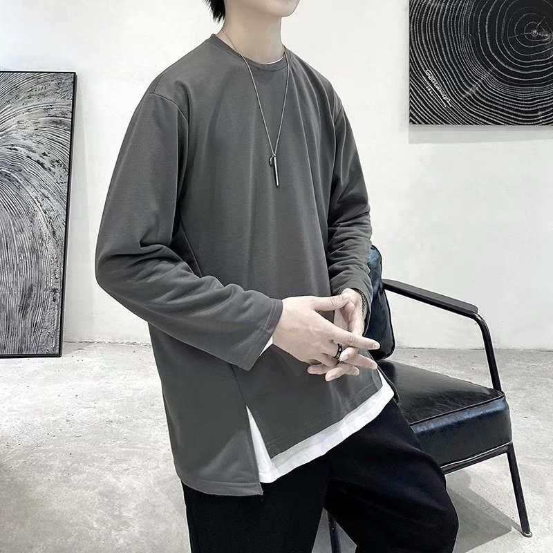 实拍 港风街头百搭纯色长袖T恤韩版潮流宽松落肩圆领上衣男