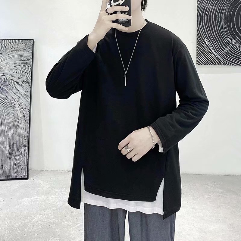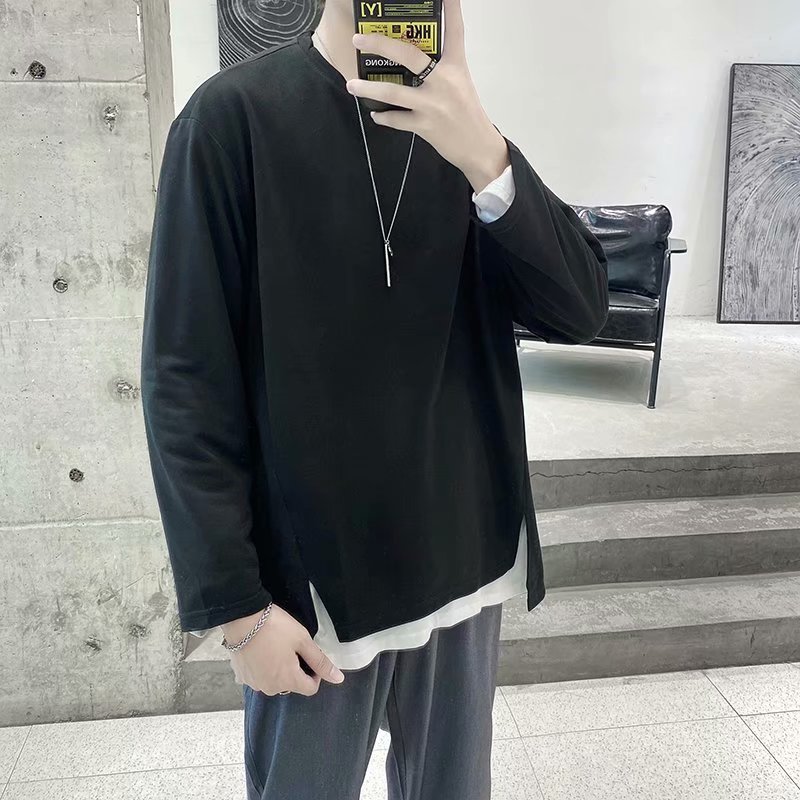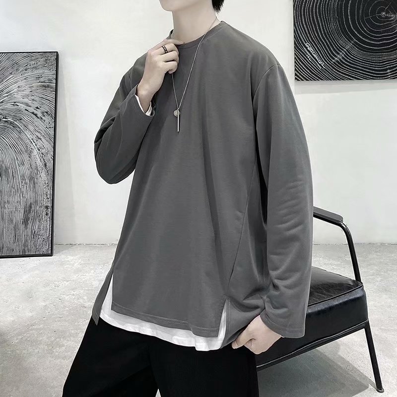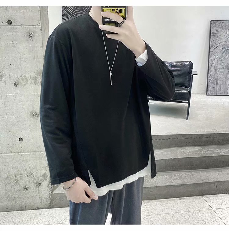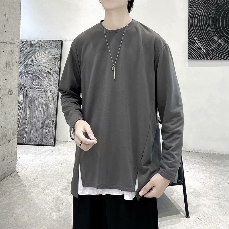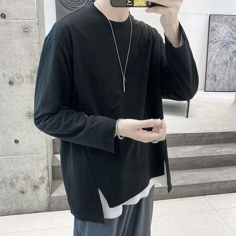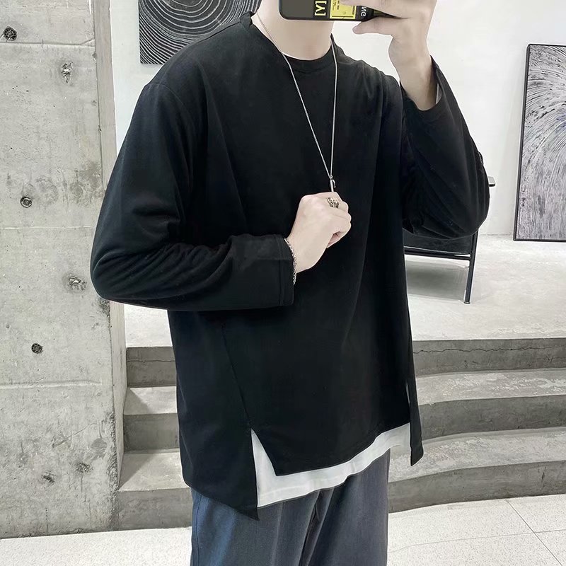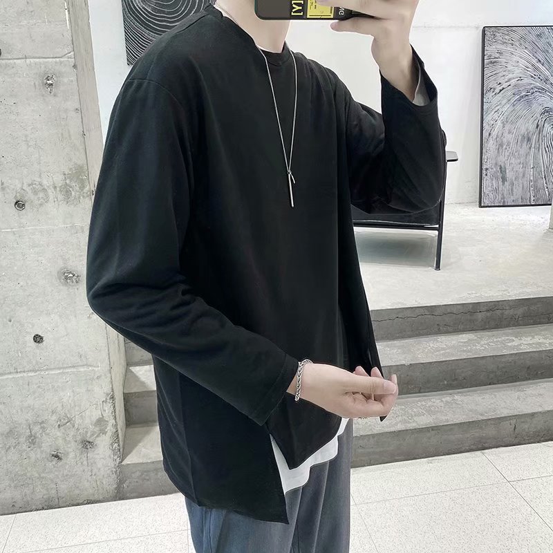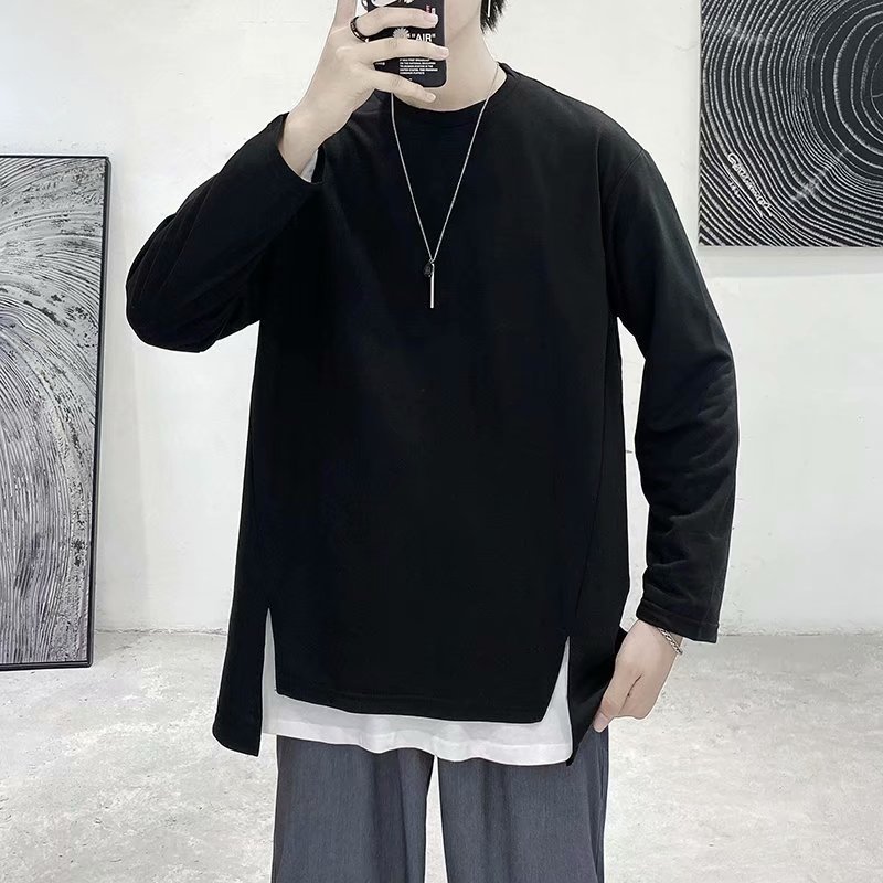 实拍 港风街头百搭纯色长袖T恤韩版潮流宽松落肩圆领上衣男