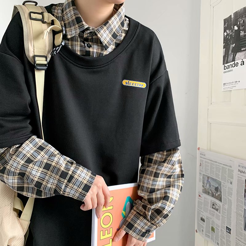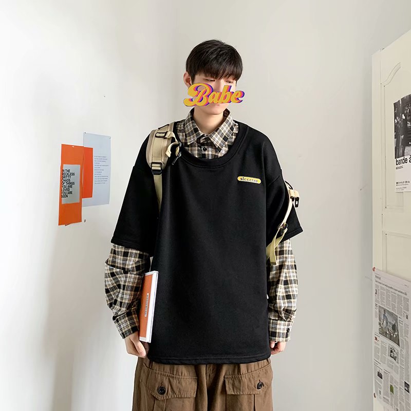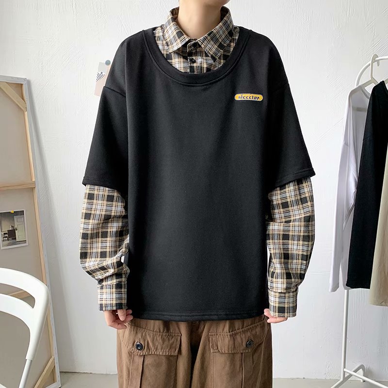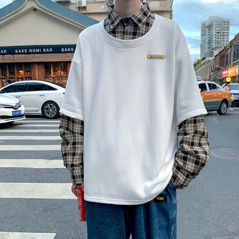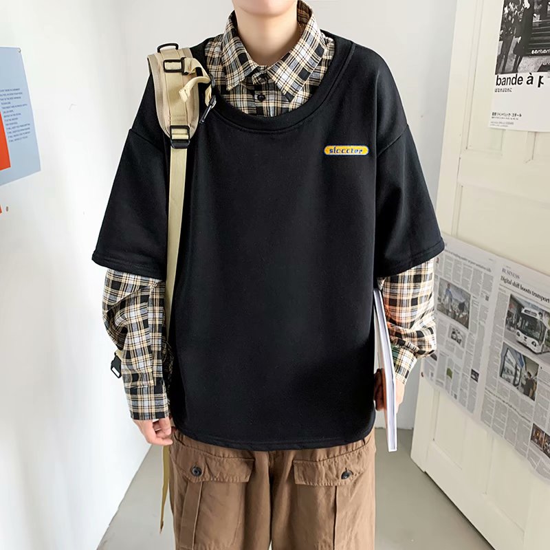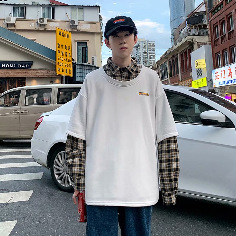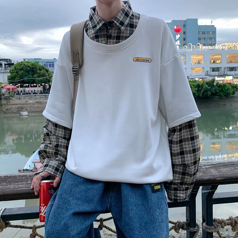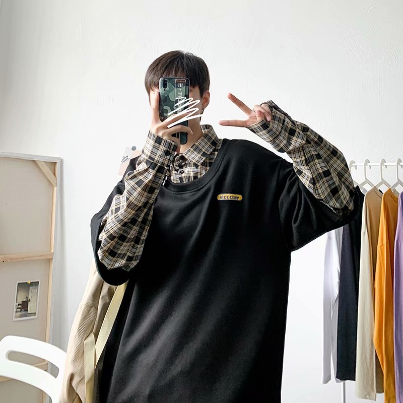 实拍 韩版潮流假两件百搭上衣港风街头宽松学生时尚衬衣男