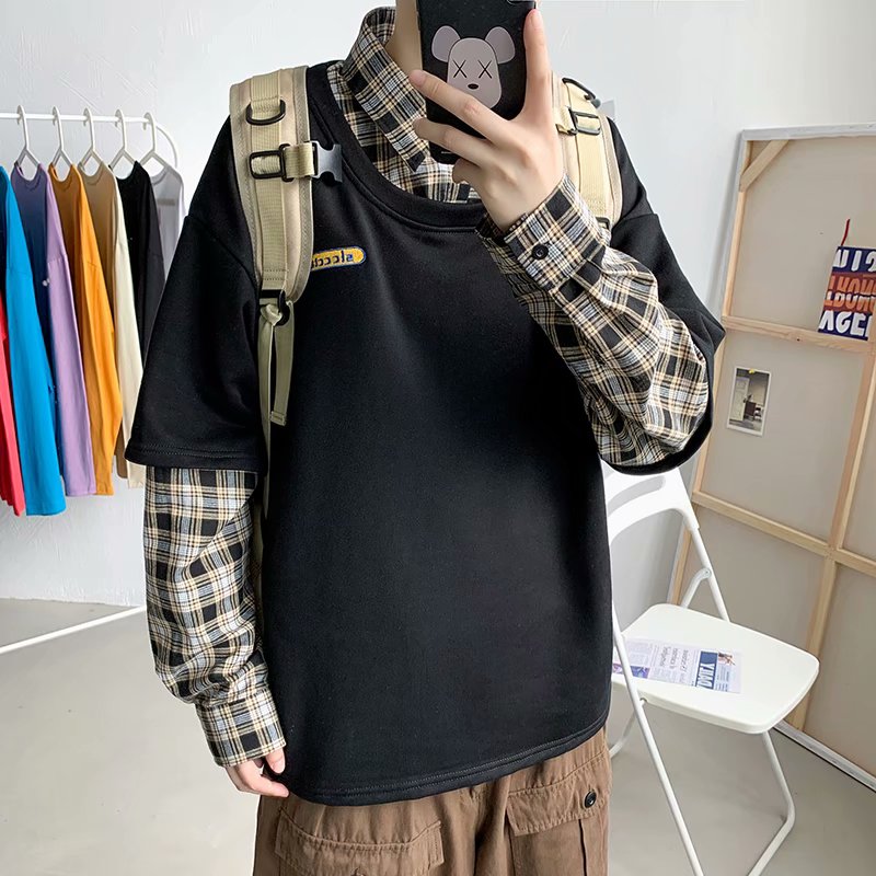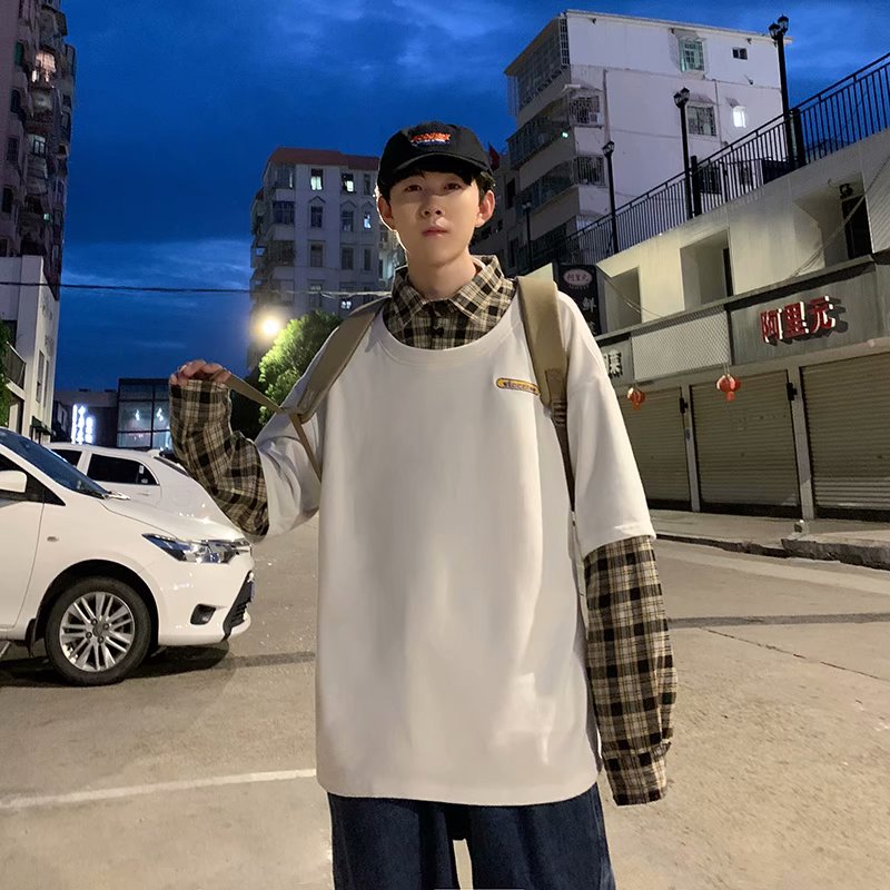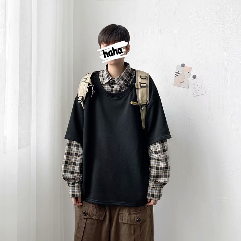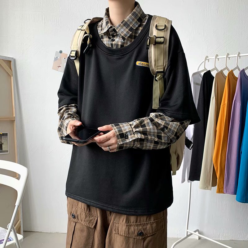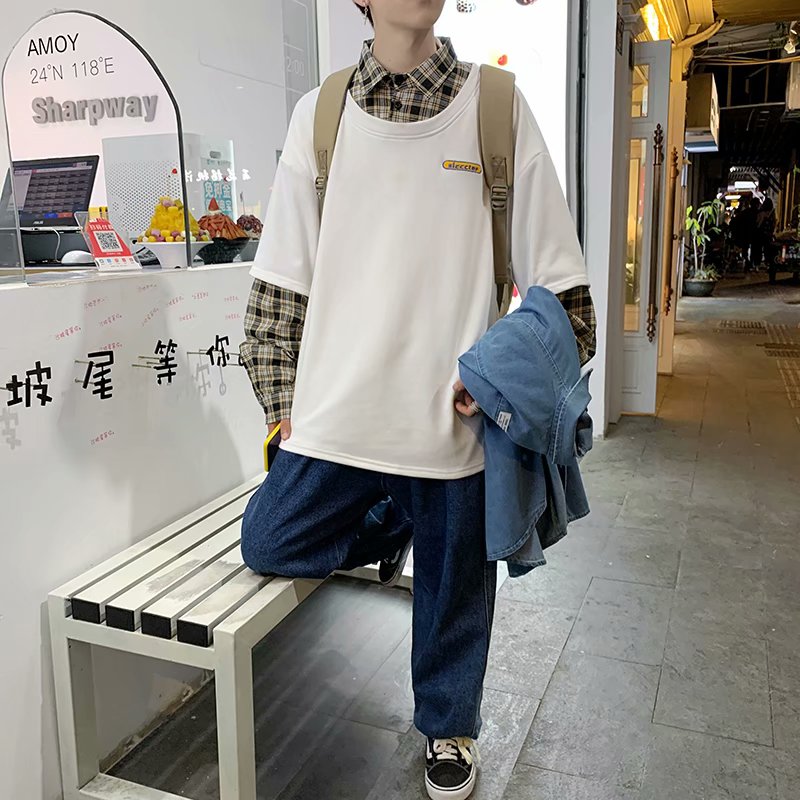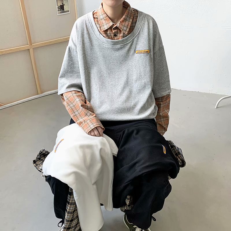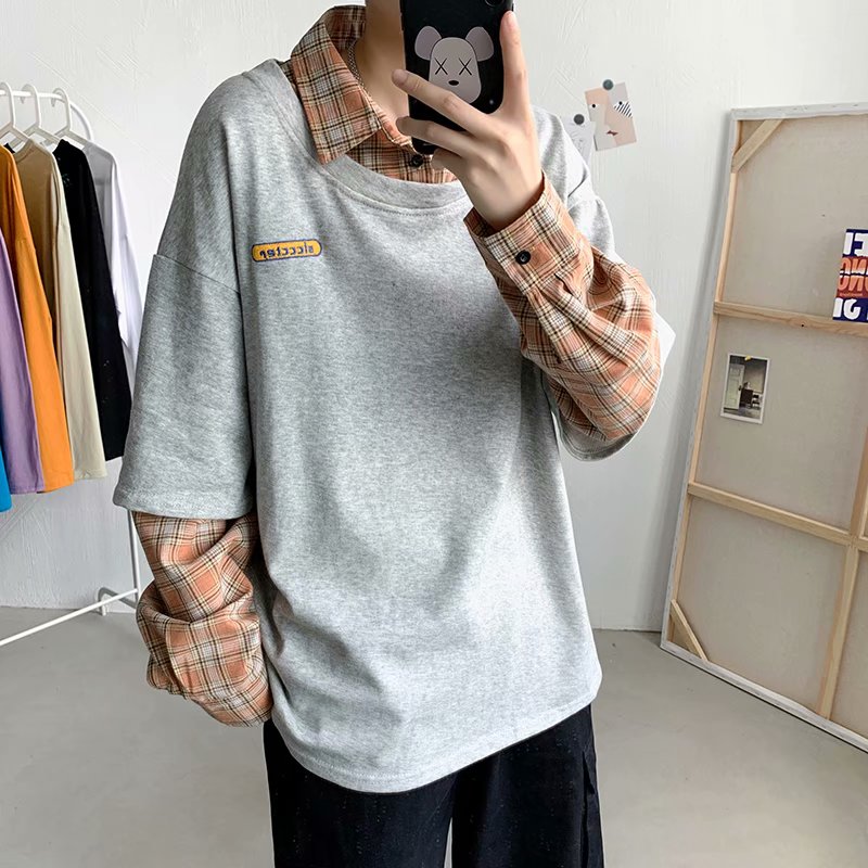 实拍 韩版潮流假两件百搭上衣港风街头宽松学生时尚衬衣男