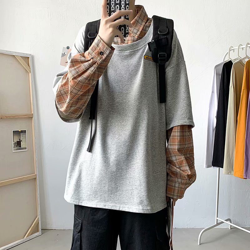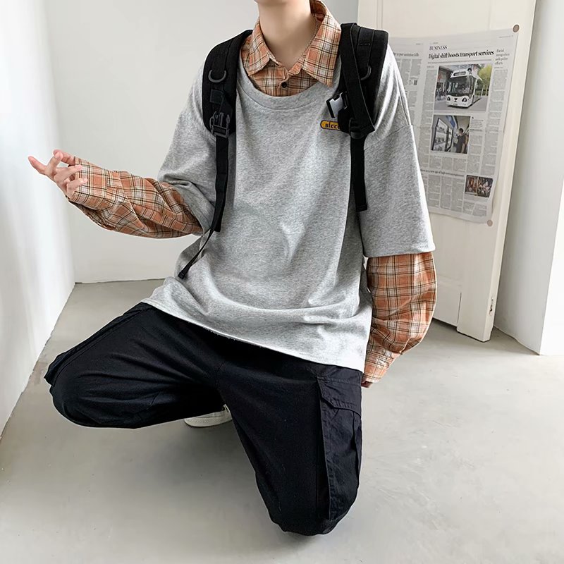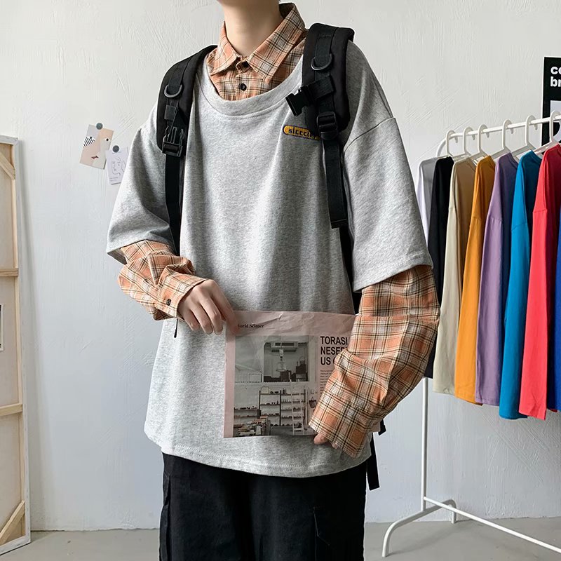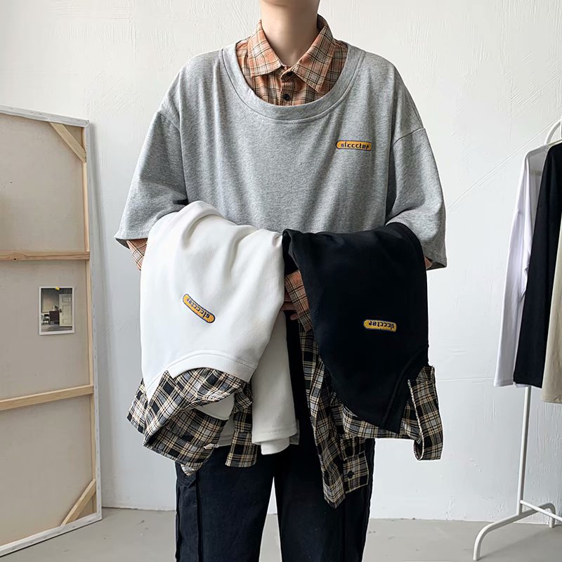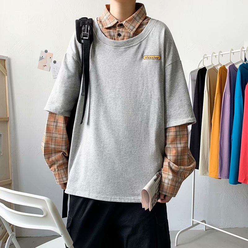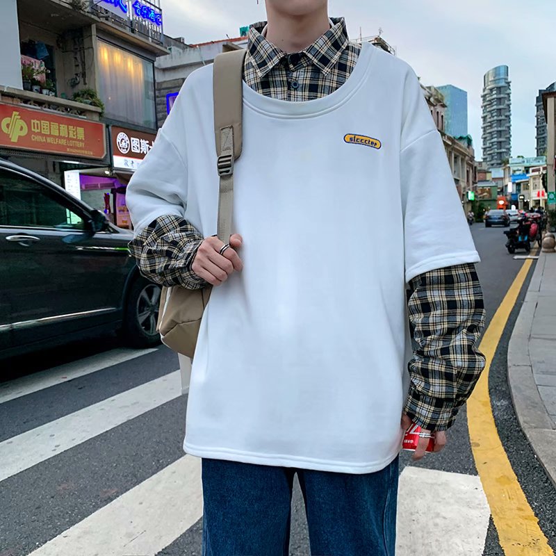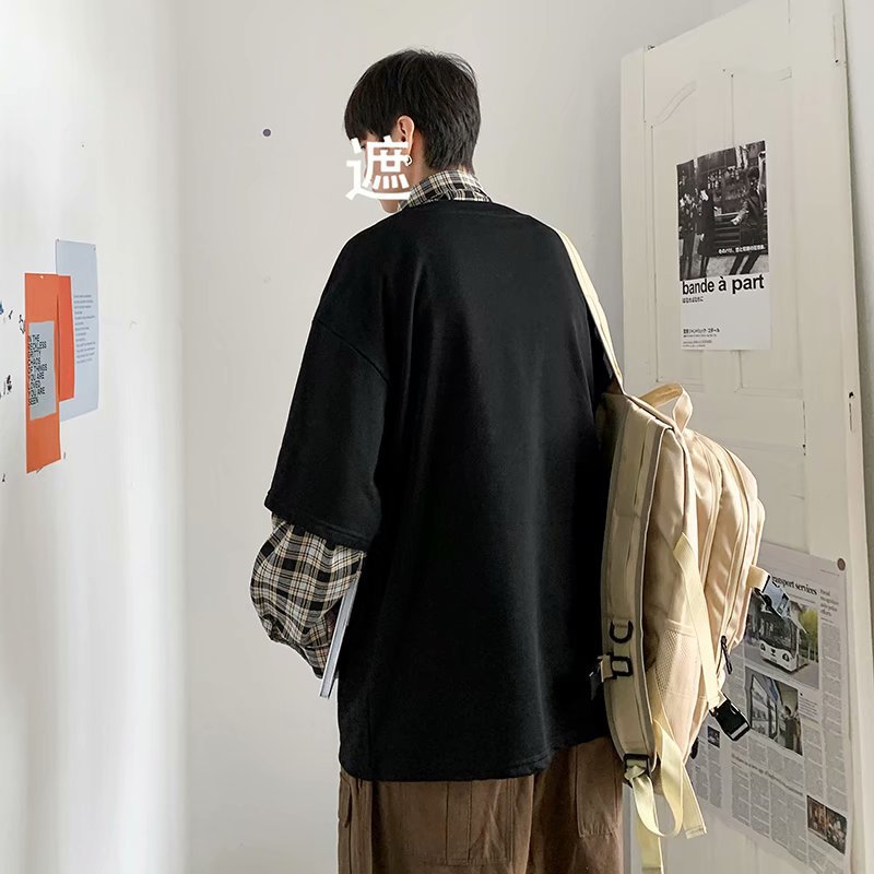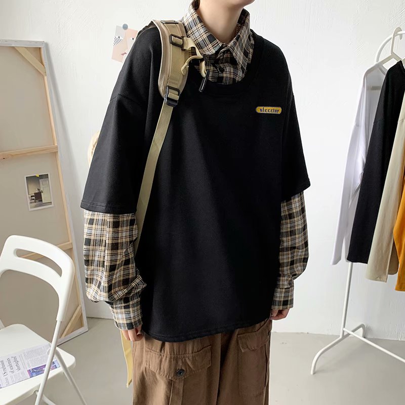 实拍 韩版潮流假两件百搭上衣港风街头宽松学生时尚衬衣男
