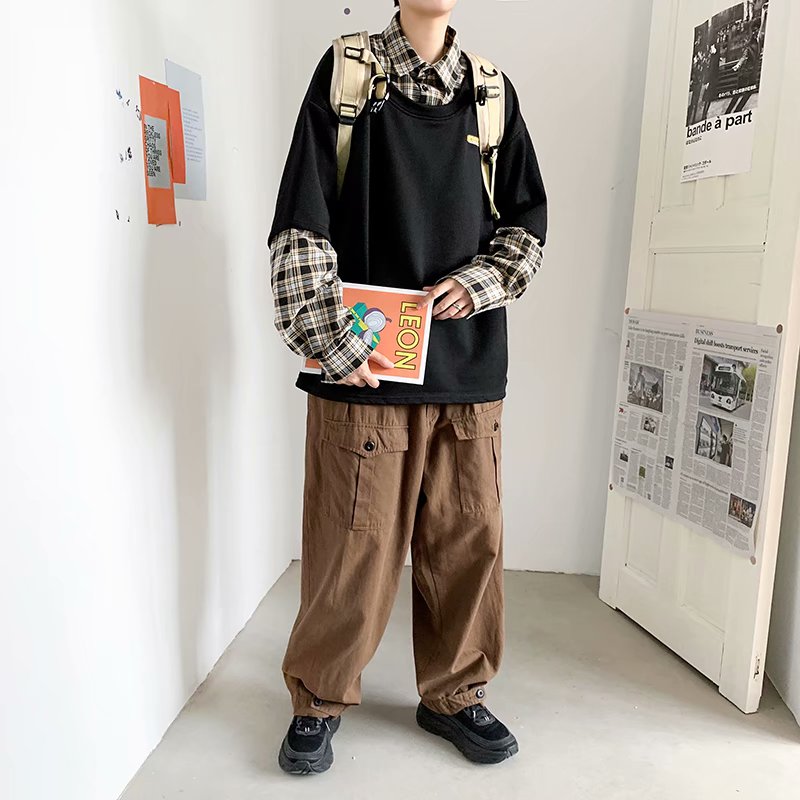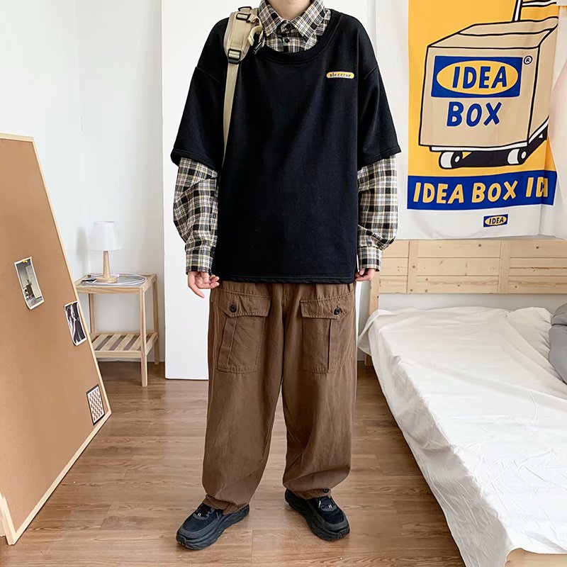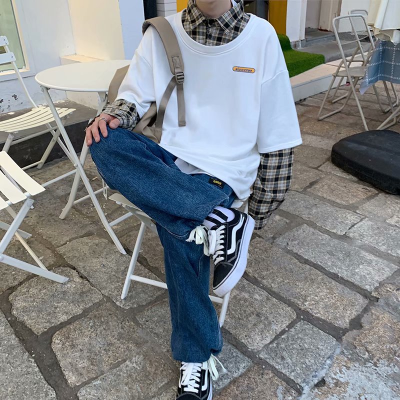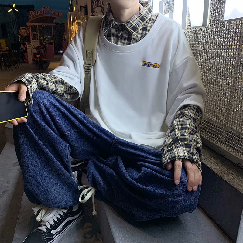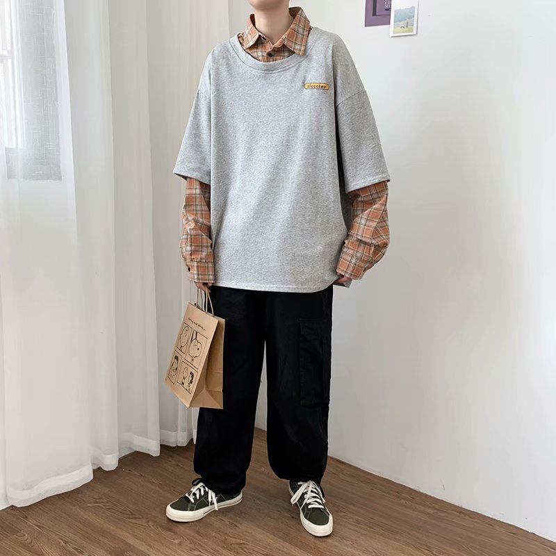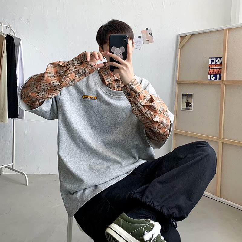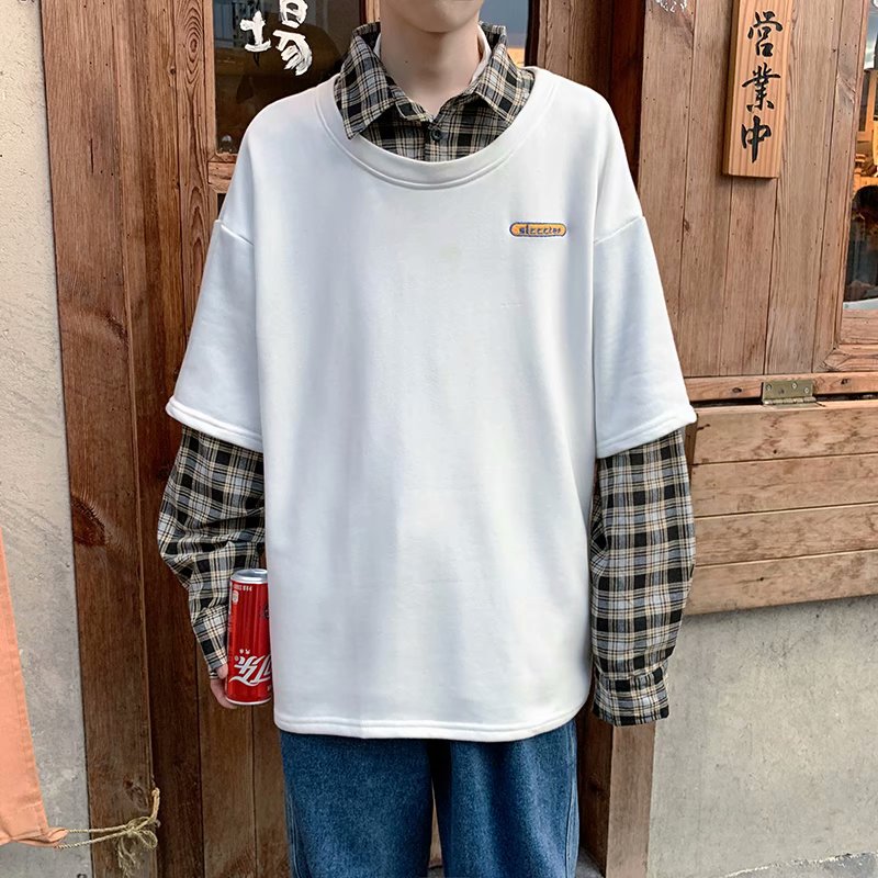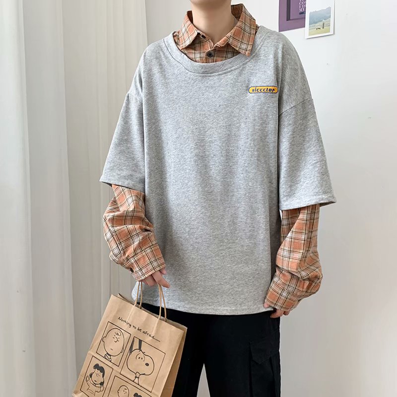 实拍 韩版潮流假两件百搭上衣港风街头宽松学生时尚衬衣男