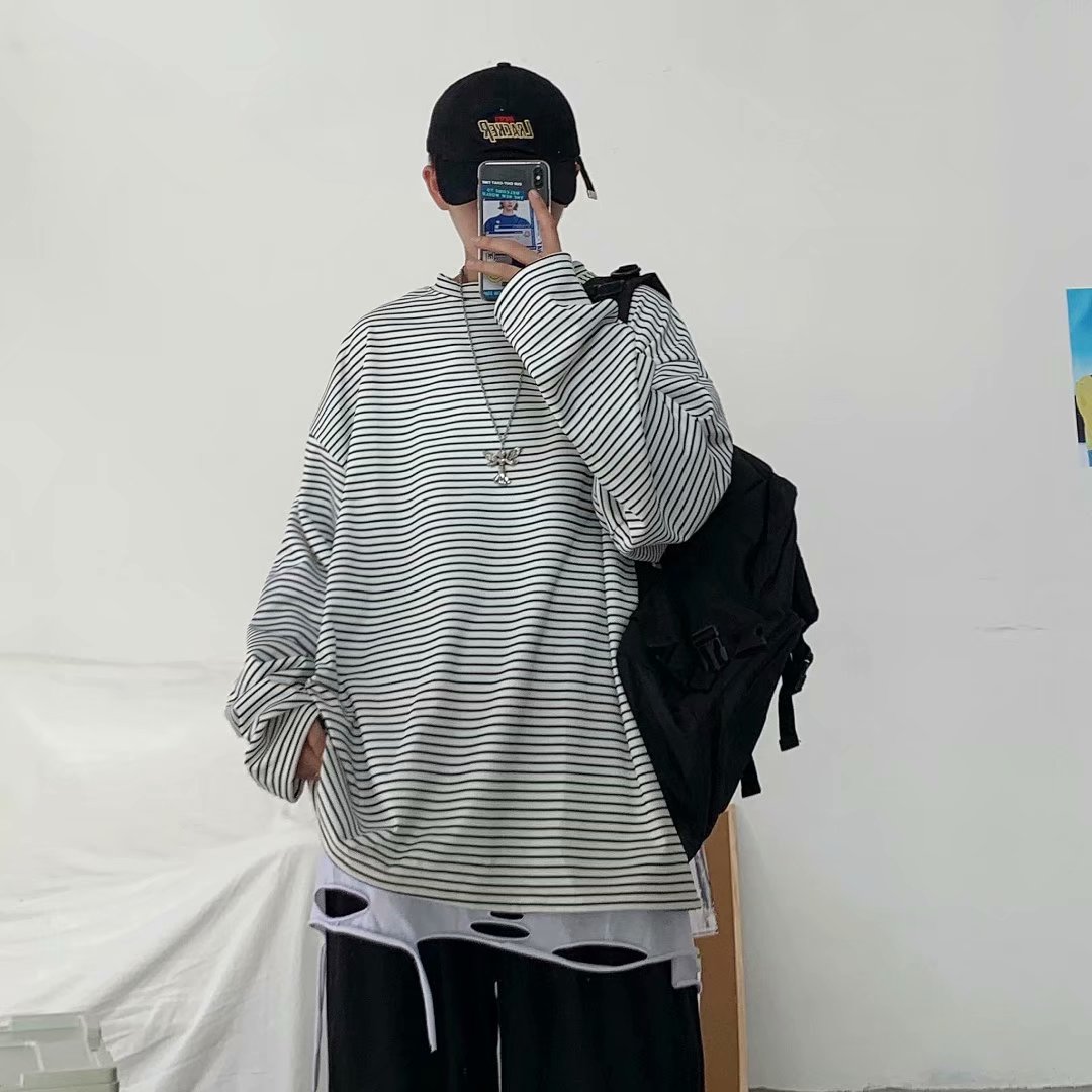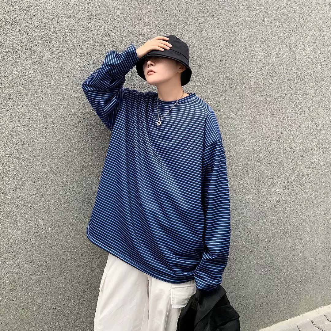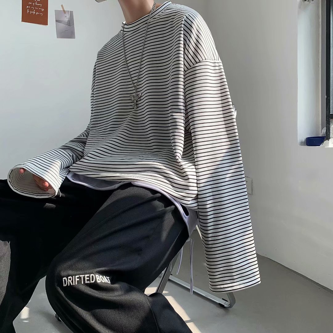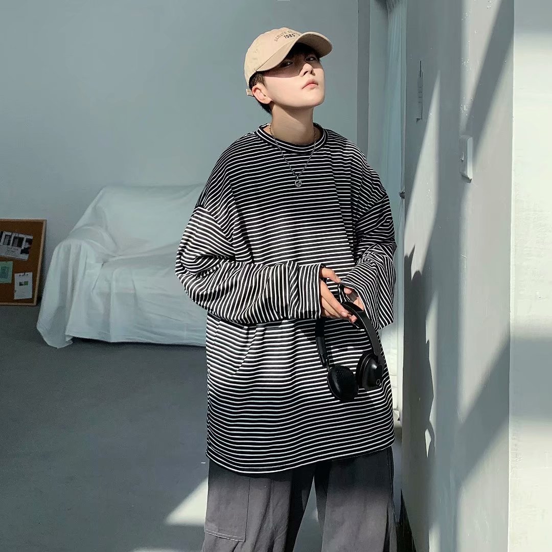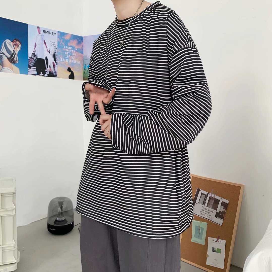 实拍 港风日系简约街头条纹宽松圆领上衣男韩版百搭长袖休闲上衣