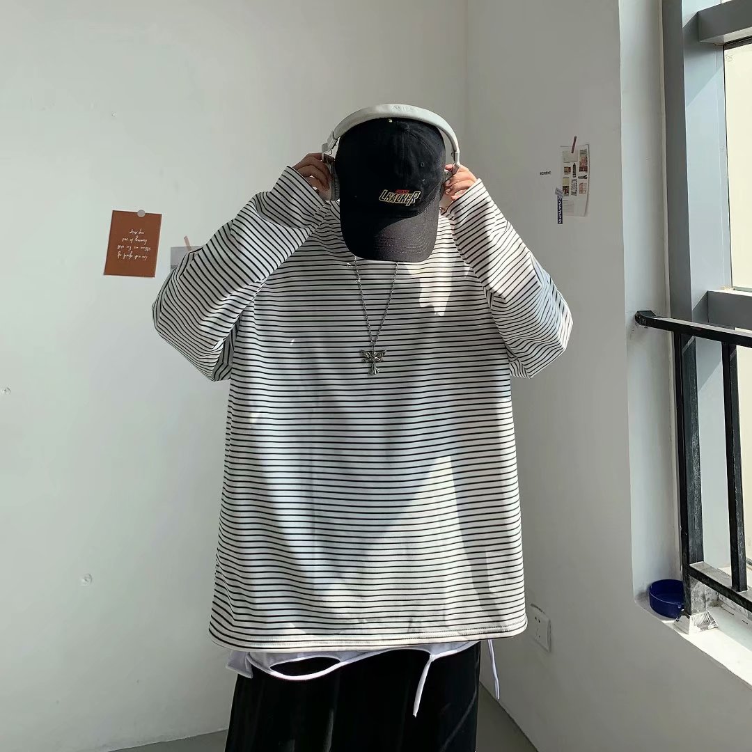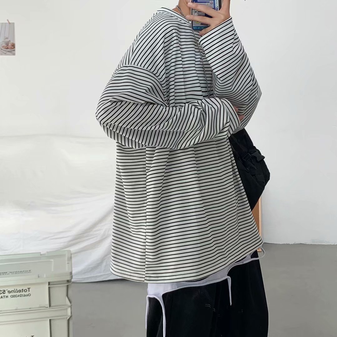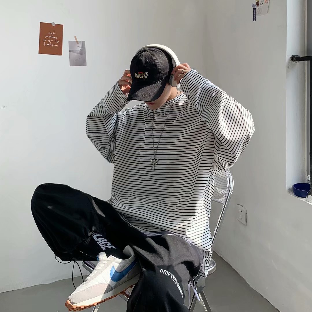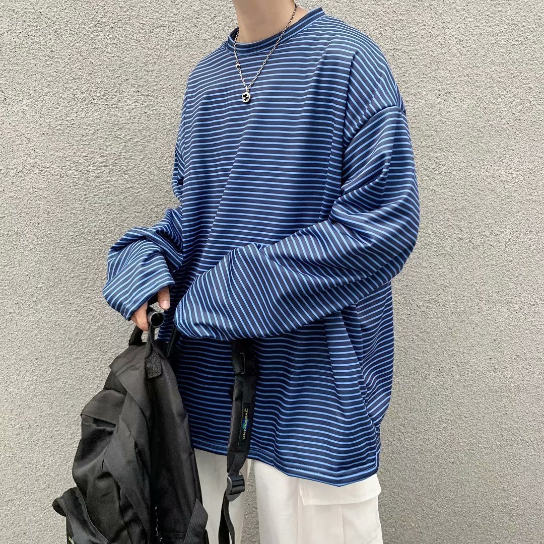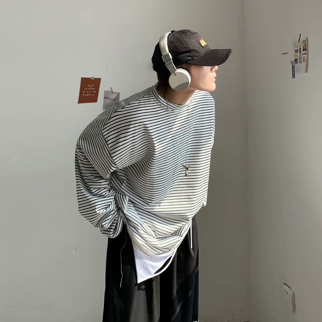 实拍 港风日系简约街头条纹宽松圆领上衣男韩版百搭长袖休闲上衣