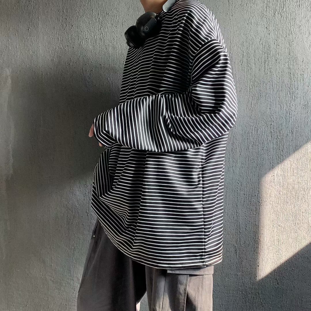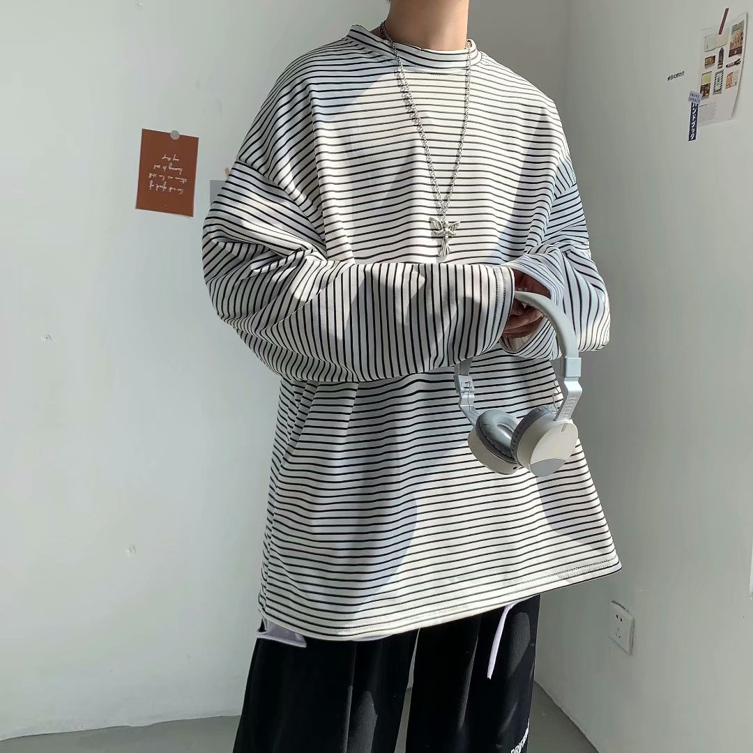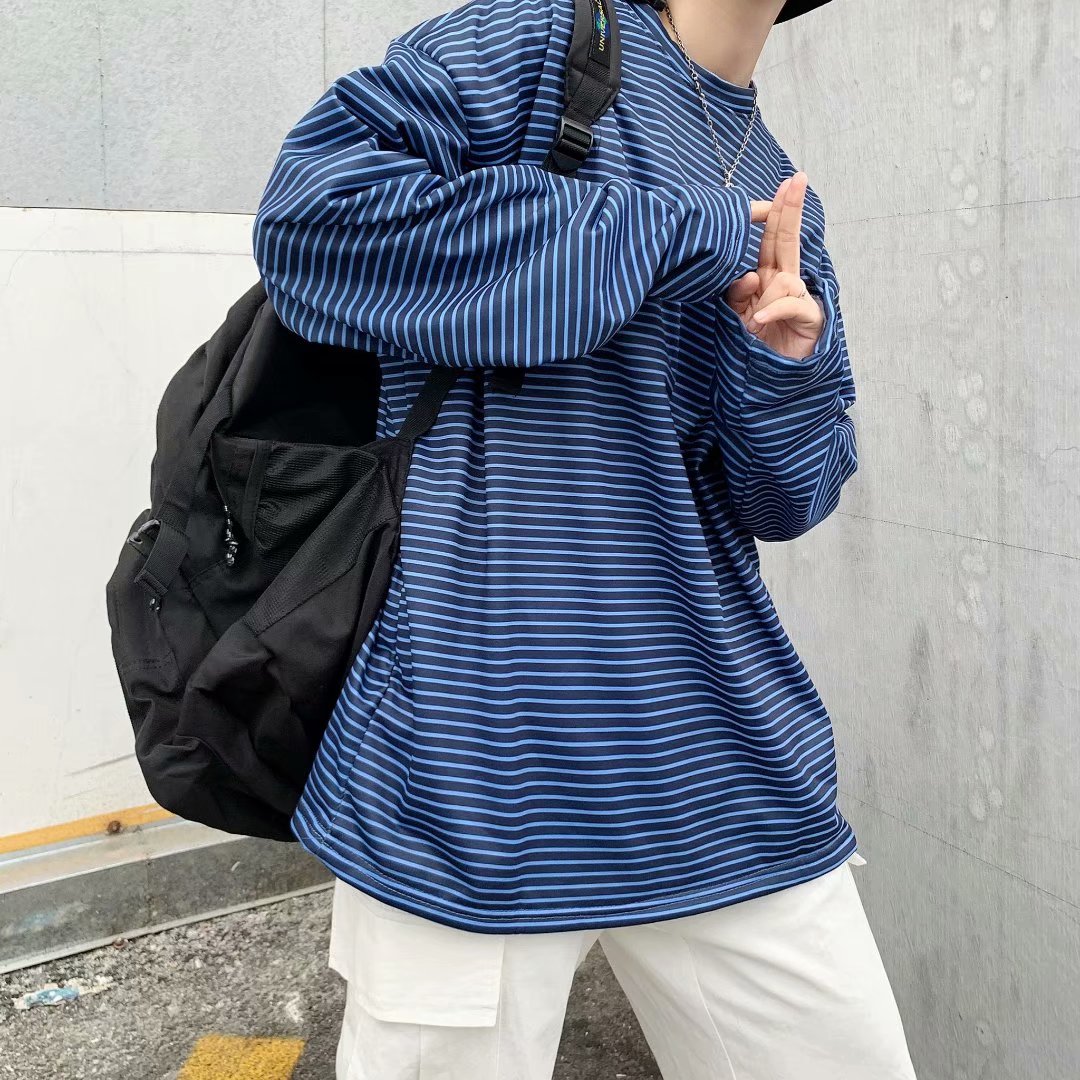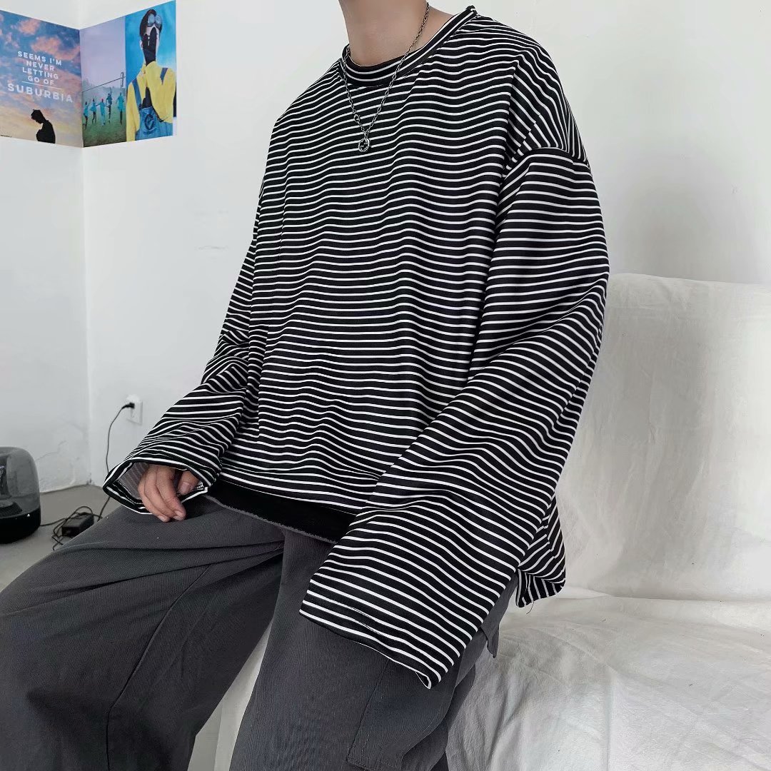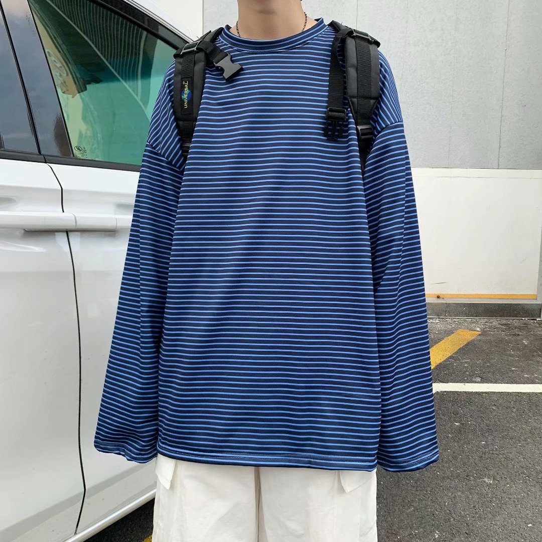 实拍 港风日系简约街头条纹宽松圆领上衣男韩版百搭长袖休闲上衣