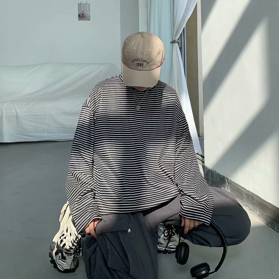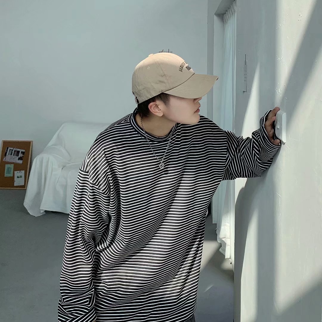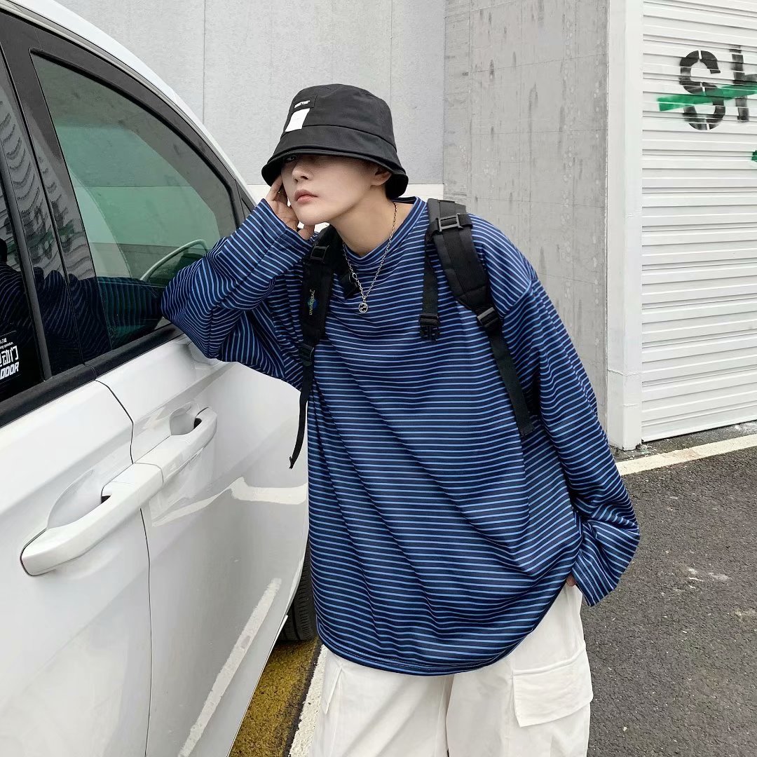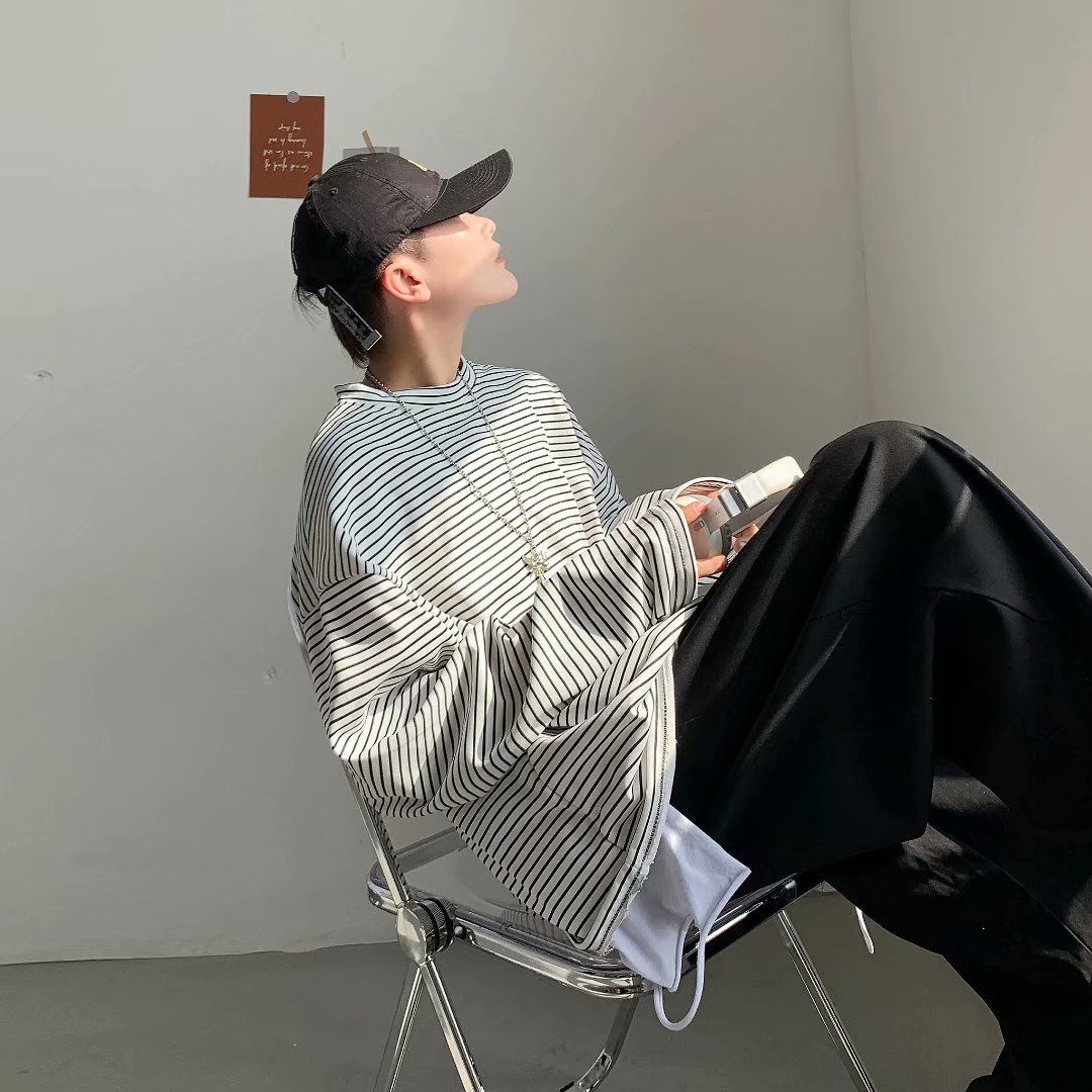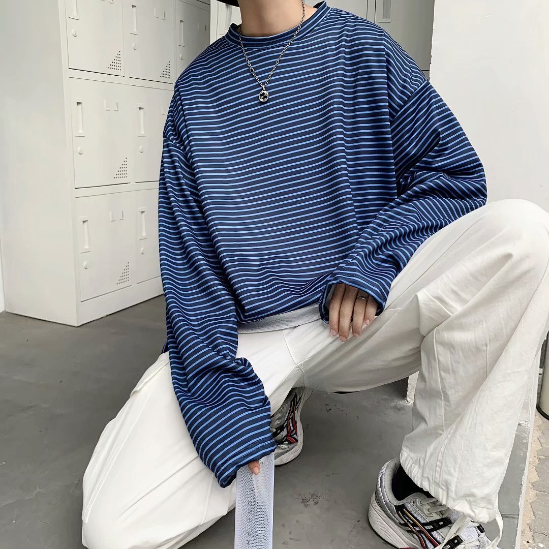 实拍 港风日系简约街头条纹宽松圆领上衣男韩版百搭长袖休闲上衣