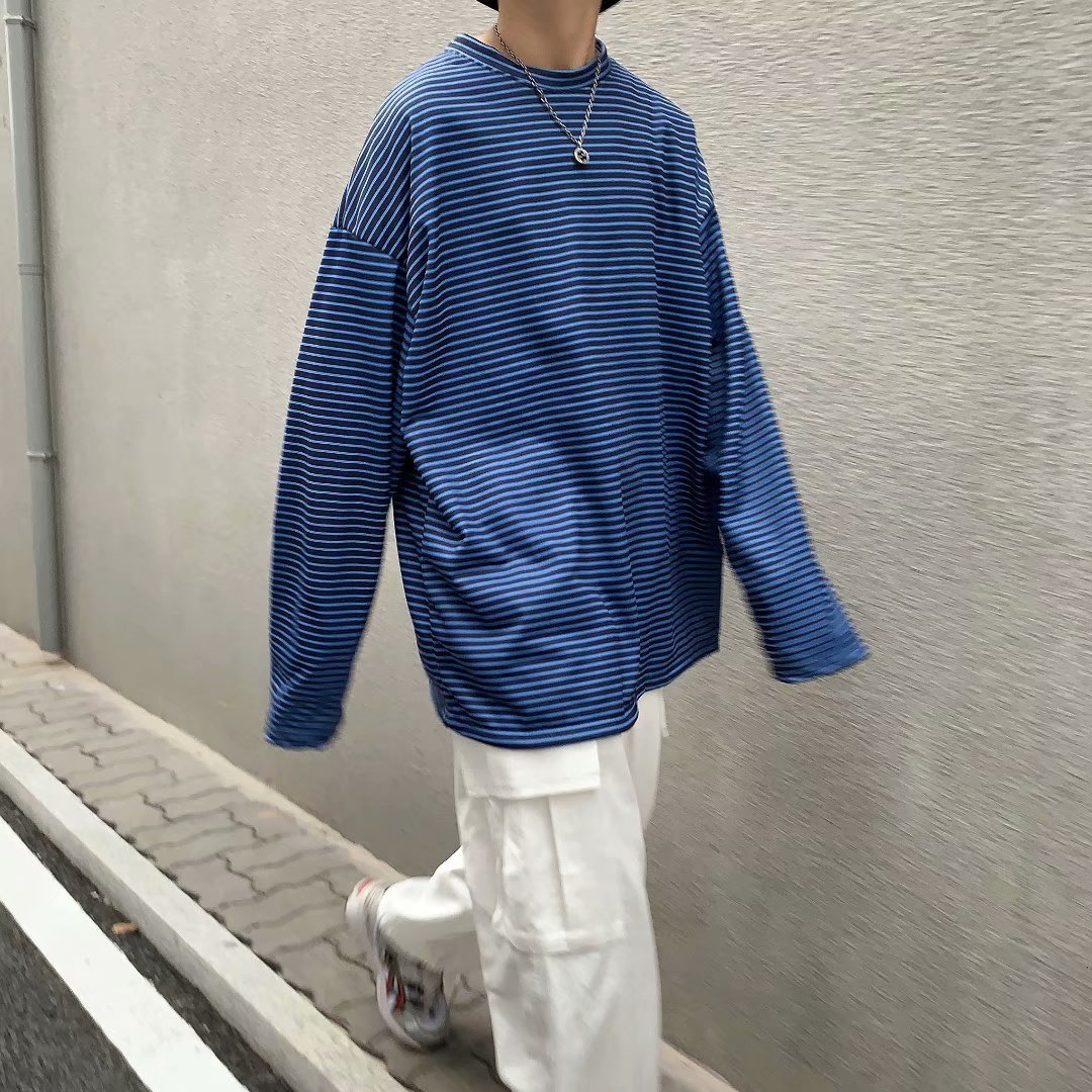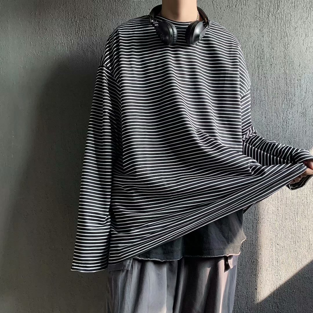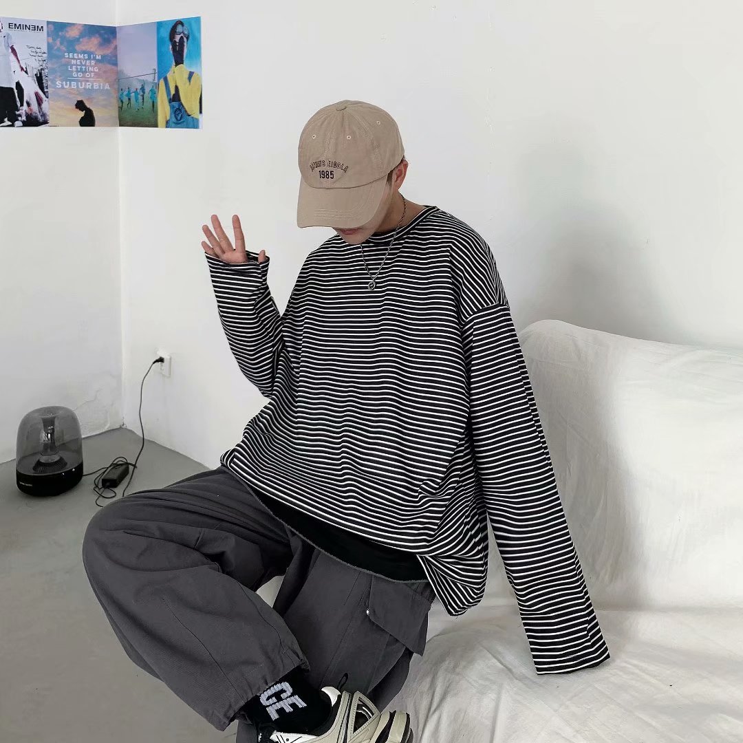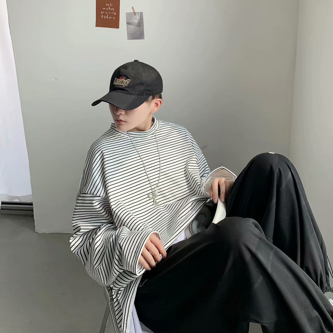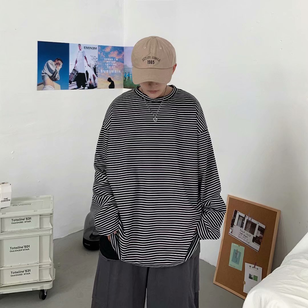 实拍 港风日系简约街头条纹宽松圆领上衣男韩版百搭长袖休闲上衣