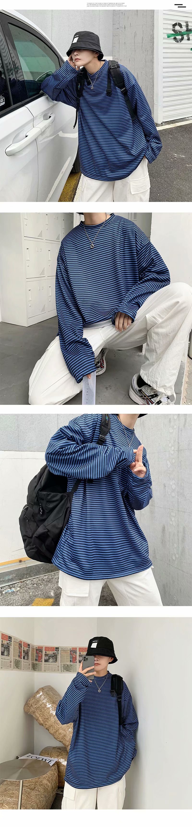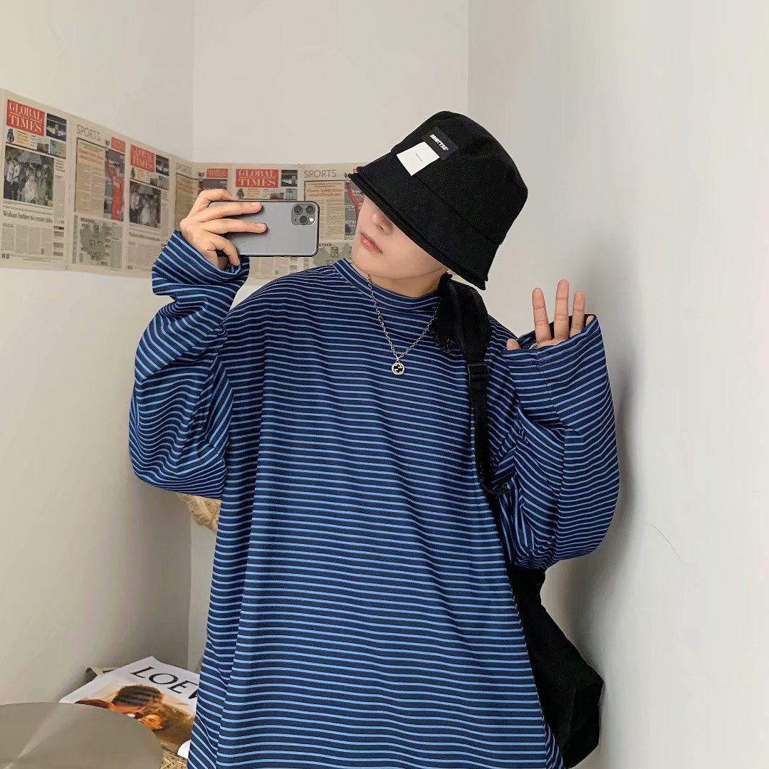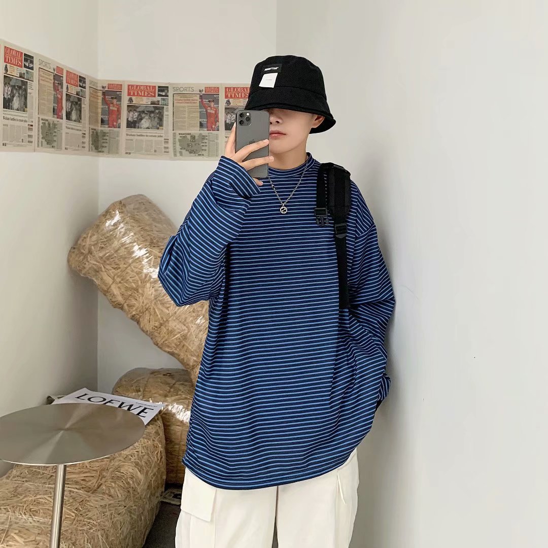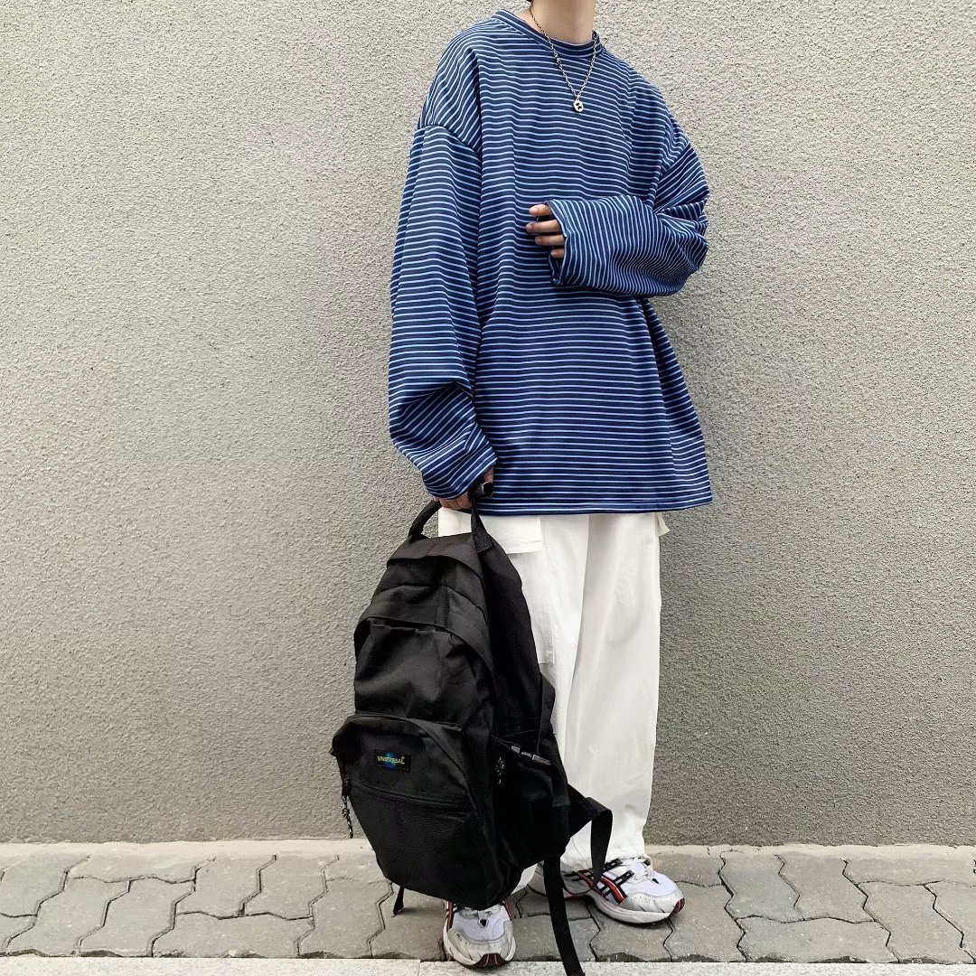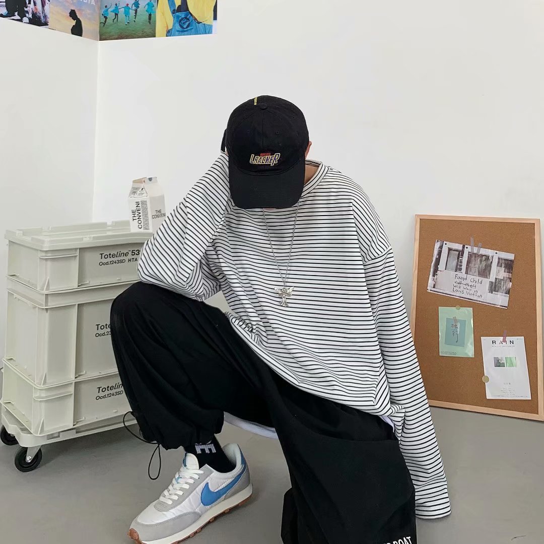实拍 港风日系简约街头条纹宽松圆领上衣男韩版百搭长袖休闲上衣