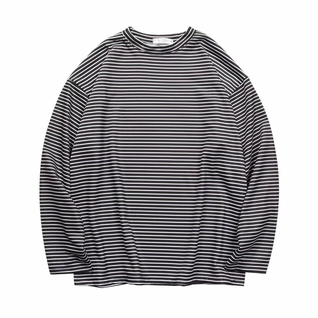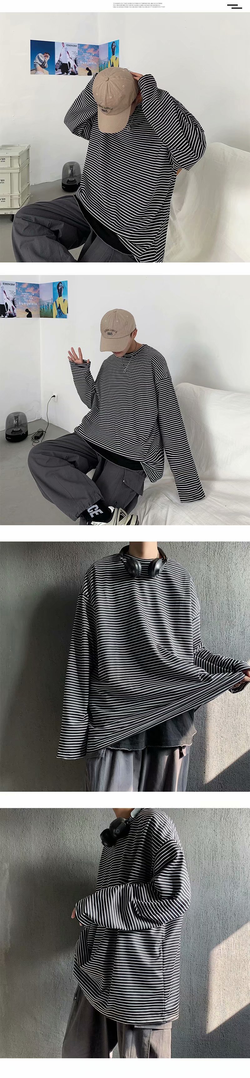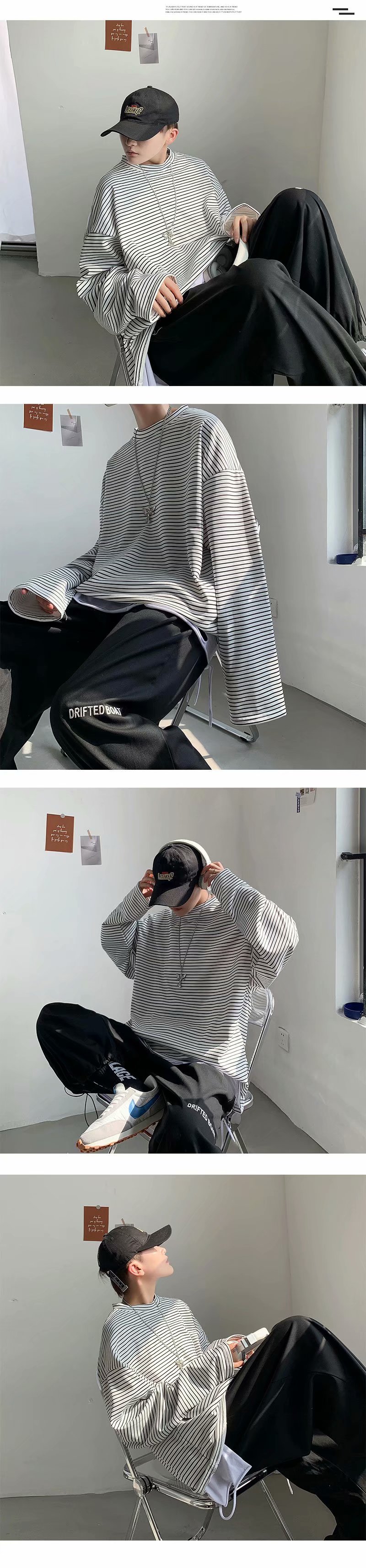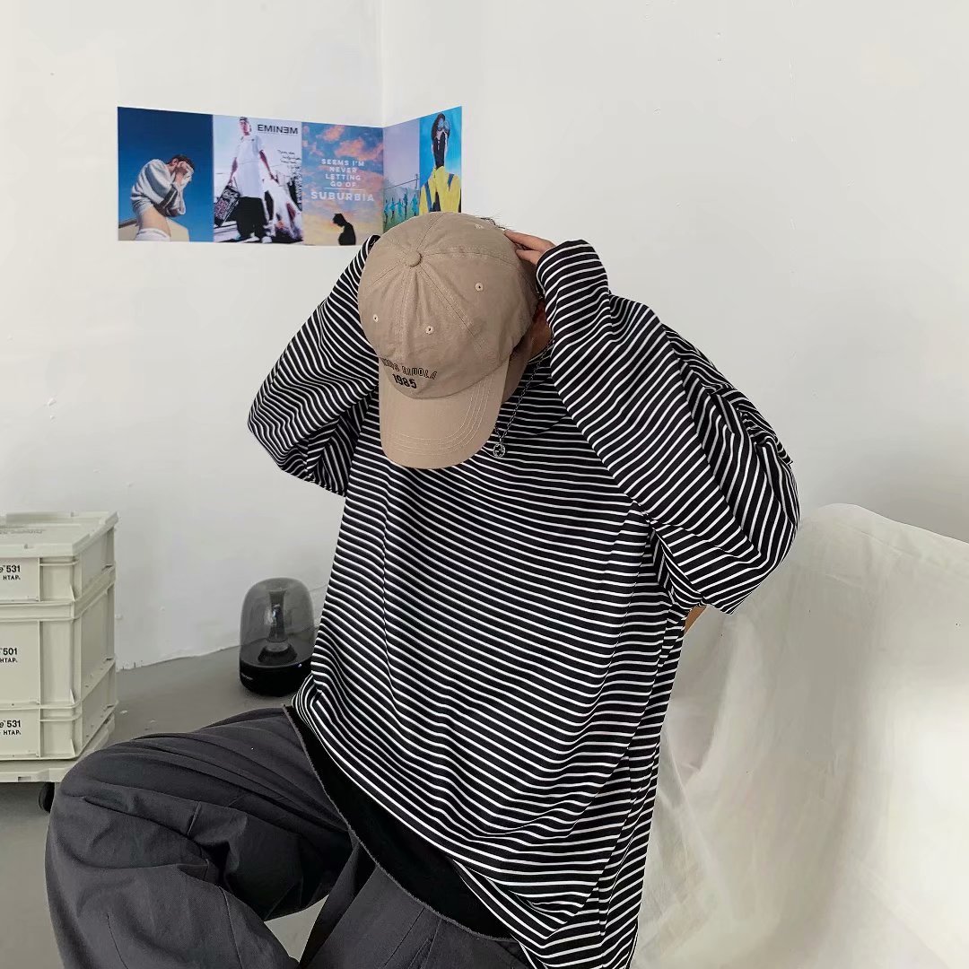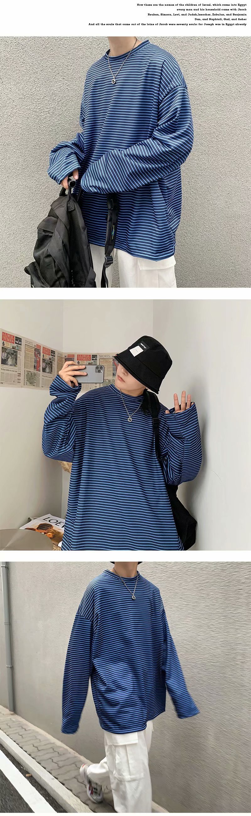 实拍 港风日系简约街头条纹宽松圆领上衣男韩版百搭长袖休闲上衣