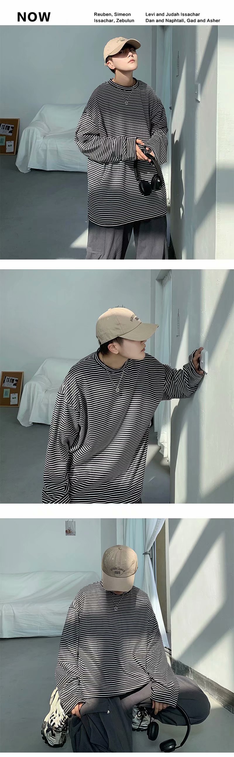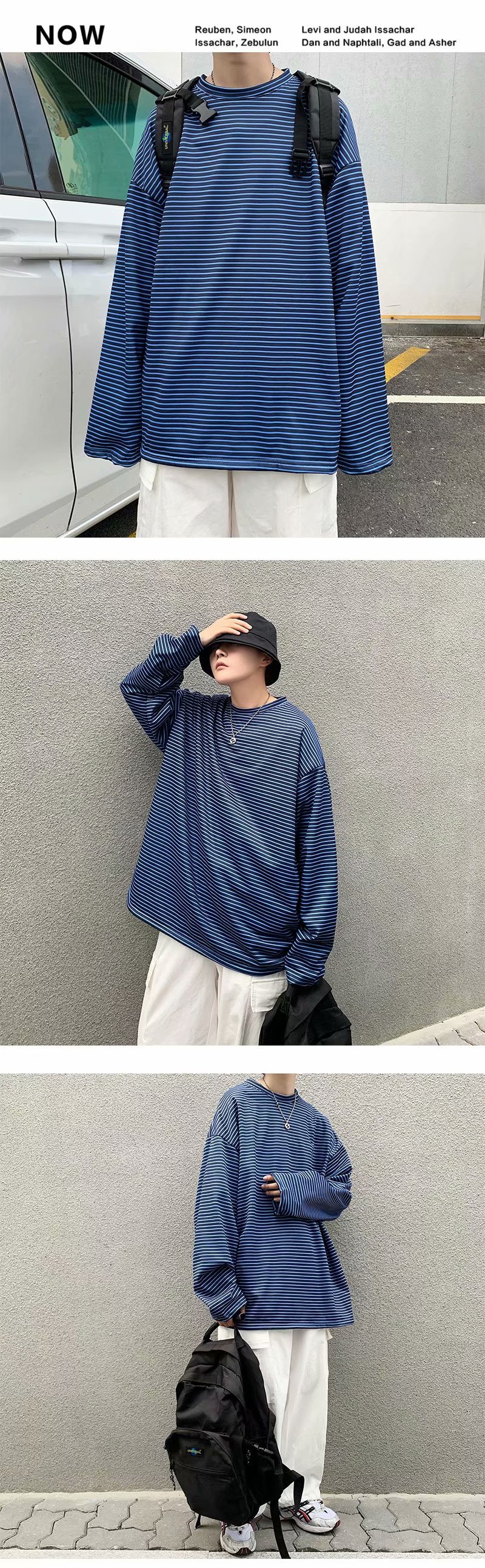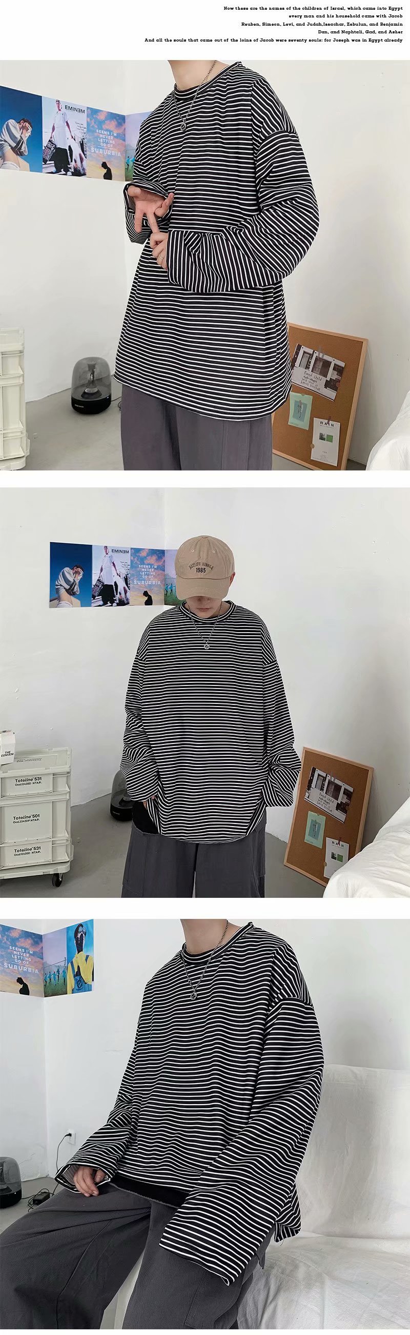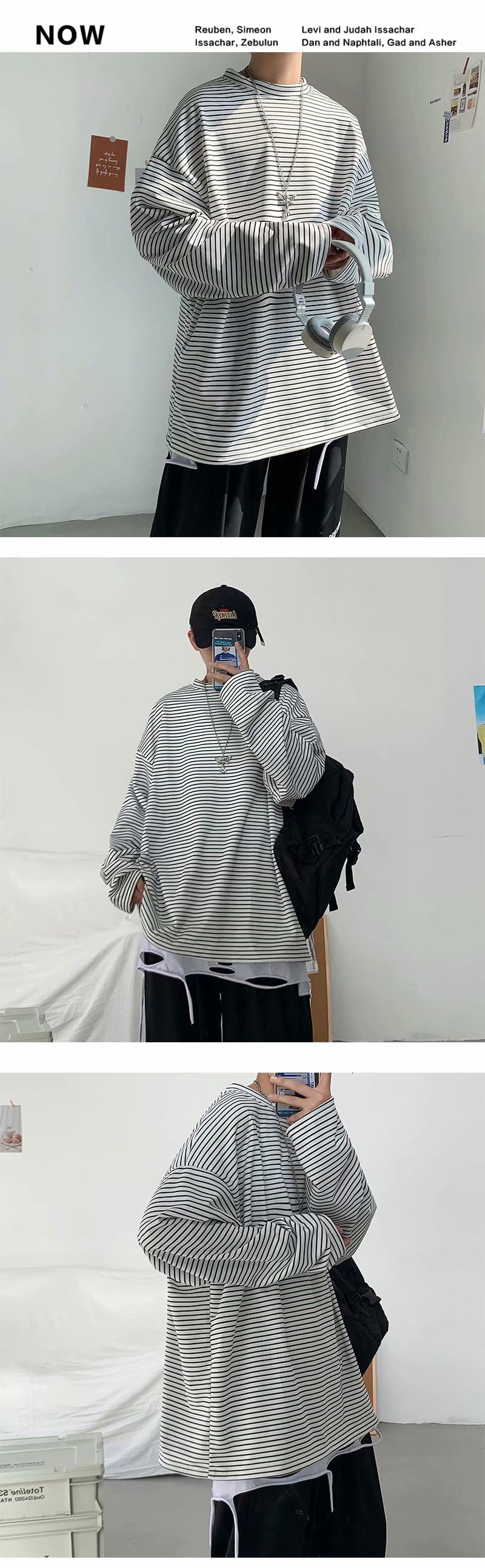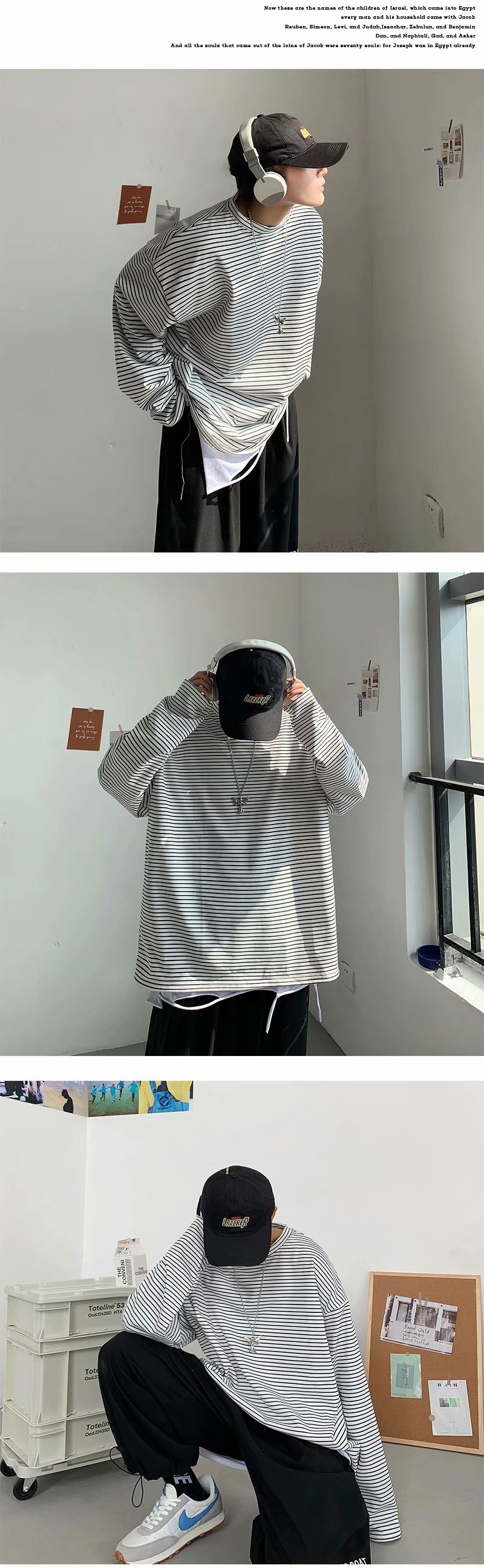 实拍 港风日系简约街头条纹宽松圆领上衣男韩版百搭长袖休闲上衣