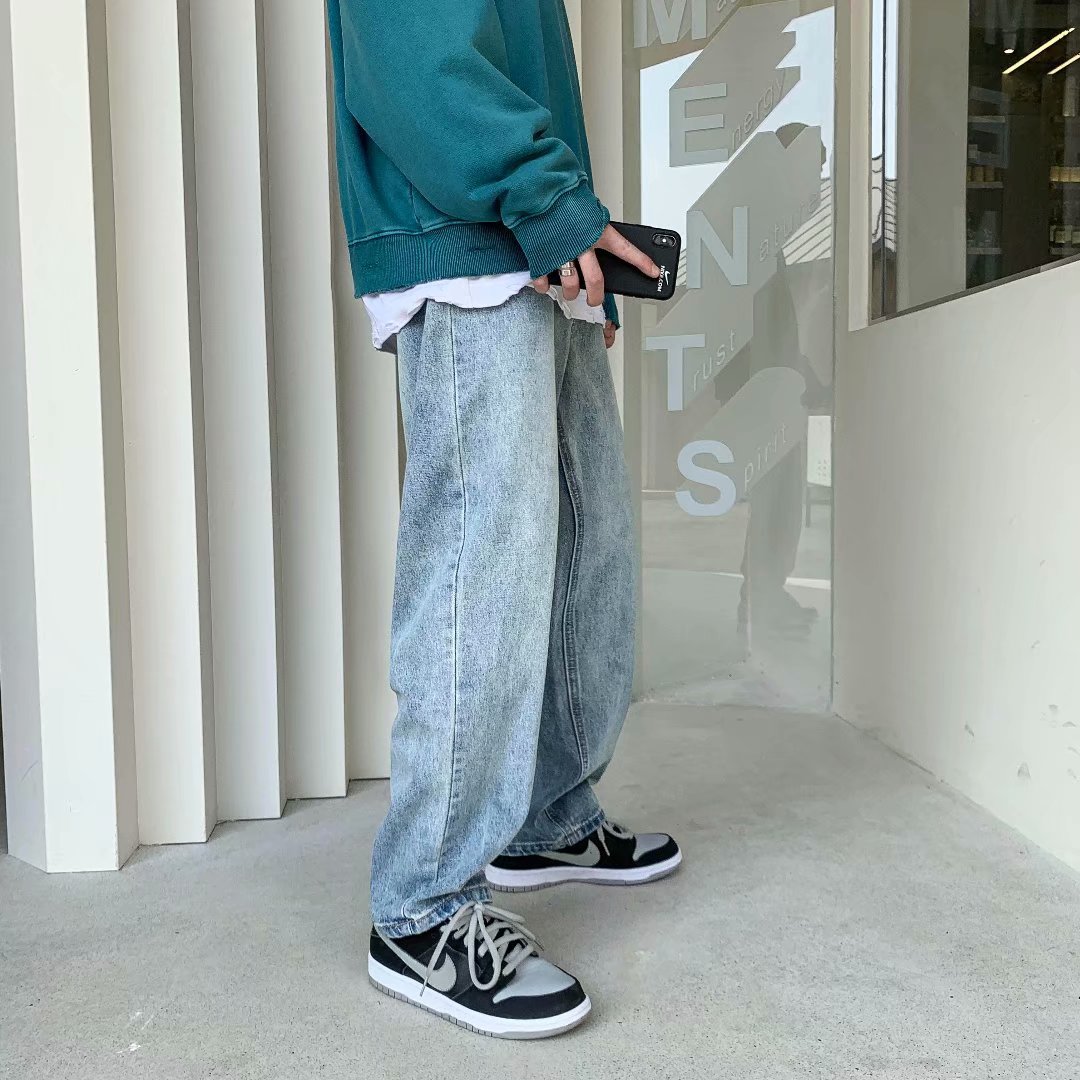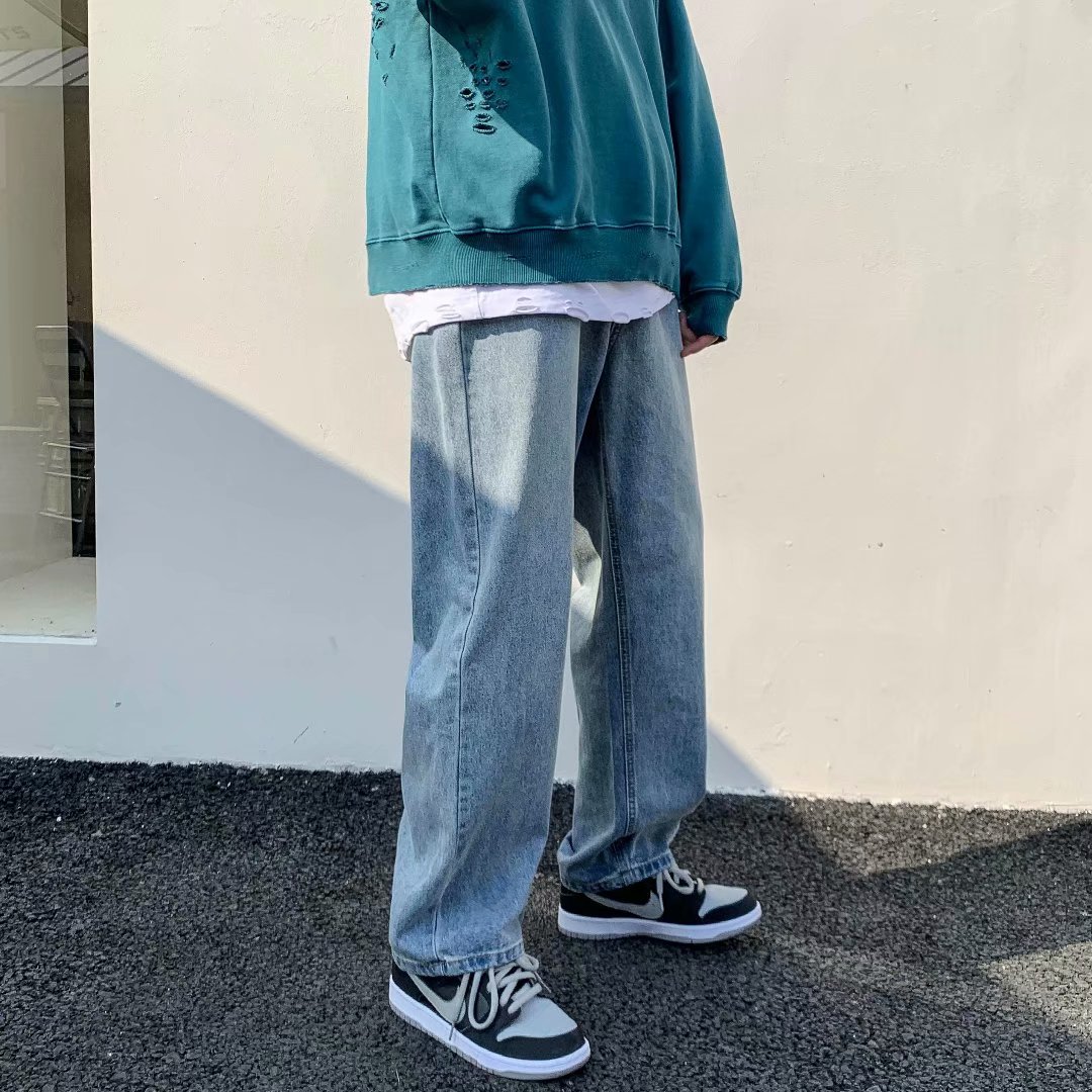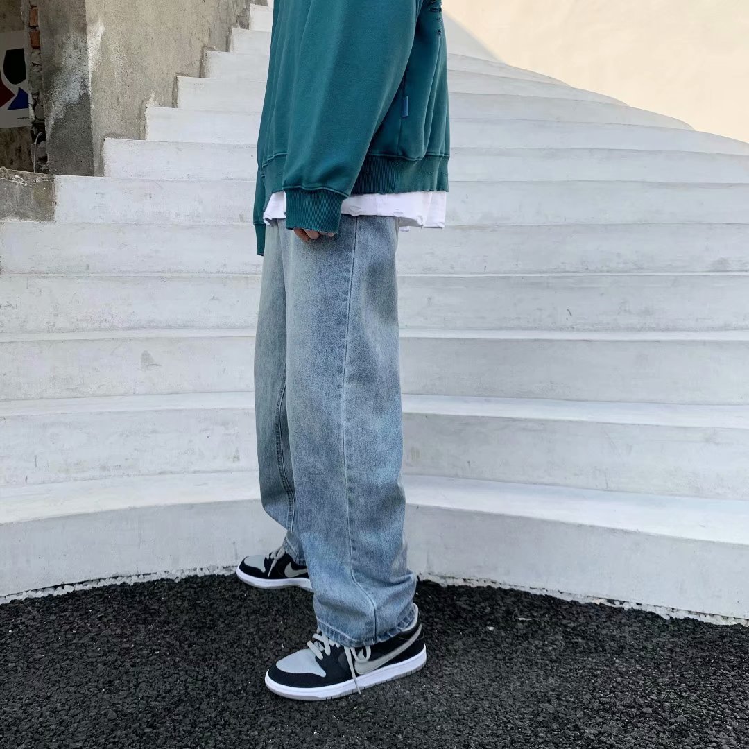 实拍坠感阔腿牛仔裤日系潮牌复古宽松直筒休闲长裤韩版潮流男装裤