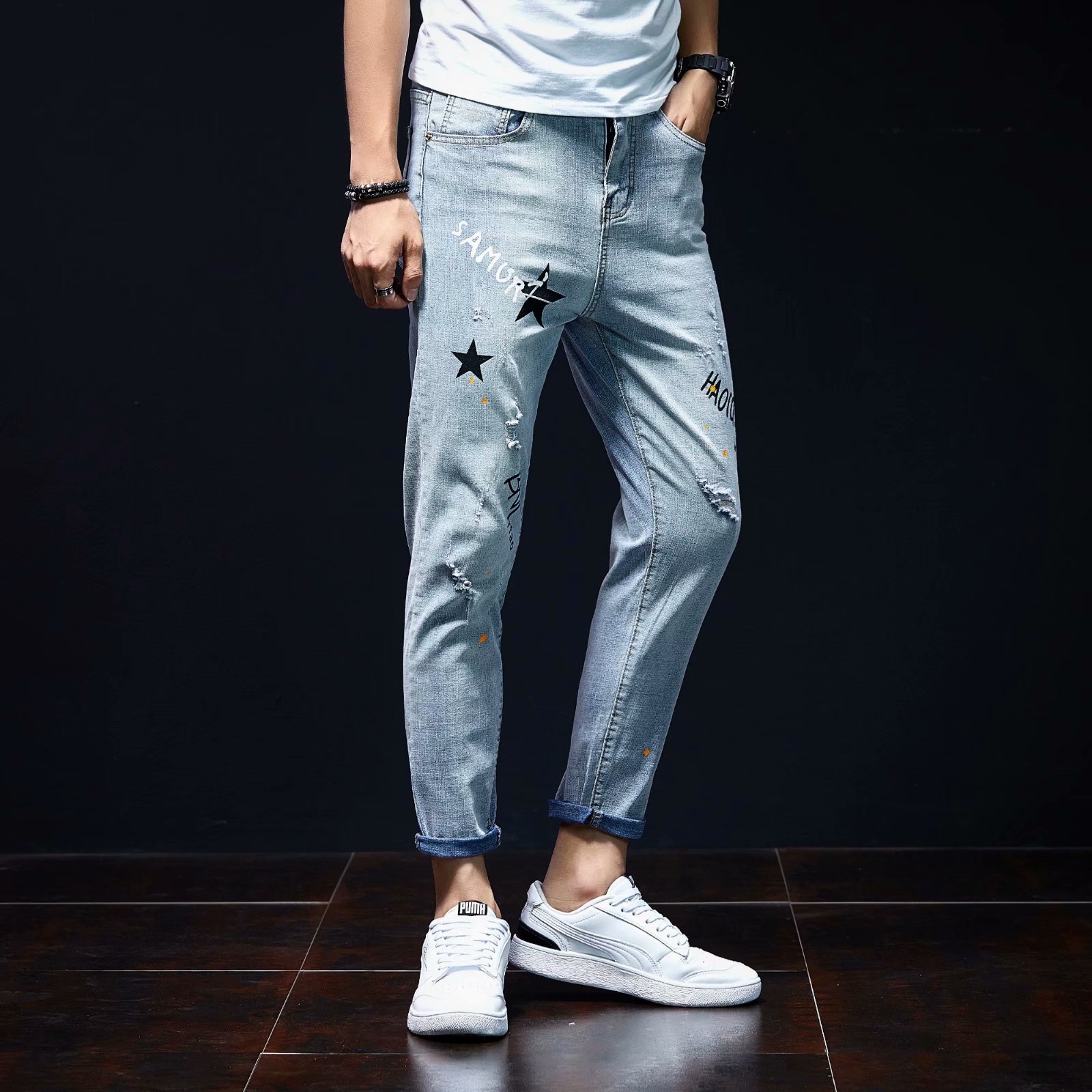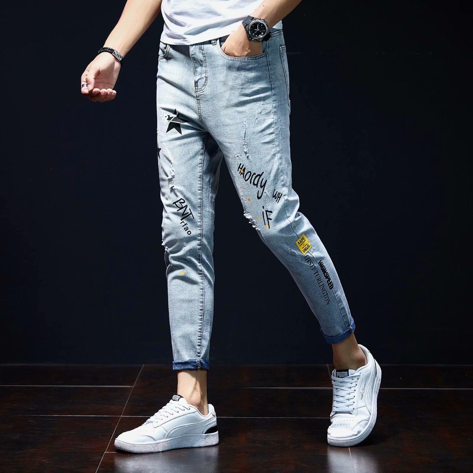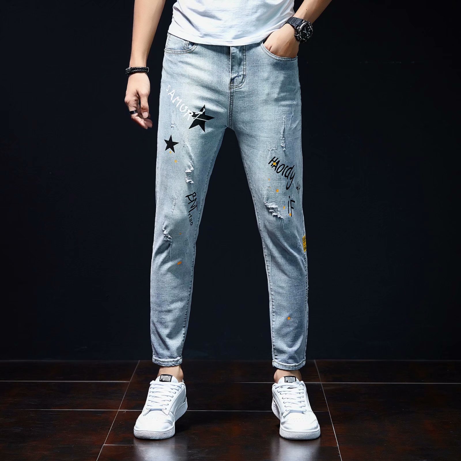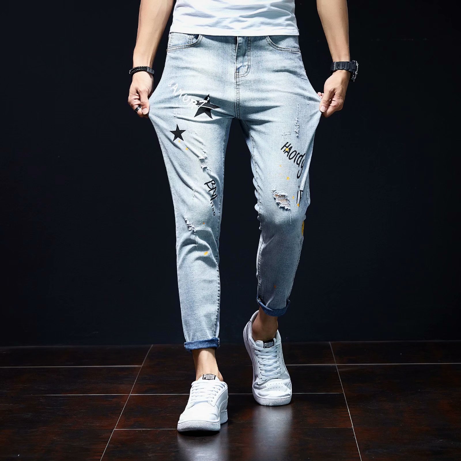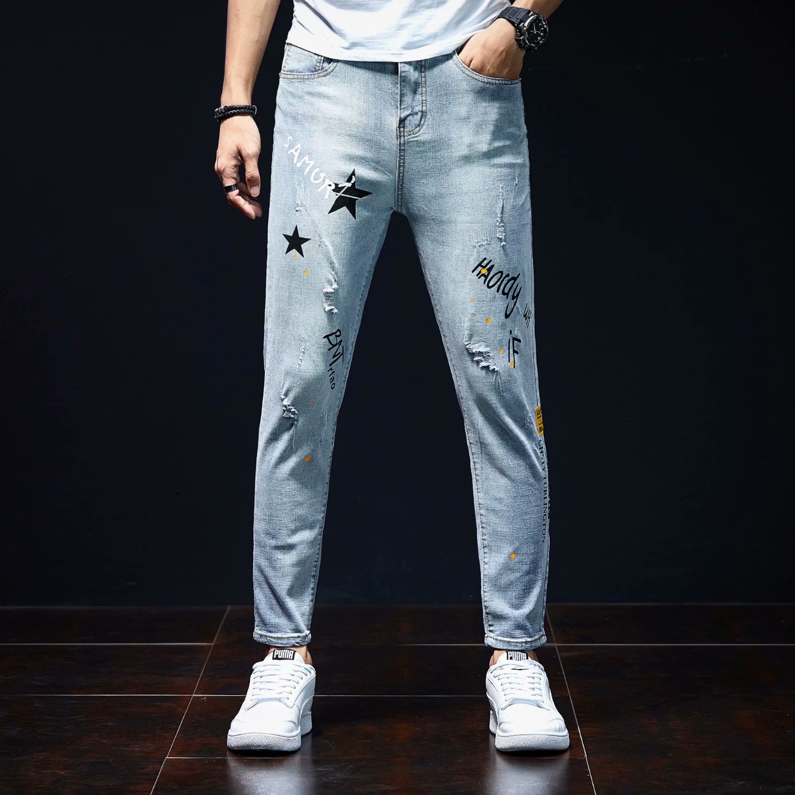 实拍裤男夏天薄款潮牌弹力修身韩版潮流九分裤破洞休闲浅色小脚裤