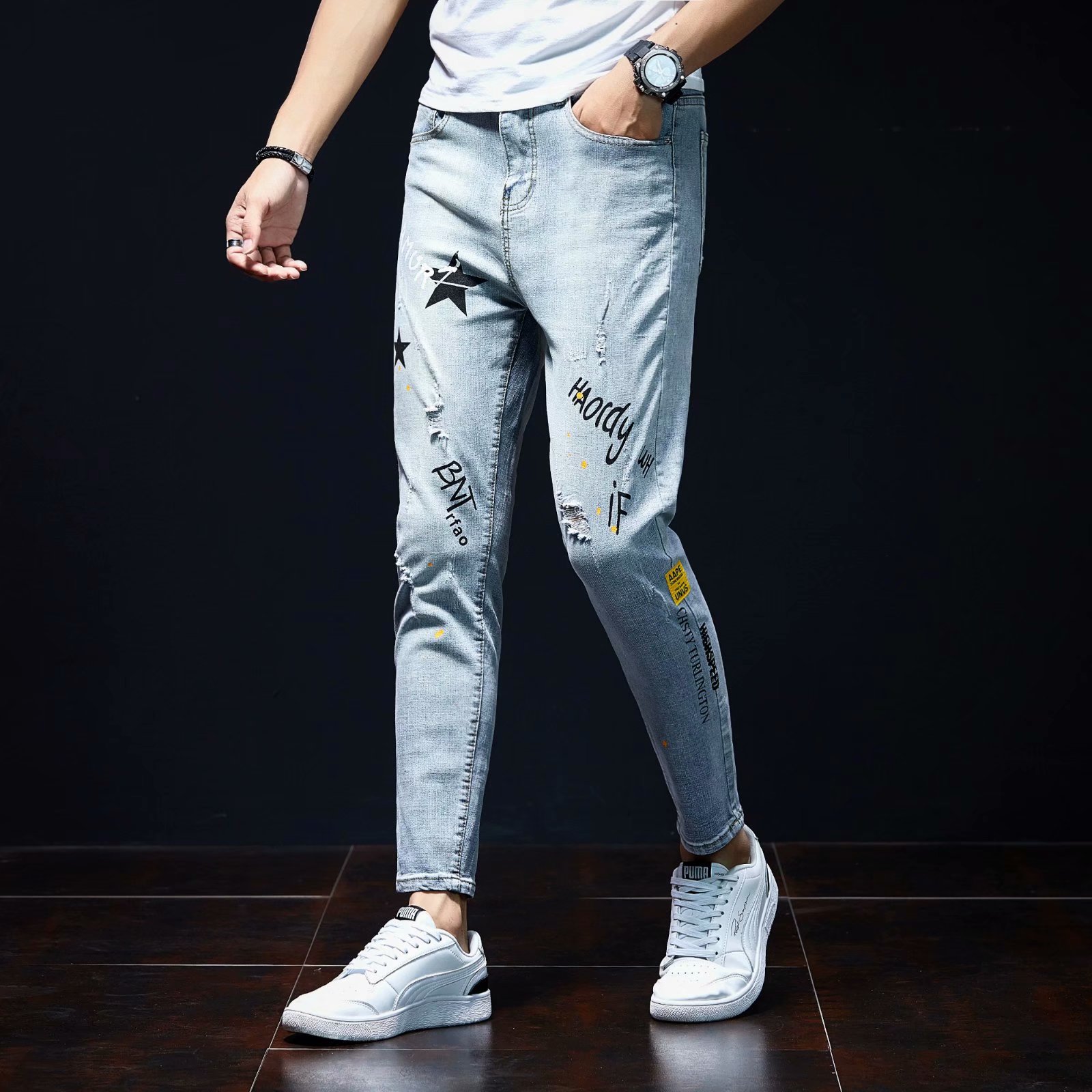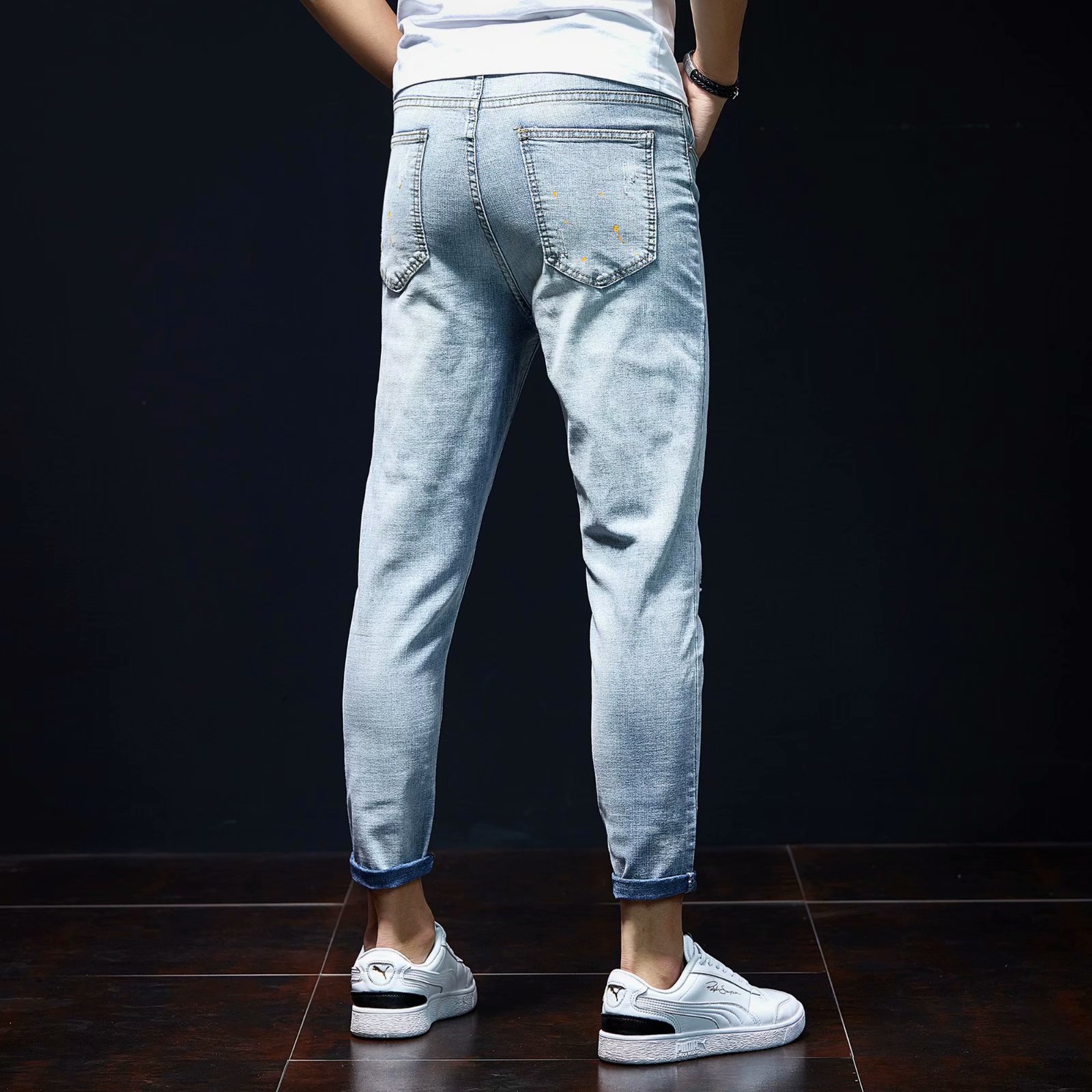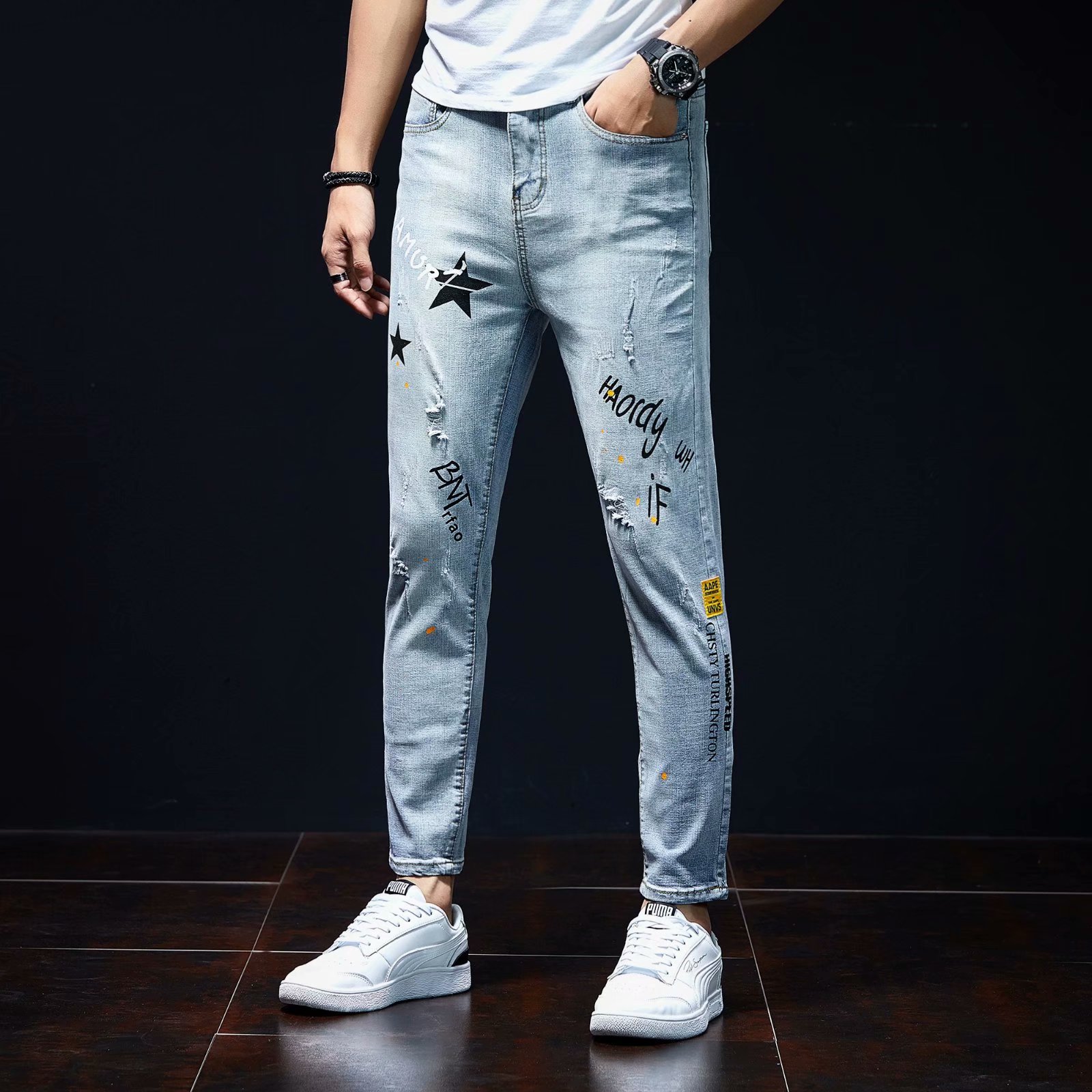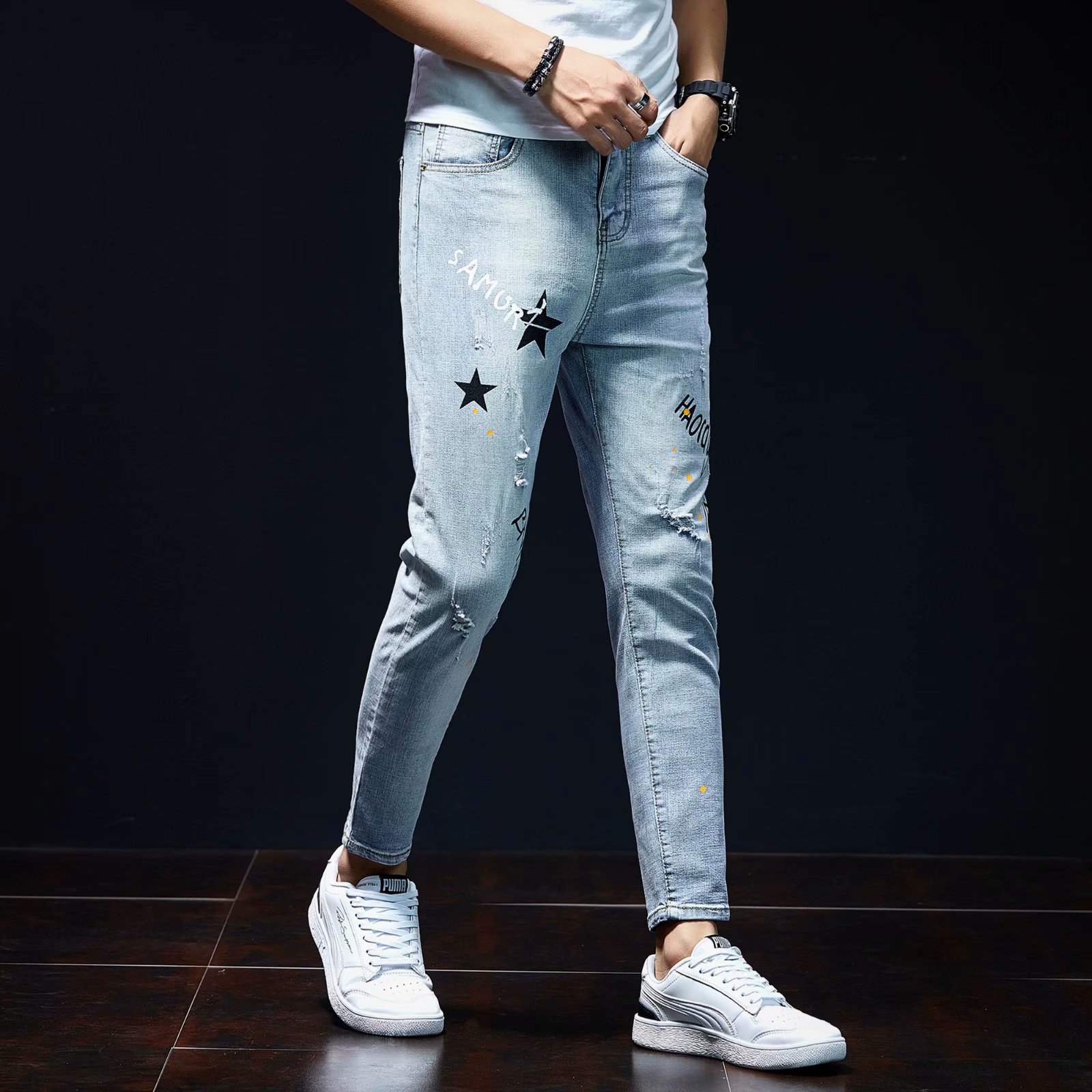 实拍裤男夏天薄款潮牌弹力修身韩版潮流九分裤破洞休闲浅色小脚裤